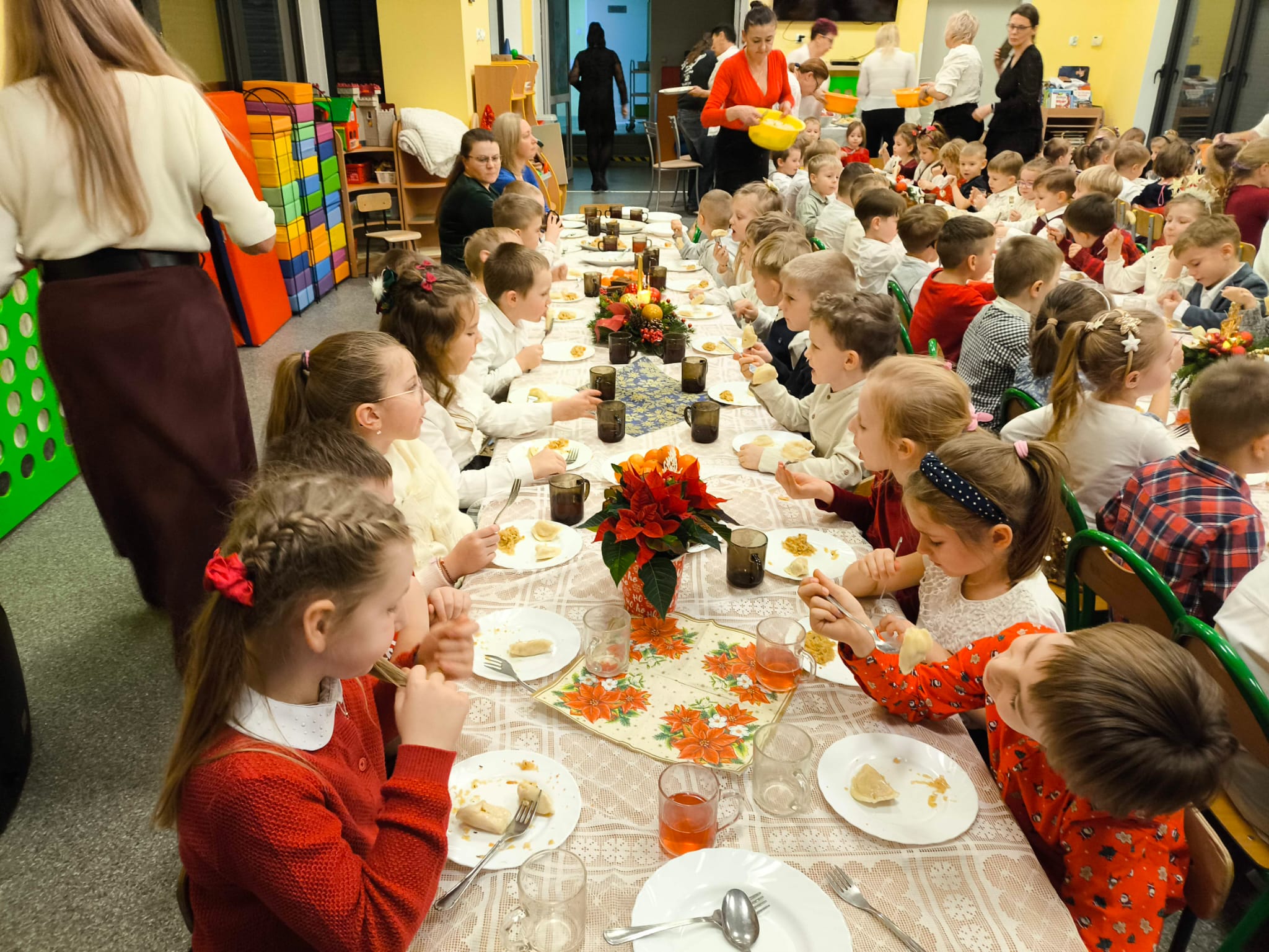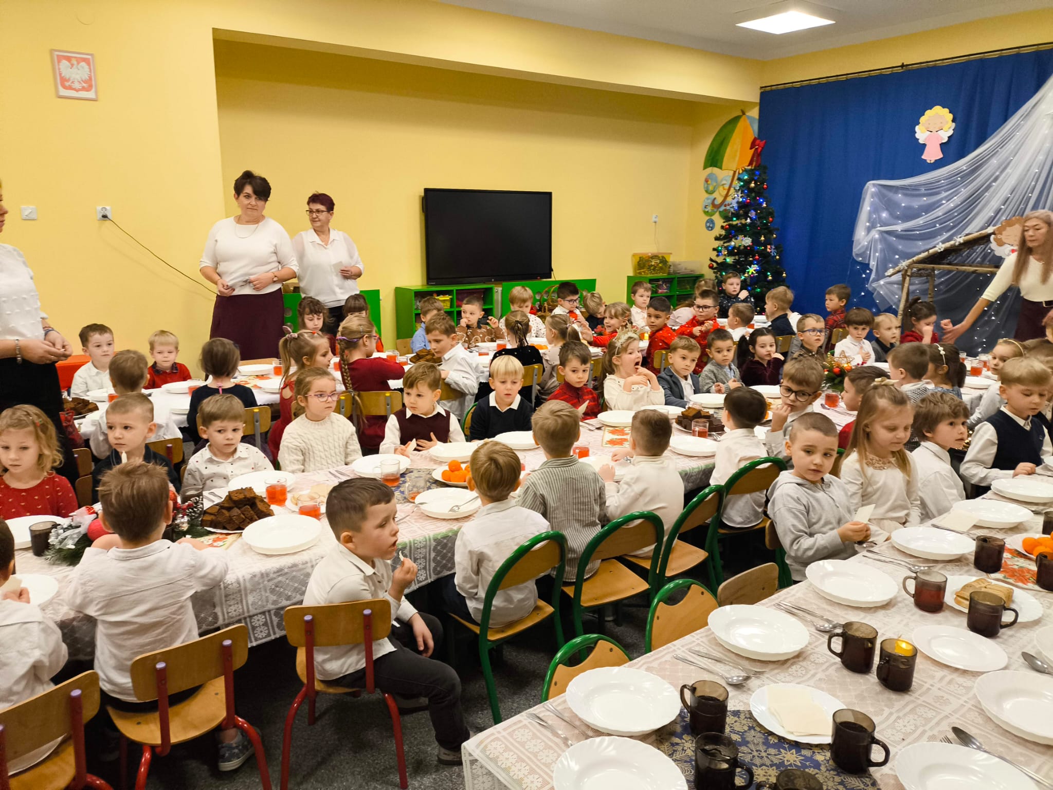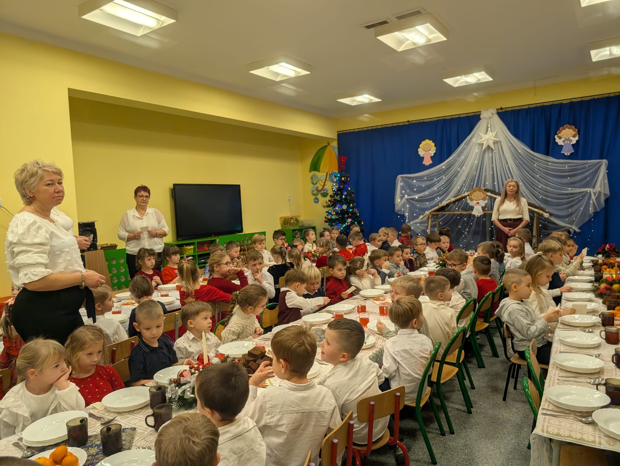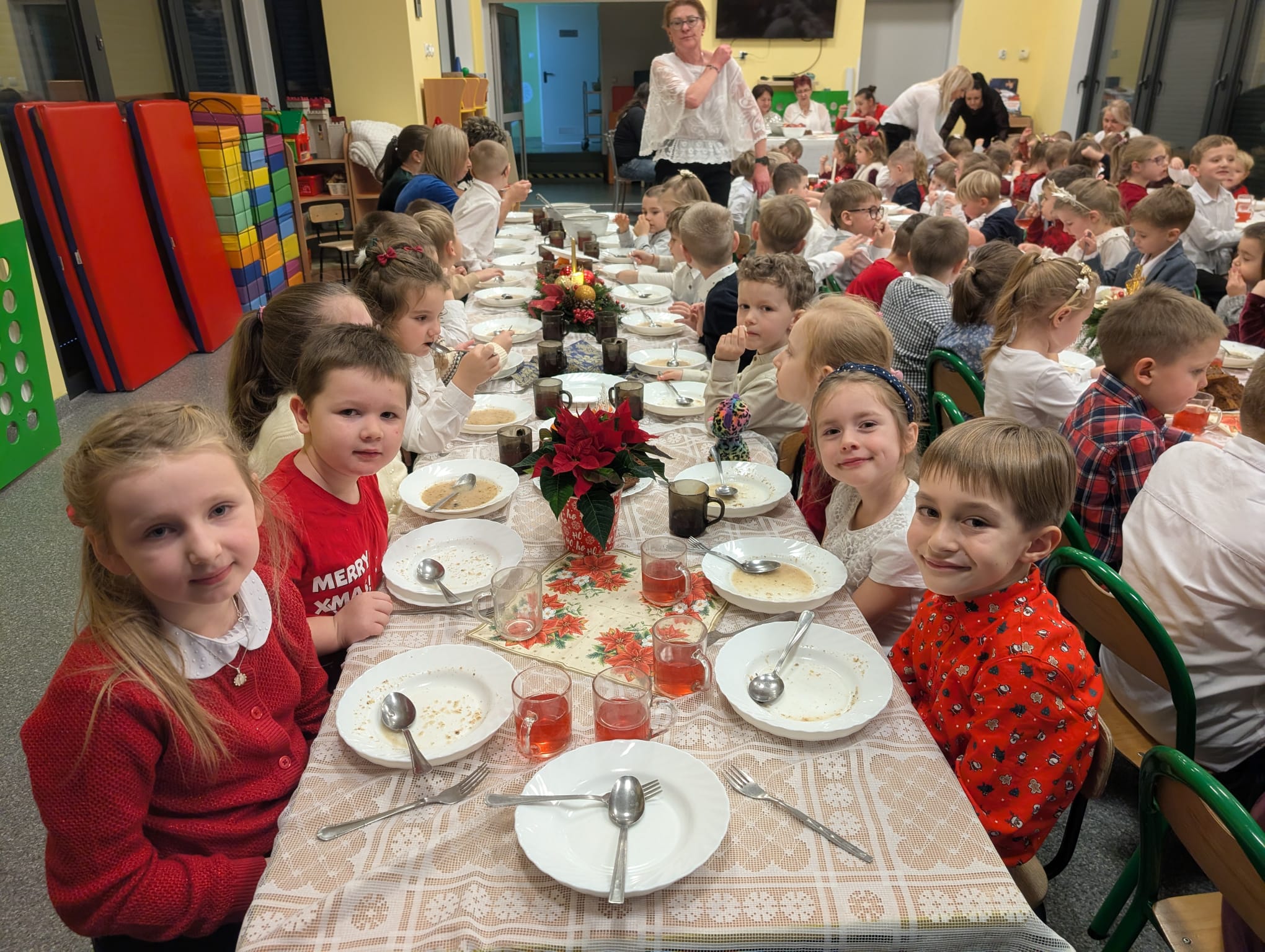 W naszym przedszkolu zapanowała wyjątkowa, świąteczna atmosfera. Jak co roku spotkaliśmy się wszyscy — dzieci, nauczyciele, pracownicy, aby wspólnie przeżyć Wigilię Przedszkolną, która stała się jedną z najpiękniejszych tradycji naszej społeczności.