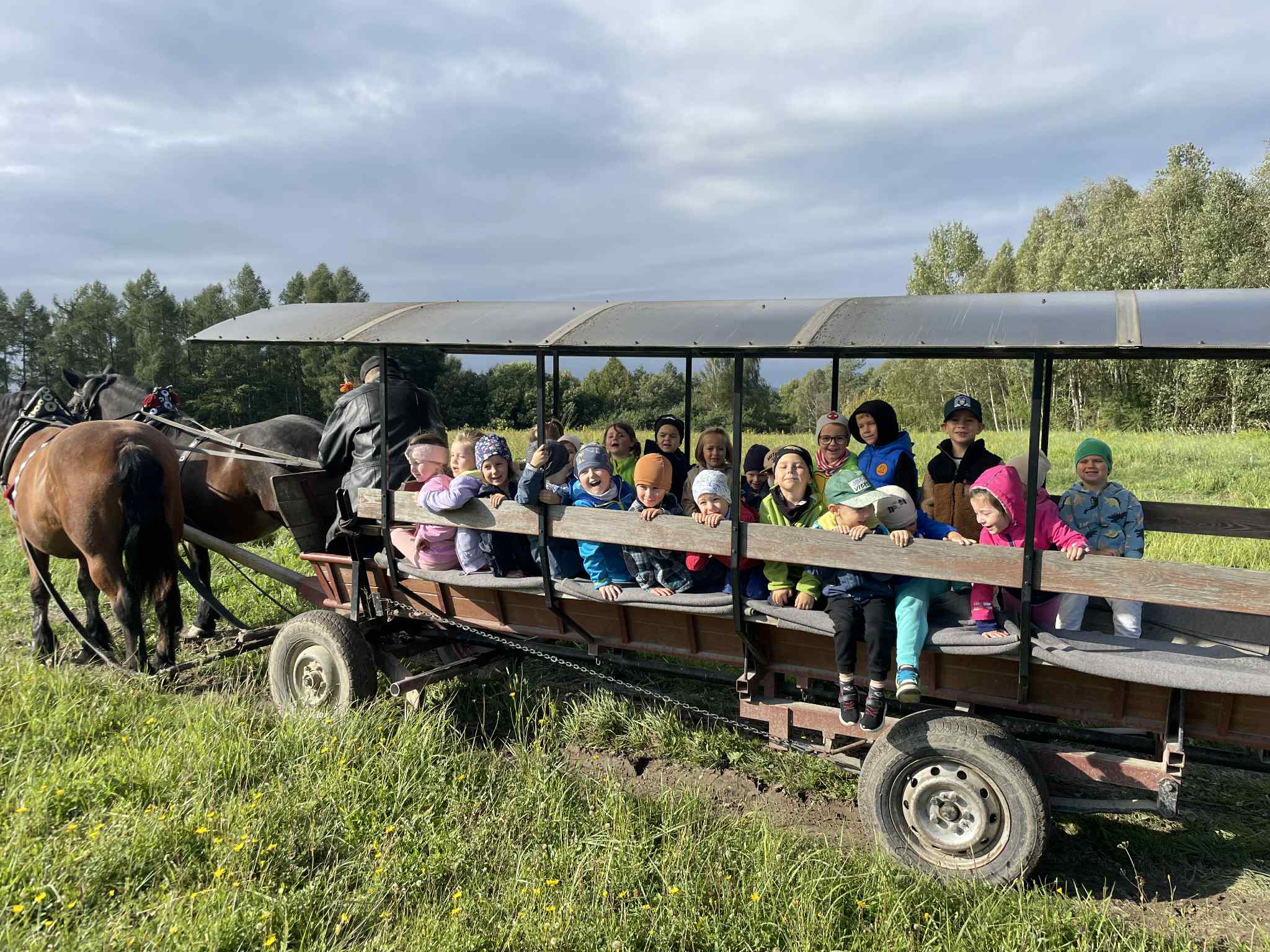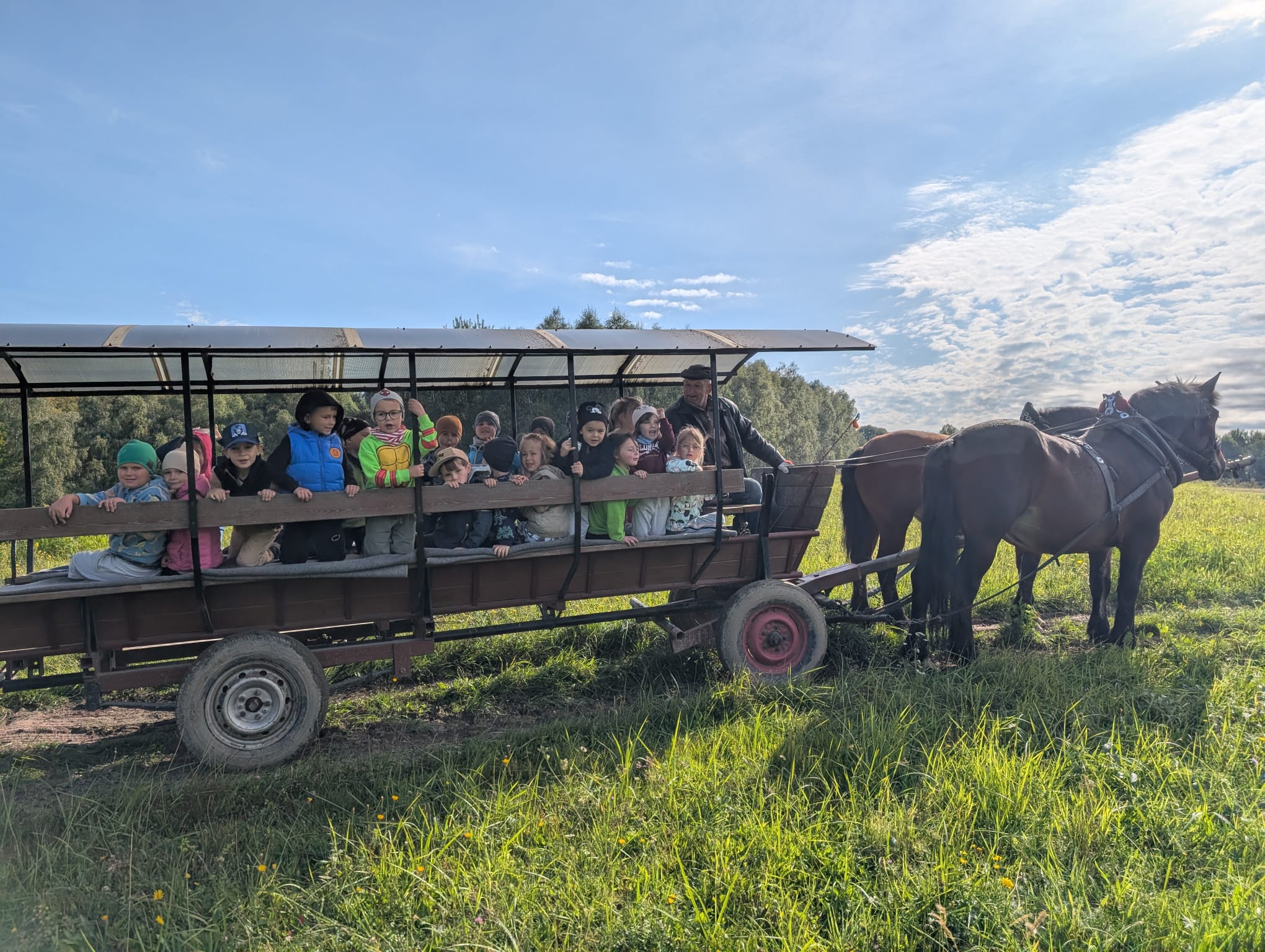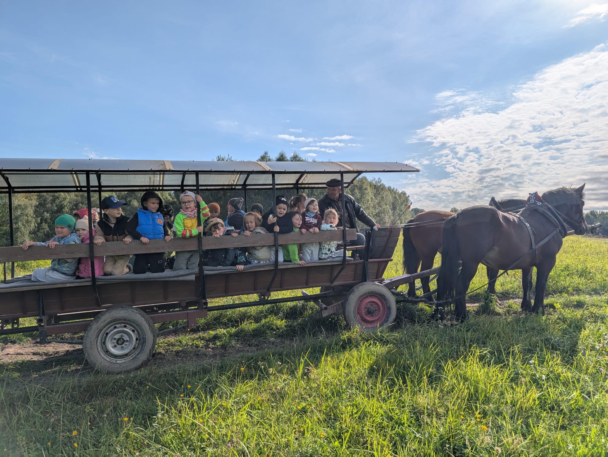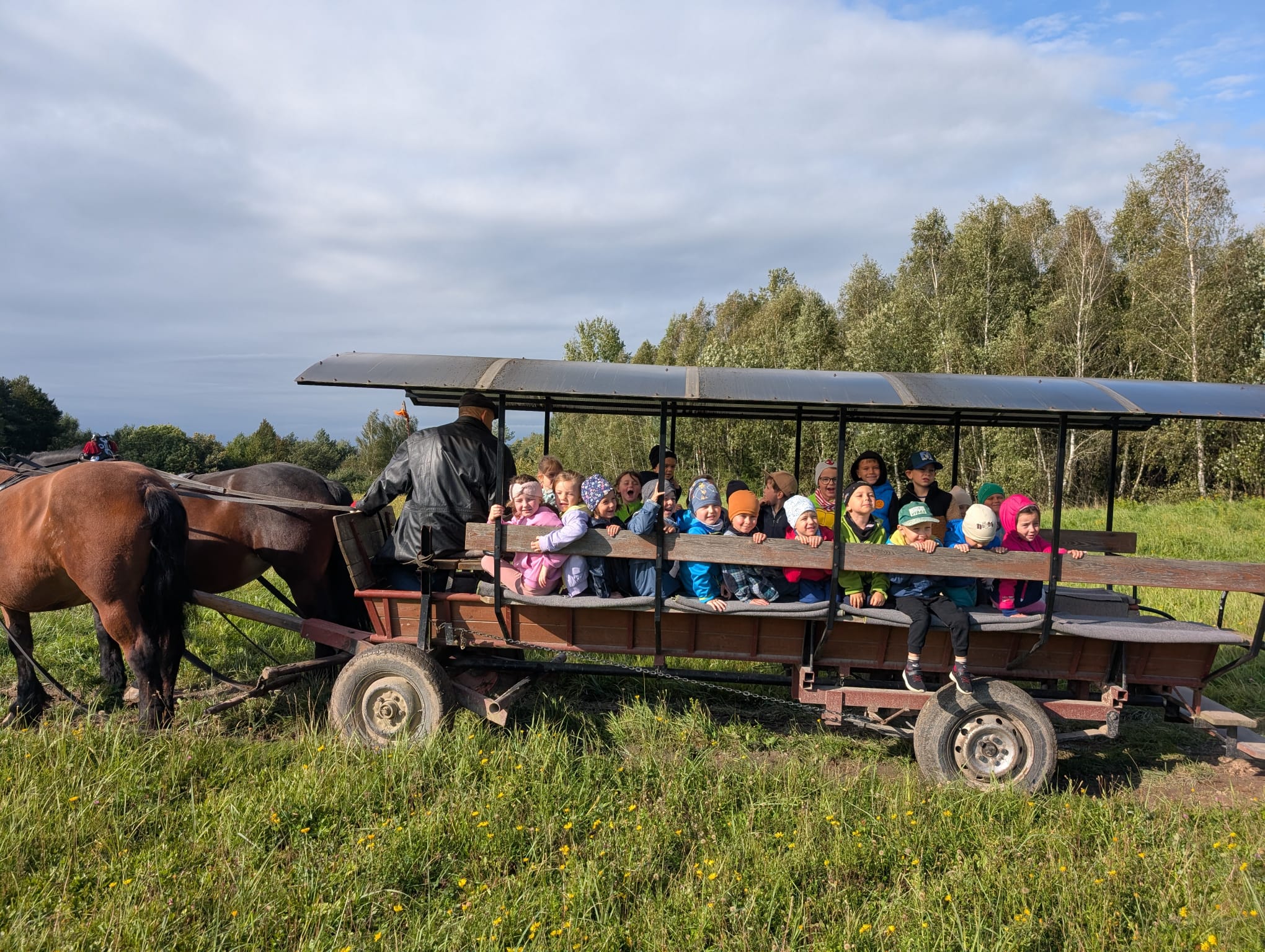 Jednym z najbardziej niezapomnianych momentów była jazda bryczką z Dziadziem Stasiem. Widok pięknych pól i łąk, spokojne tempo przejażdżki i dźwięk kopyt końskich sprawiły, że dzieci mogły poczuć wyjątkowy klimat wiejskiego życia.