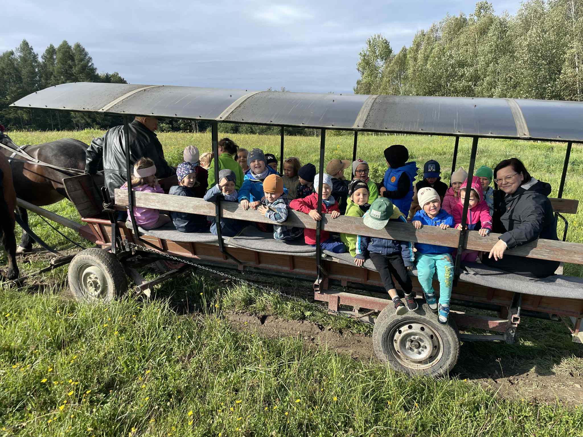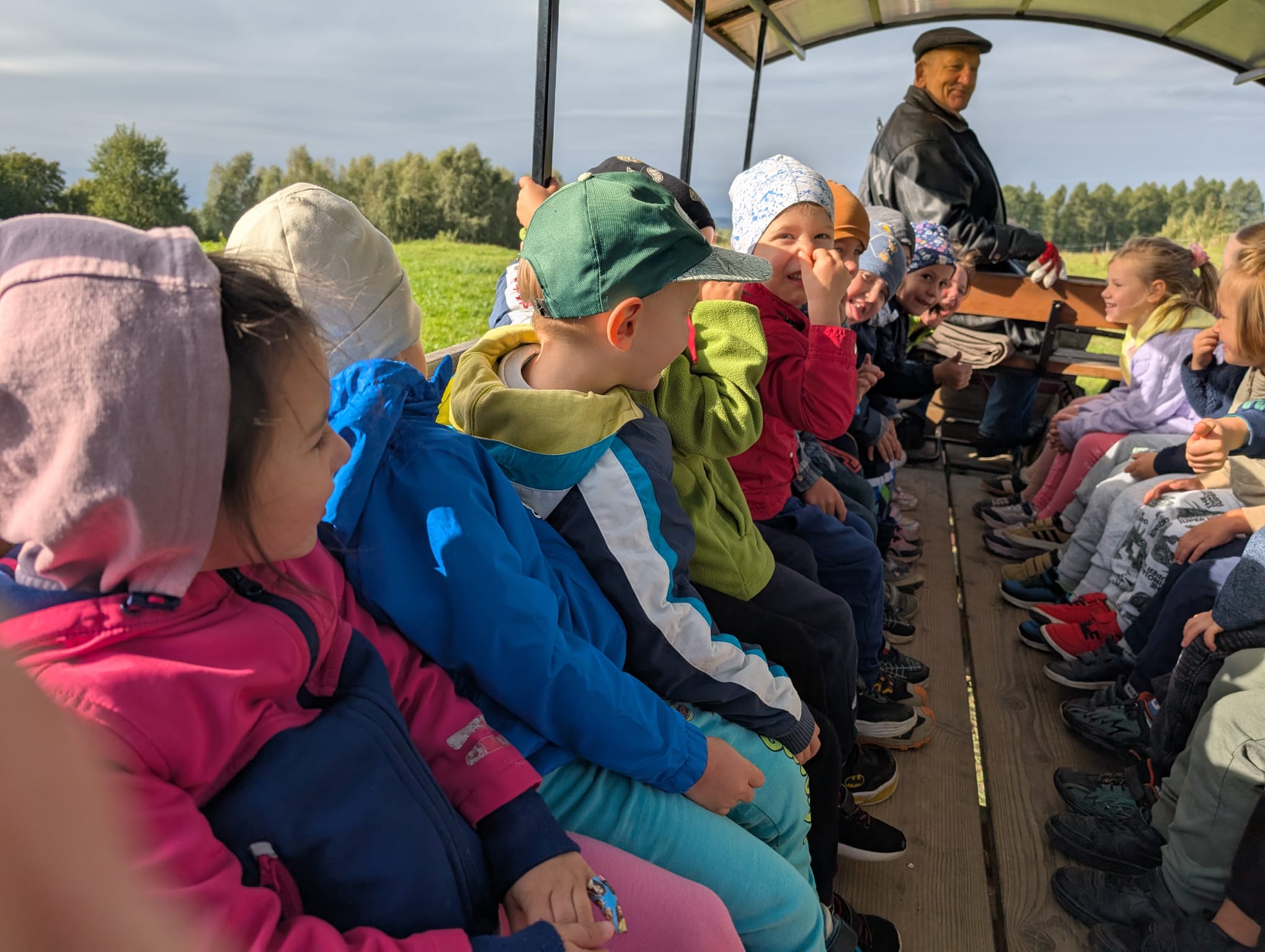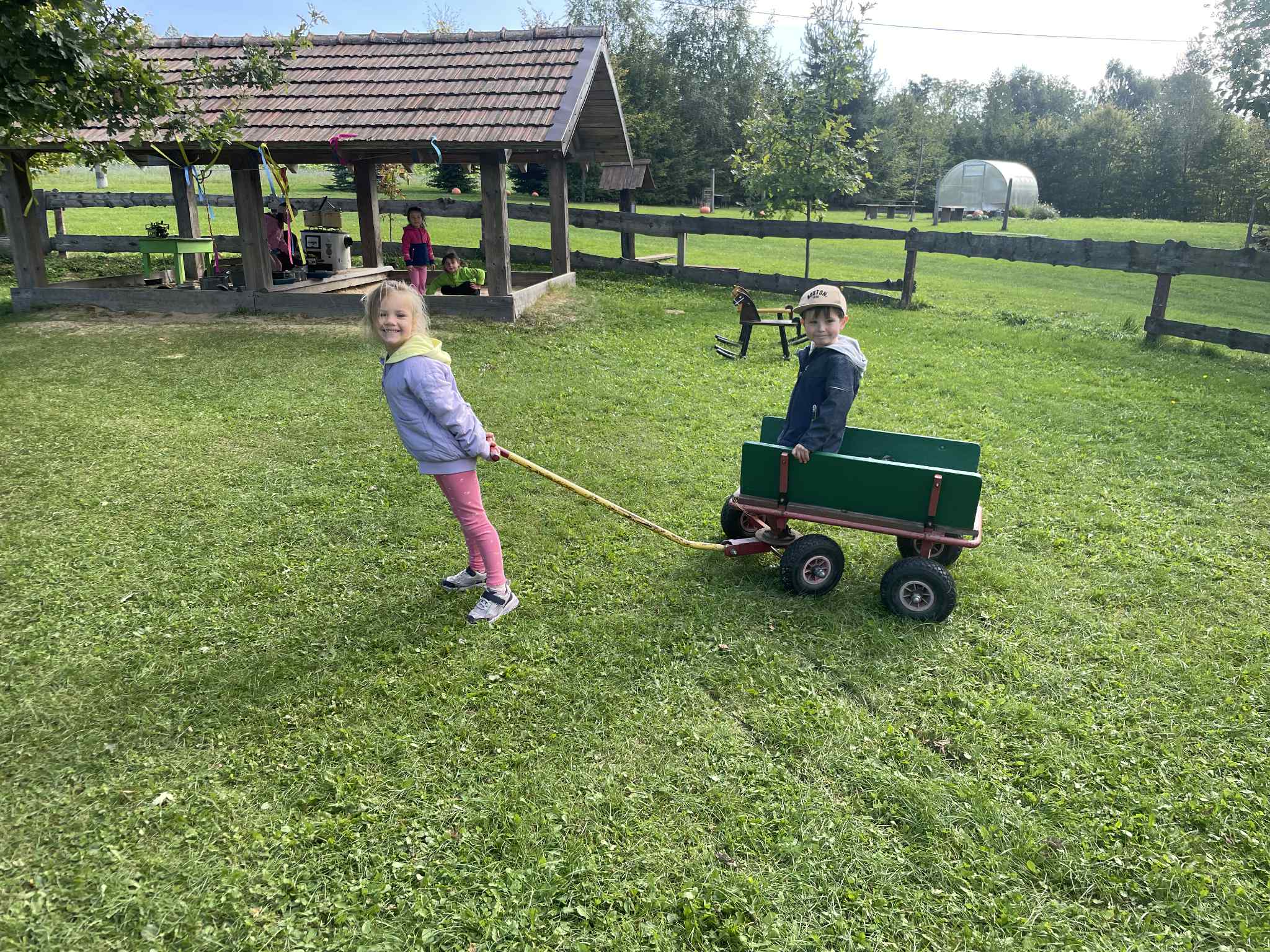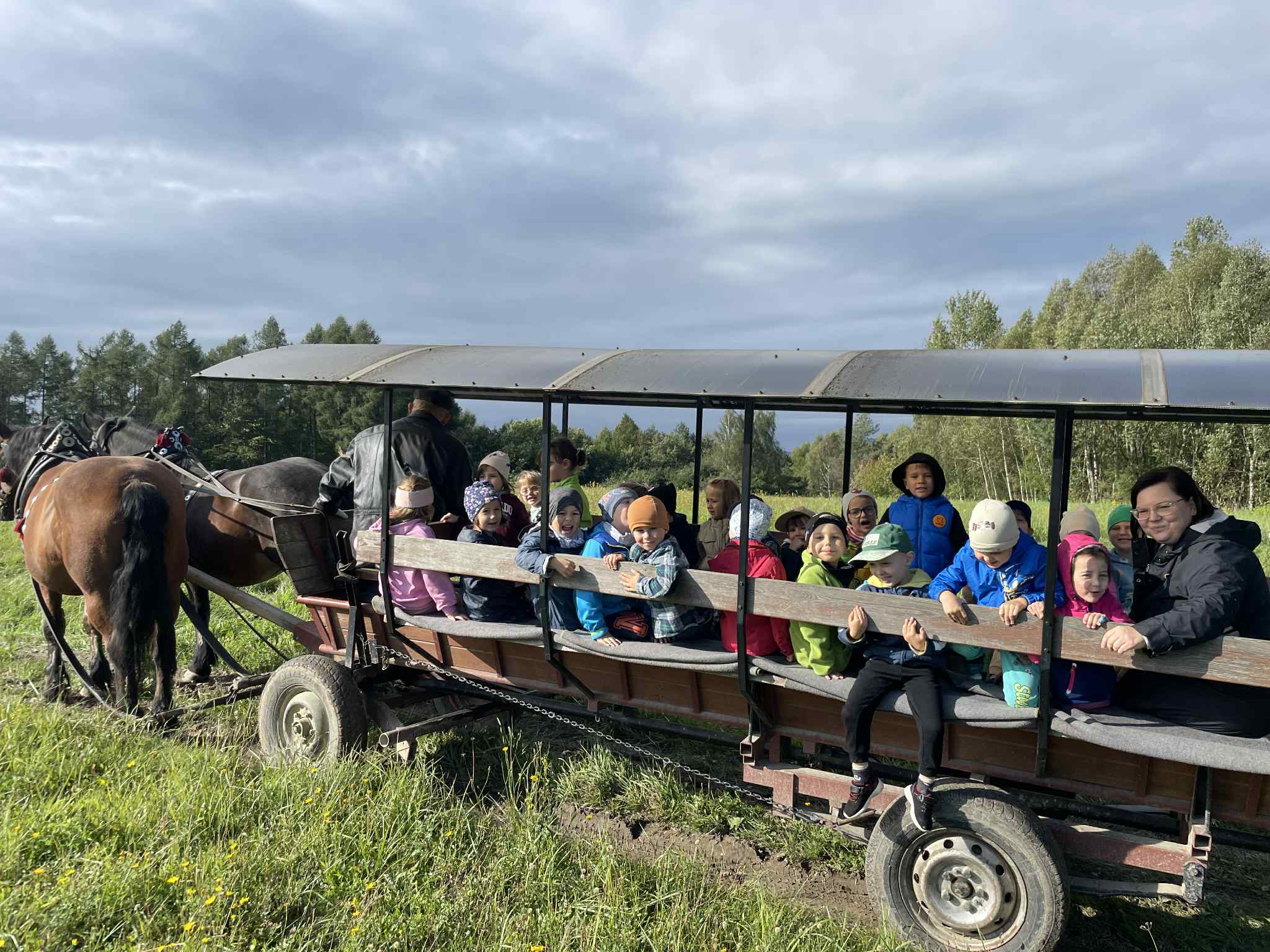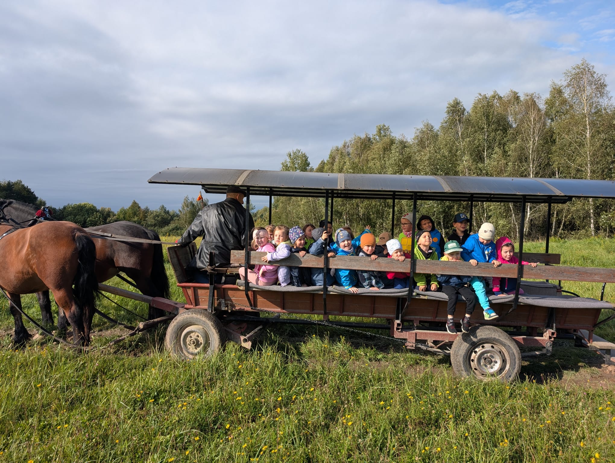 Jednym z najbardziej niezapomnianych momentów była jazda bryczką z Dziadziem Stasiem. Widok pięknych pól i łąk, spokojne tempo przejażdżki i dźwięk kopyt końskich sprawiły, że dzieci mogły poczuć wyjątkowy klimat wiejskiego życia.