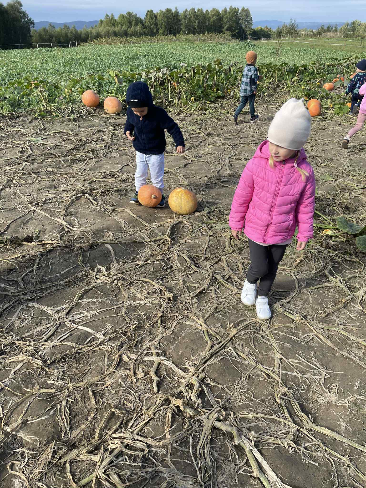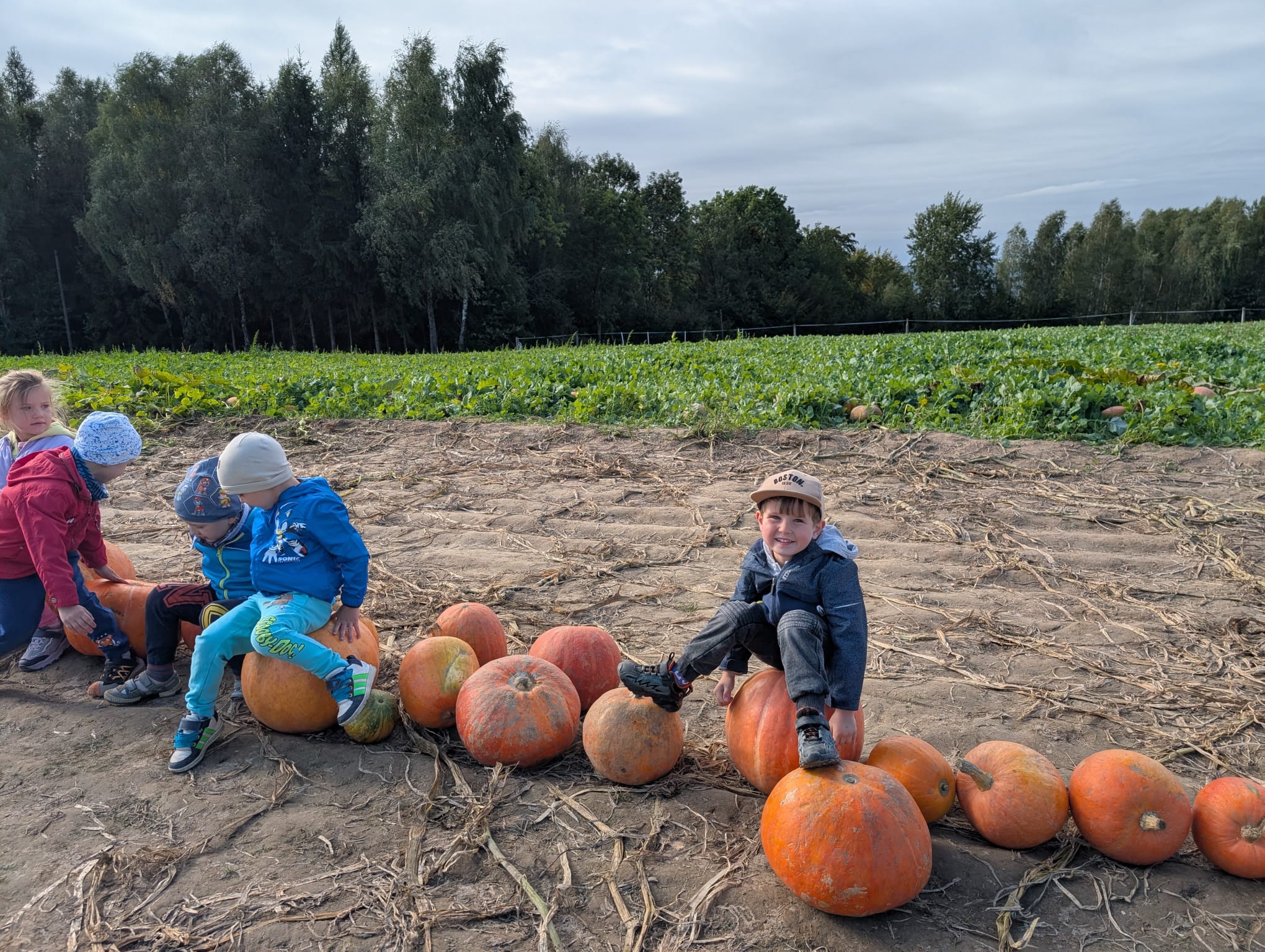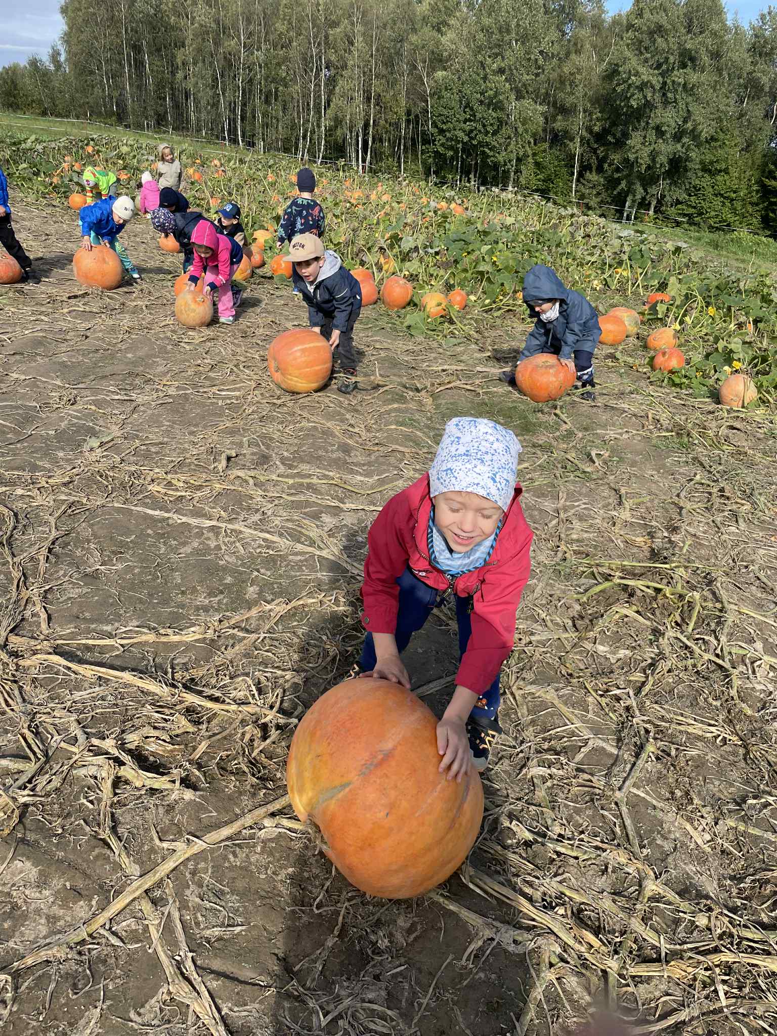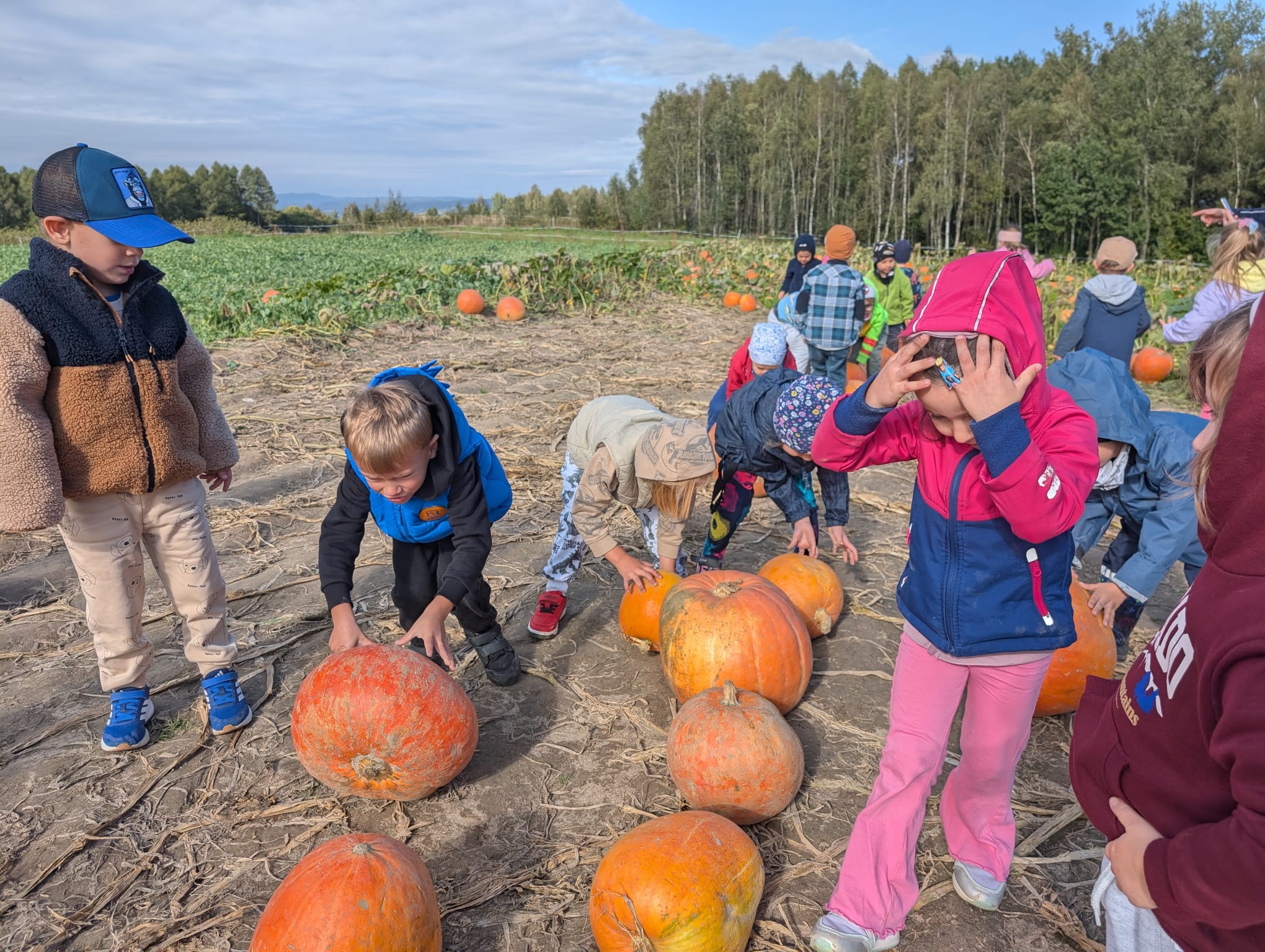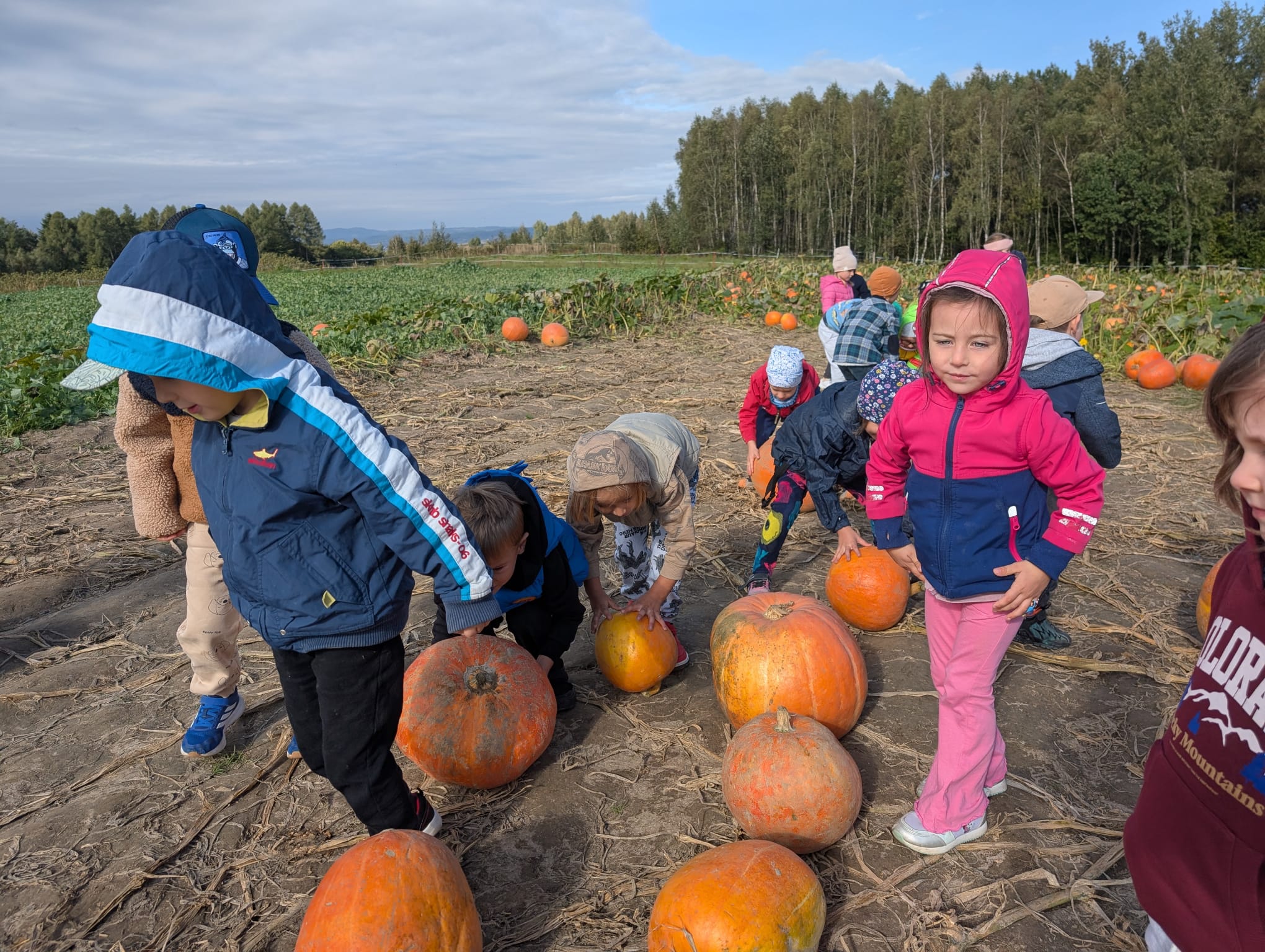 Dużo emocji wzbudziło również zbieranie dyni prosto z pola. Każde dziecko mogło wybrać swoją ulubioną i ułożyć wspólny pociąg, ogromne dynie stały się powodem do wspólnych żartów i współpracy przy ich podnoszeniu i turlaniu.
