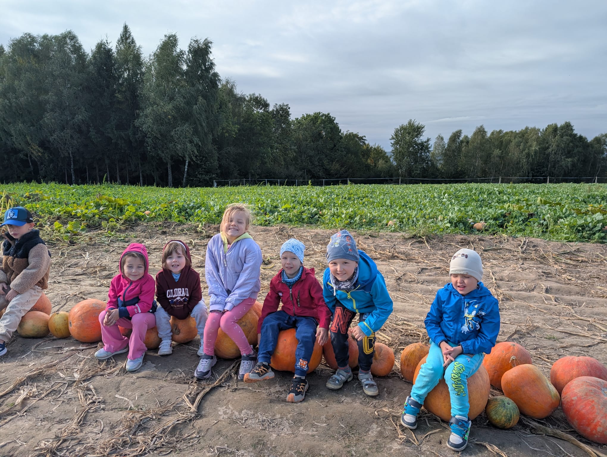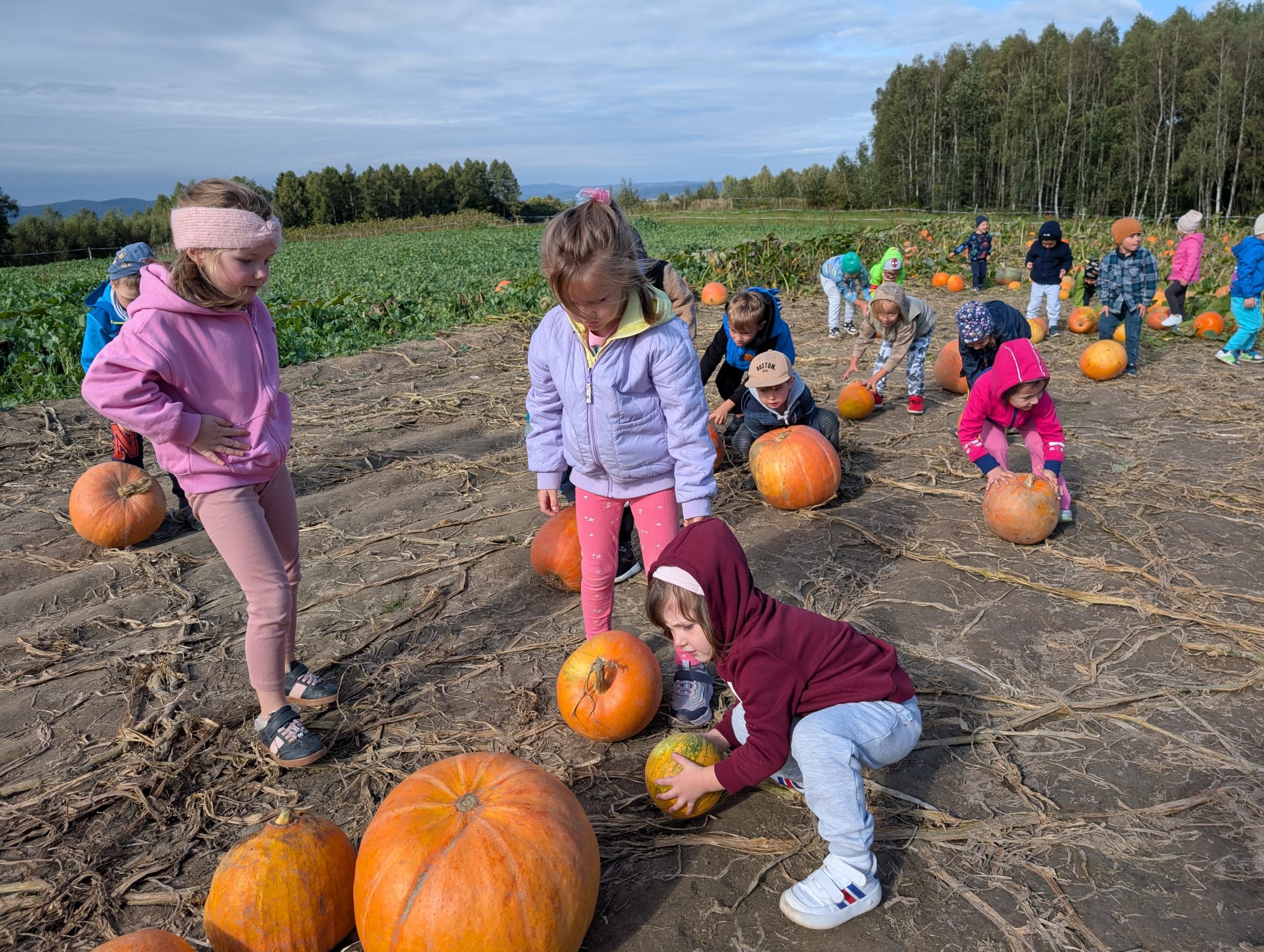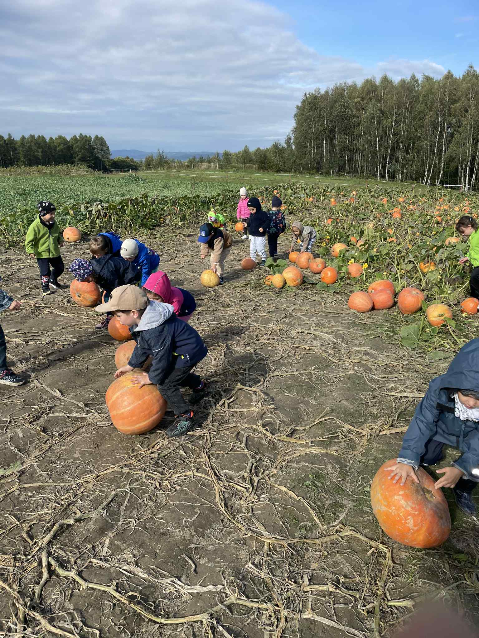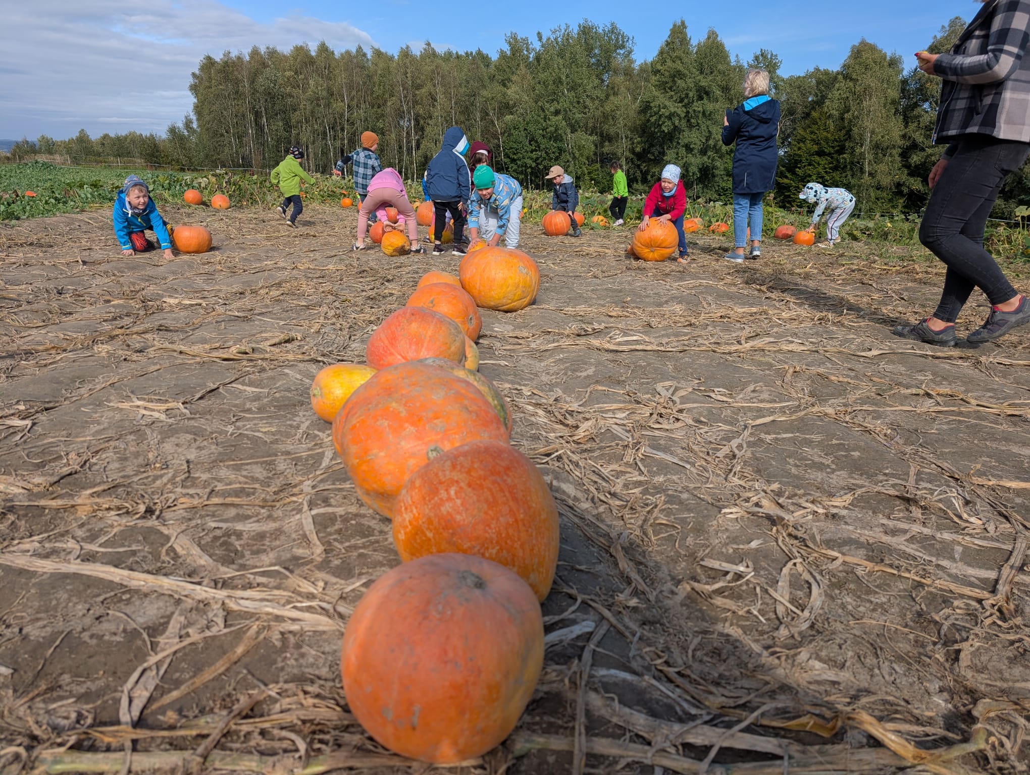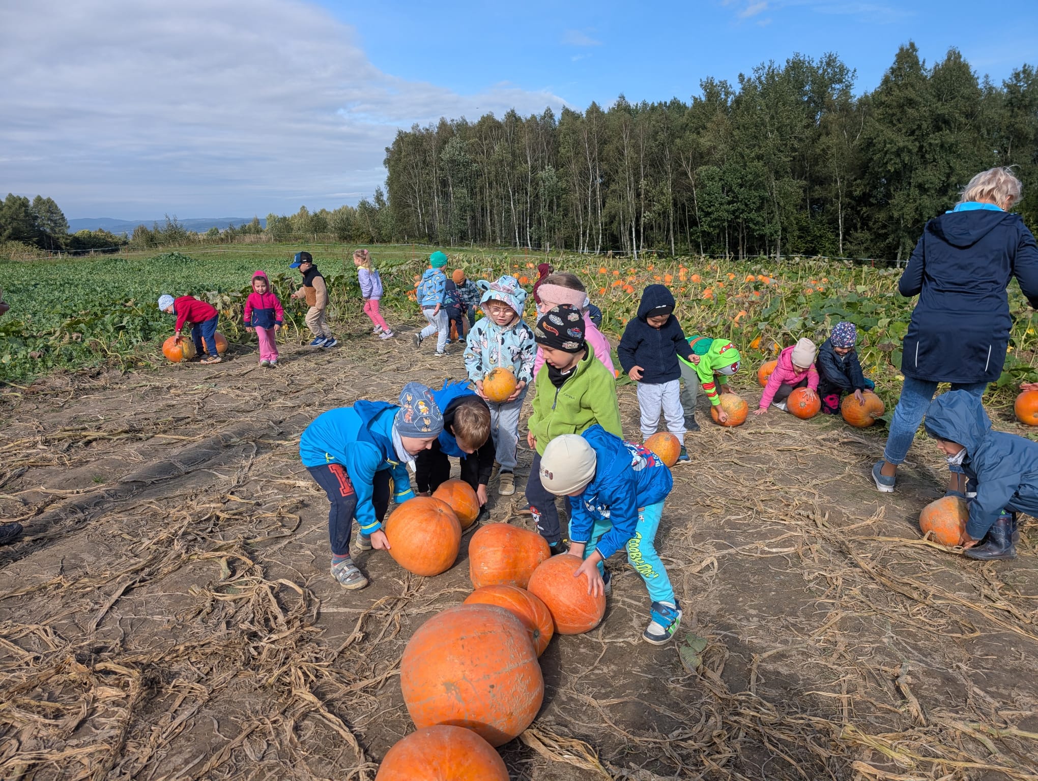 Dużo emocji wzbudziło również zbieranie dyni prosto z pola. Każde dziecko mogło wybrać swoją ulubioną i ułożyć wspólny pociąg, ogromne dynie stały się powodem do wspólnych żartów i współpracy przy ich podnoszeniu i turlaniu.