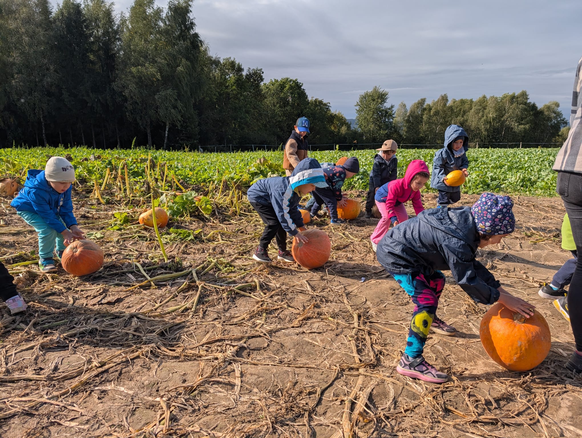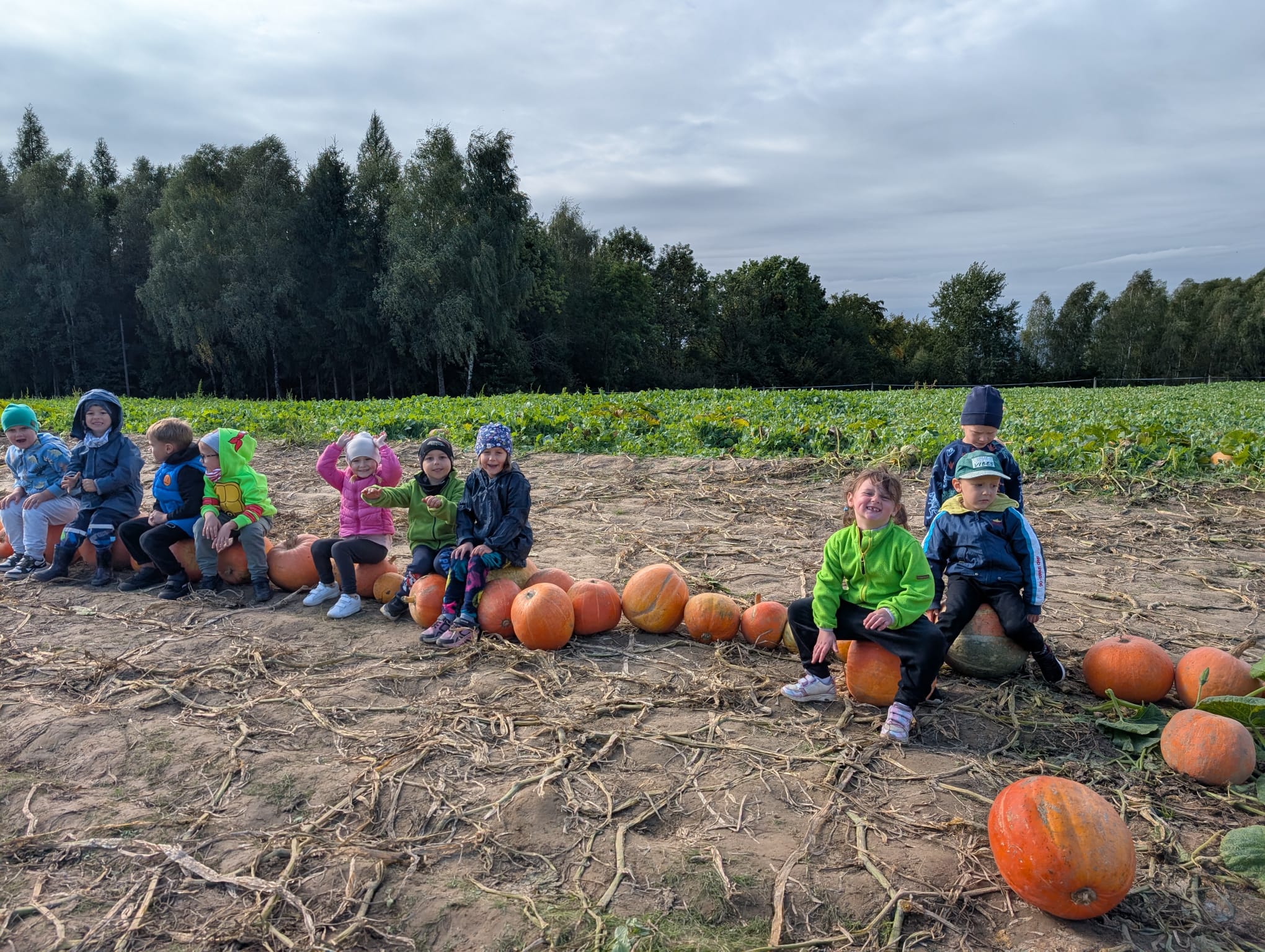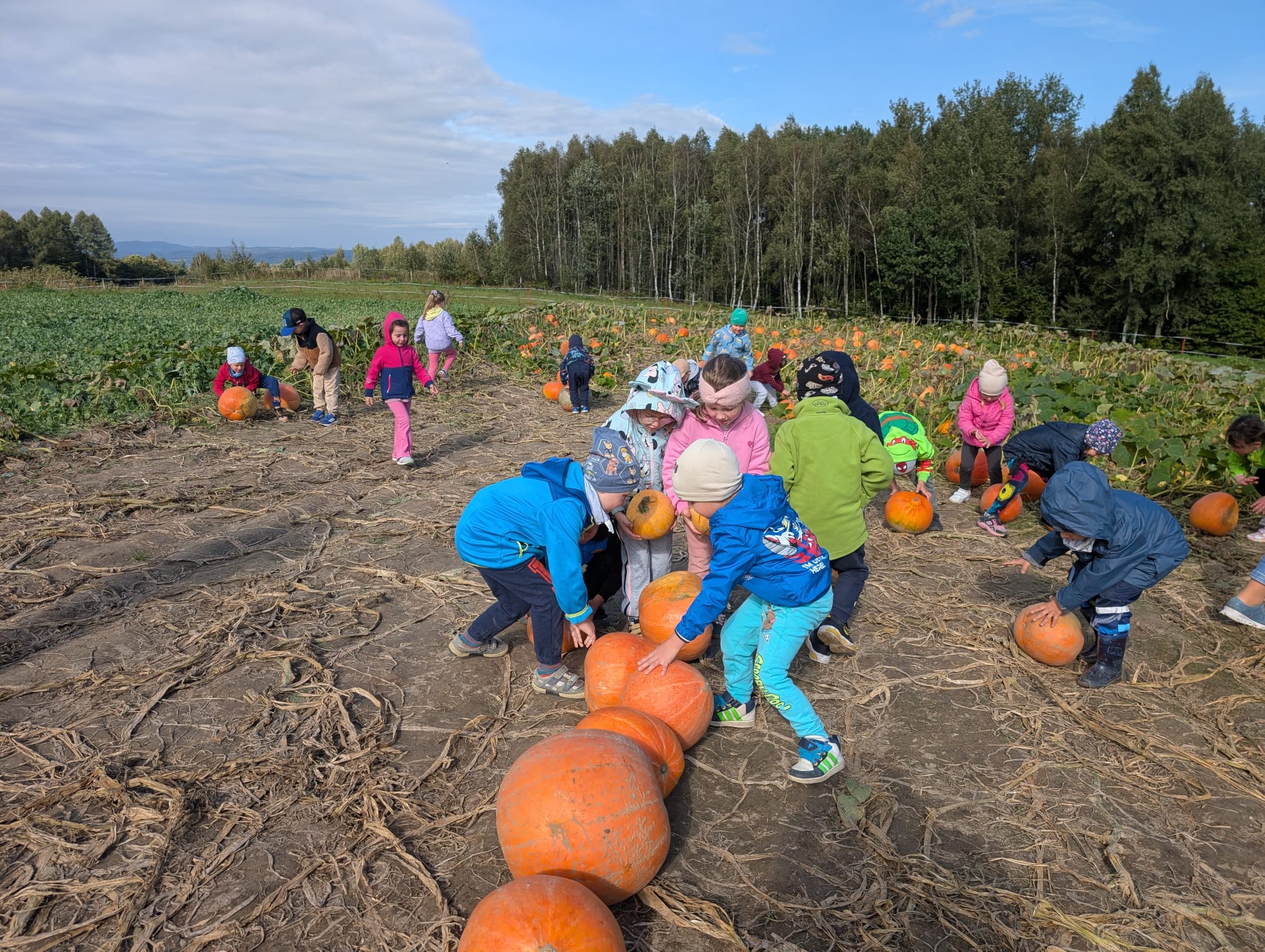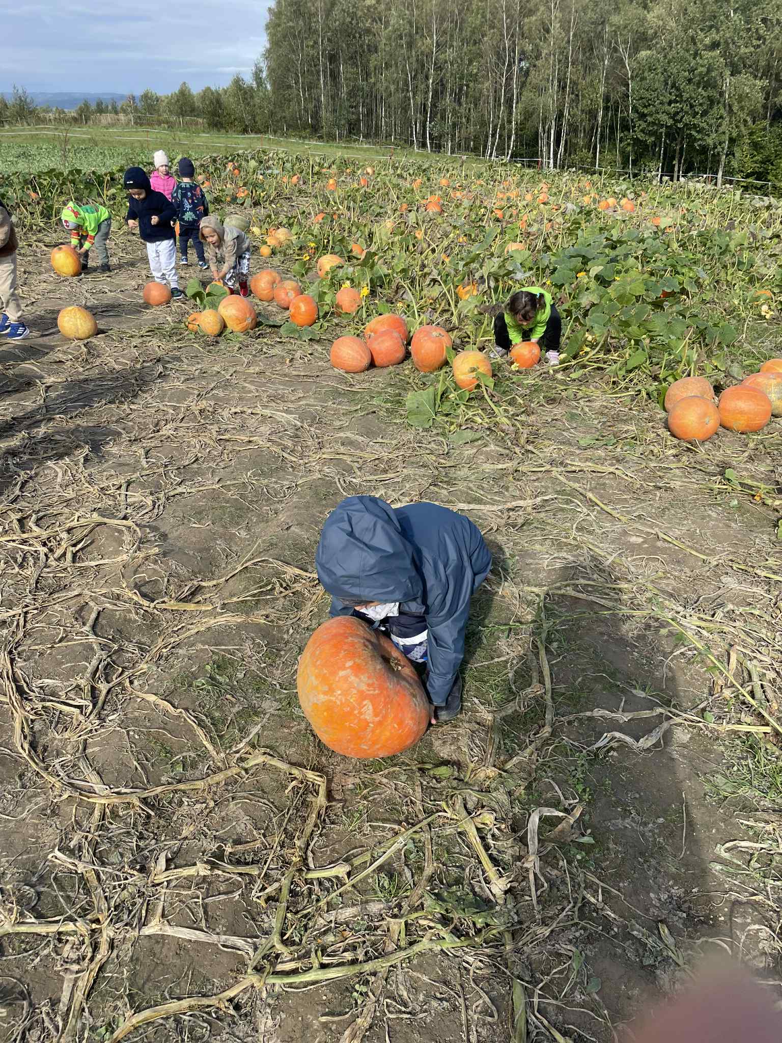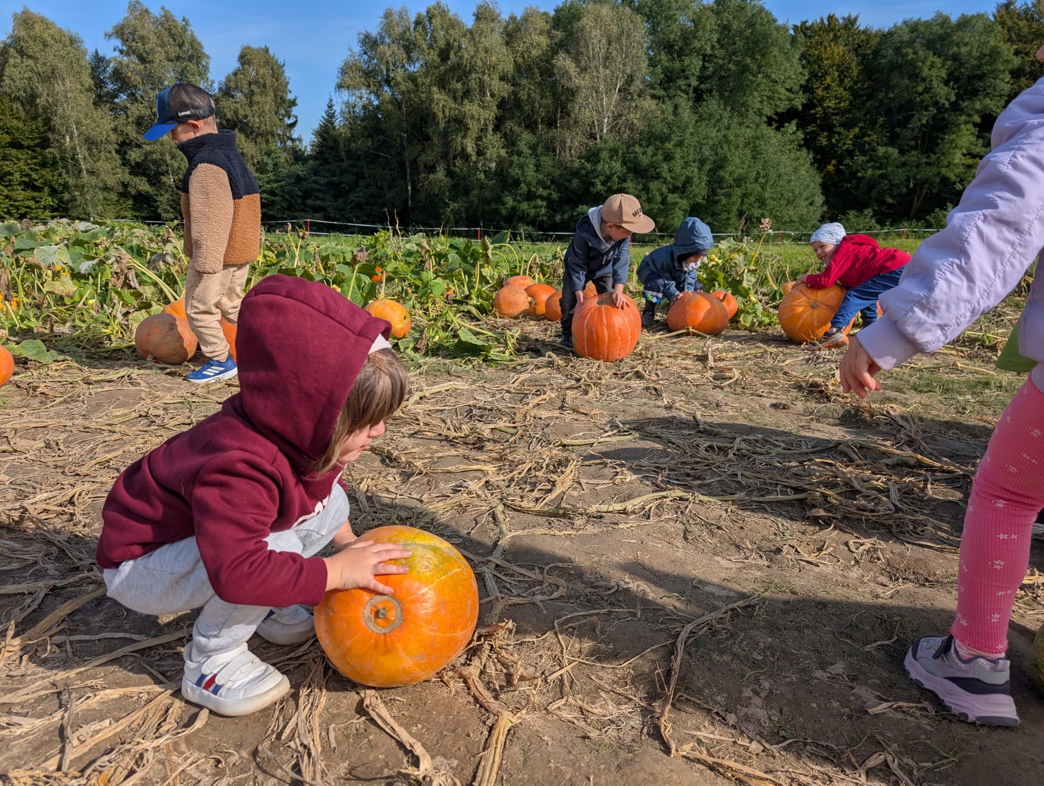 Dużo emocji wzbudziło również zbieranie dyni prosto z pola. Każde dziecko mogło wybrać swoją ulubioną i ułożyć wspólny pociąg, ogromne dynie stały się powodem do wspólnych żartów i współpracy przy ich podnoszeniu i turlaniu.