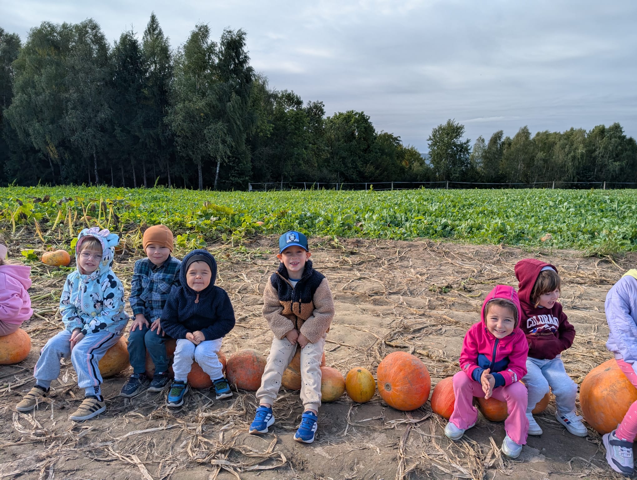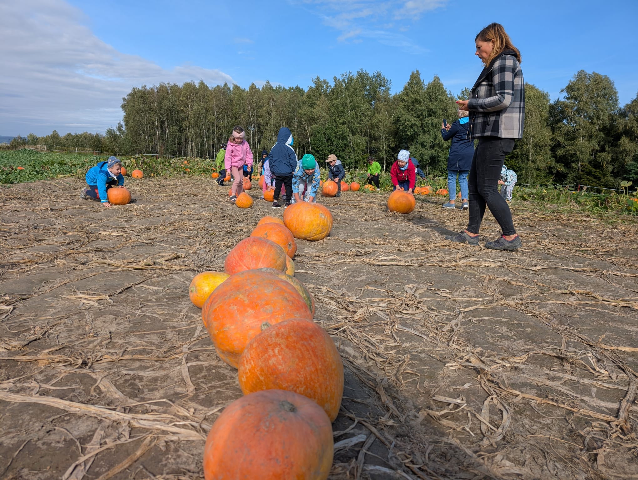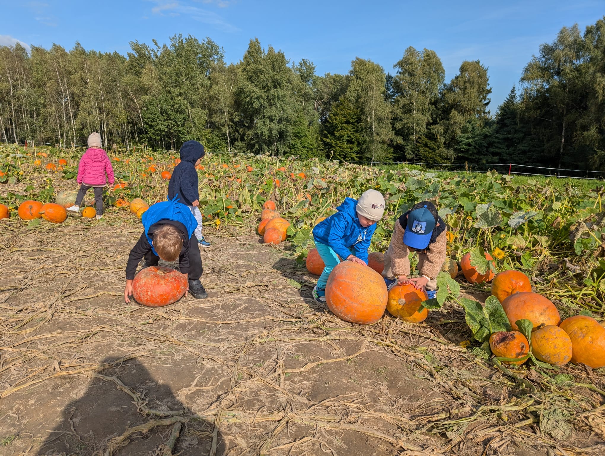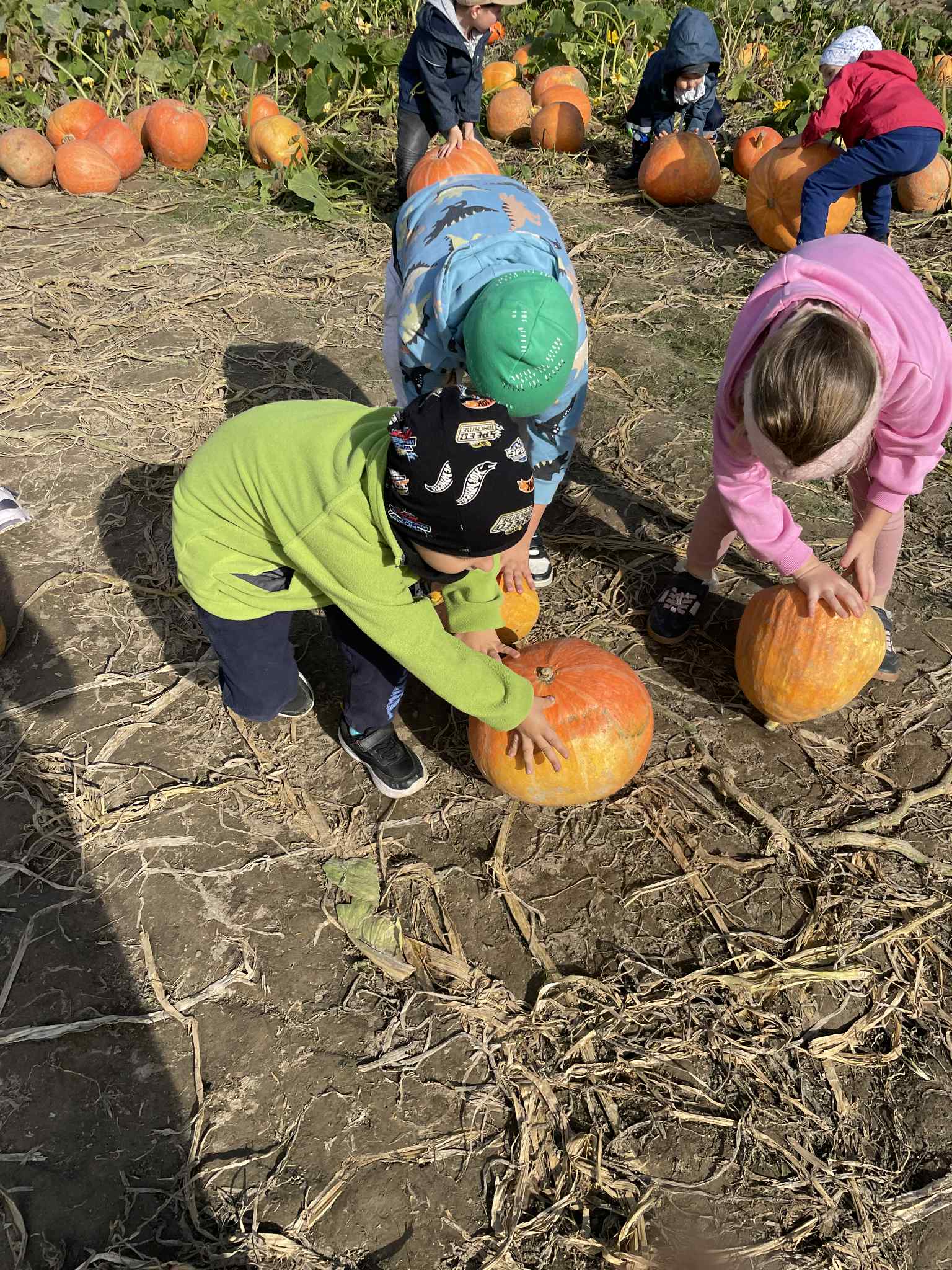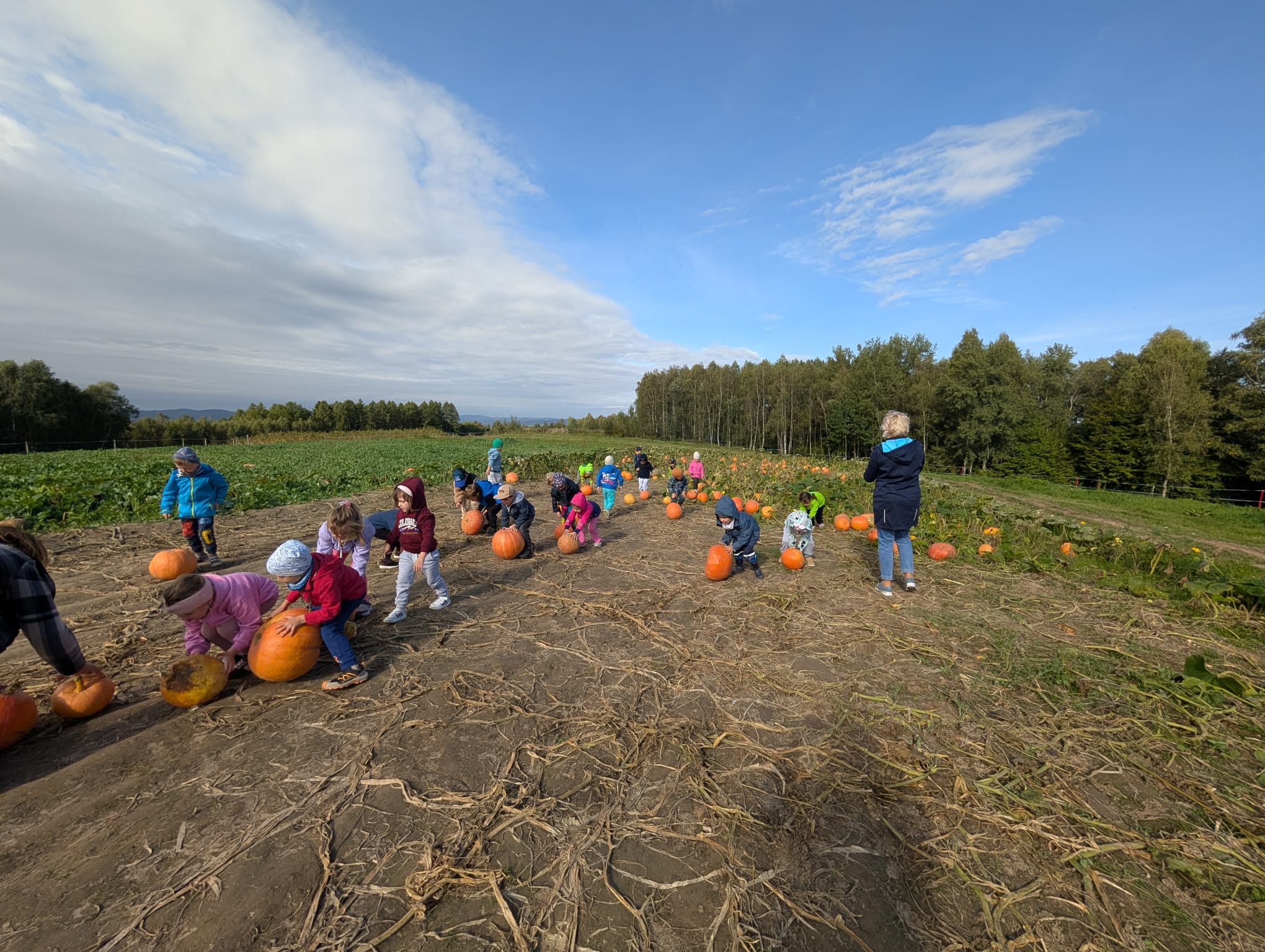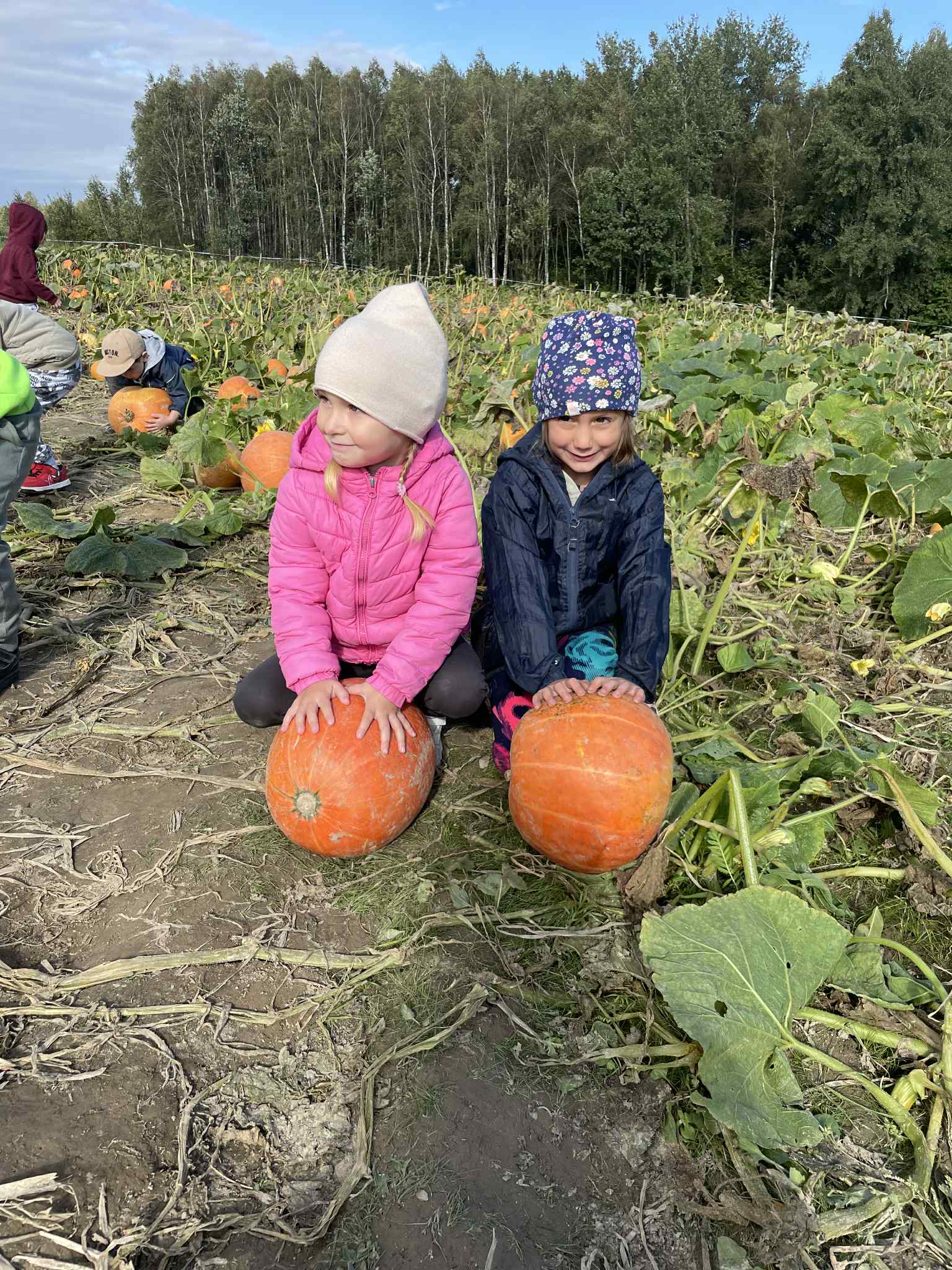 Dużo emocji wzbudziło również zbieranie dyni prosto z pola. Każde dziecko mogło wybrać swoją ulubioną i ułożyć wspólny pociąg, ogromne dynie stały się powodem do wspólnych żartów i współpracy przy ich podnoszeniu i turlaniu.