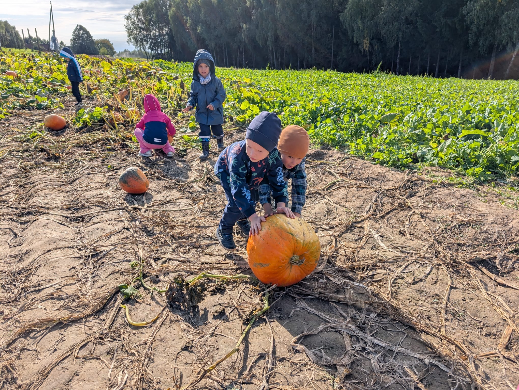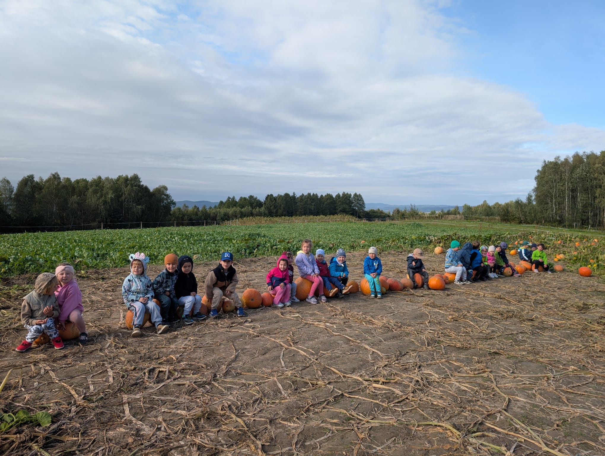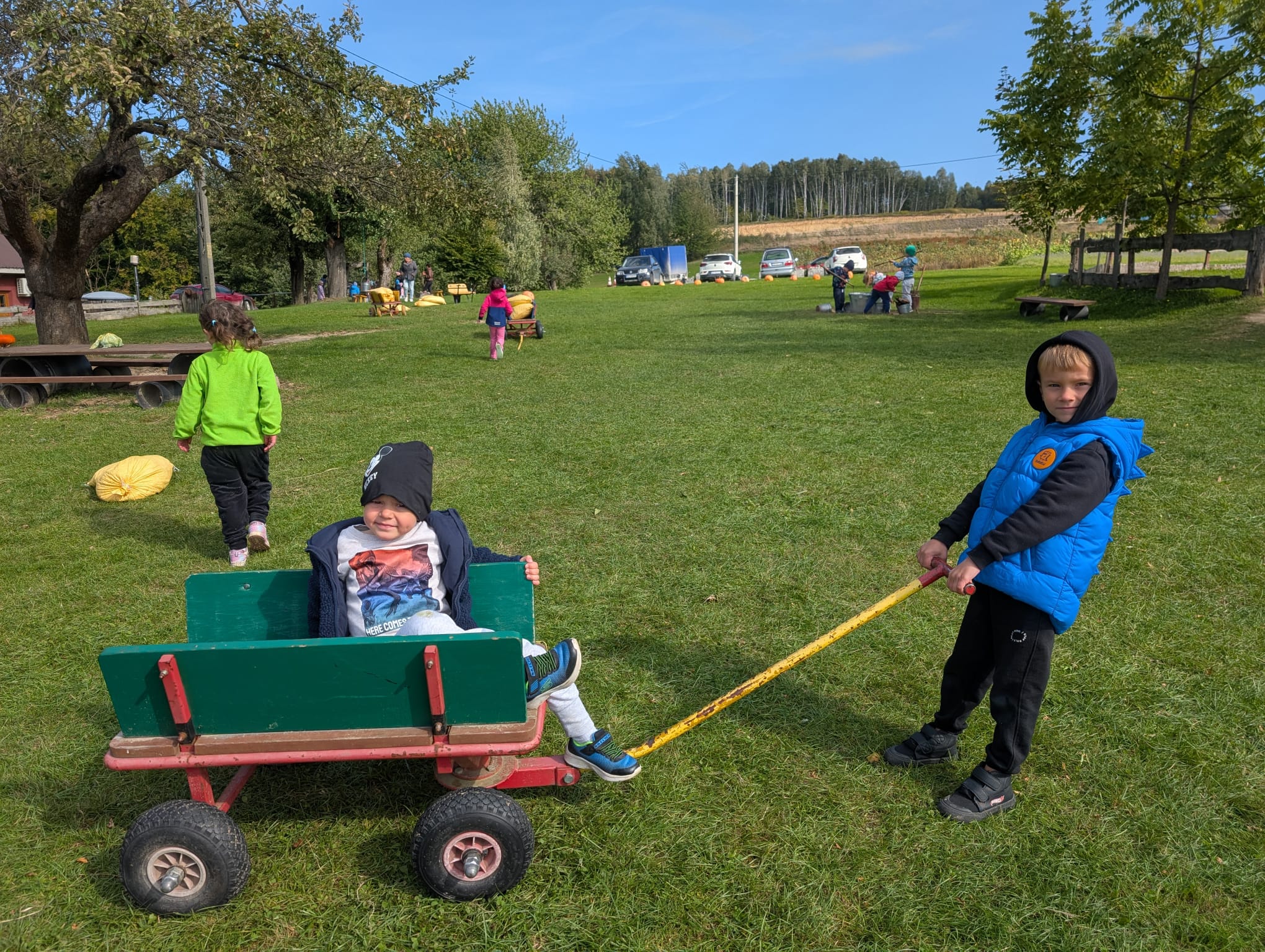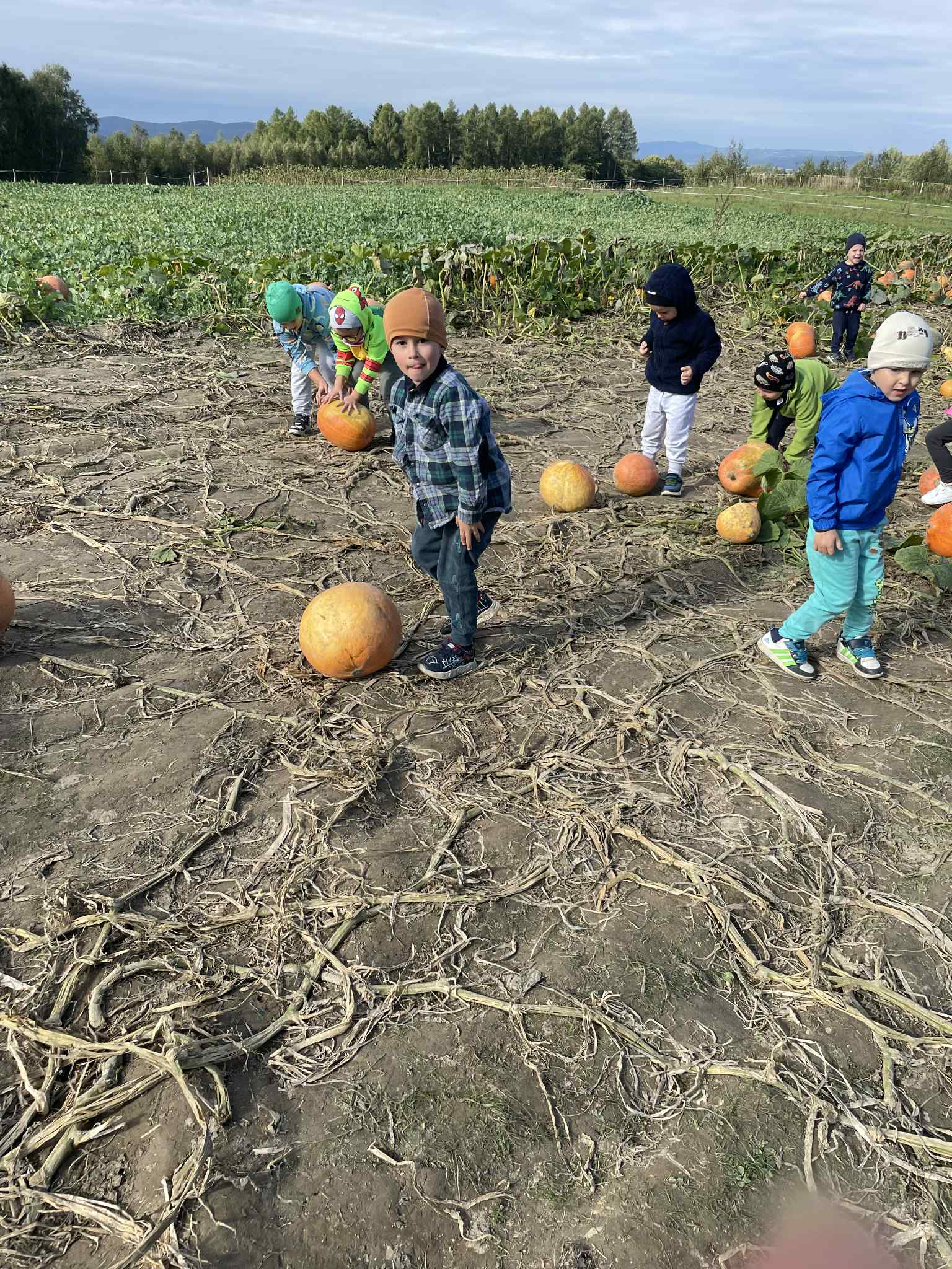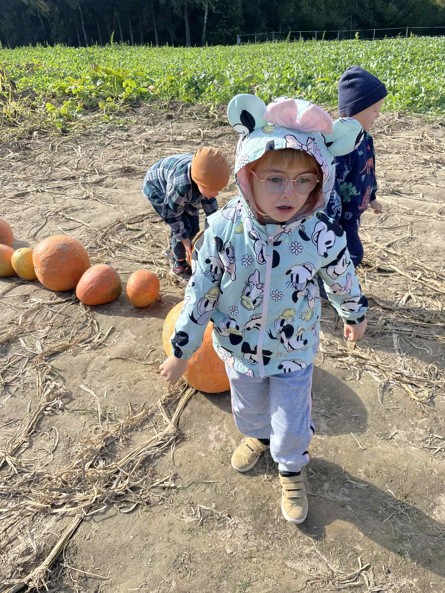 Dużo emocji wzbudziło również zbieranie dyni prosto z pola. Każde dziecko mogło wybrać swoją ulubioną i ułożyć wspólny pociąg, ogromne dynie stały się powodem do wspólnych żartów i współpracy przy ich podnoszeniu i turlaniu.