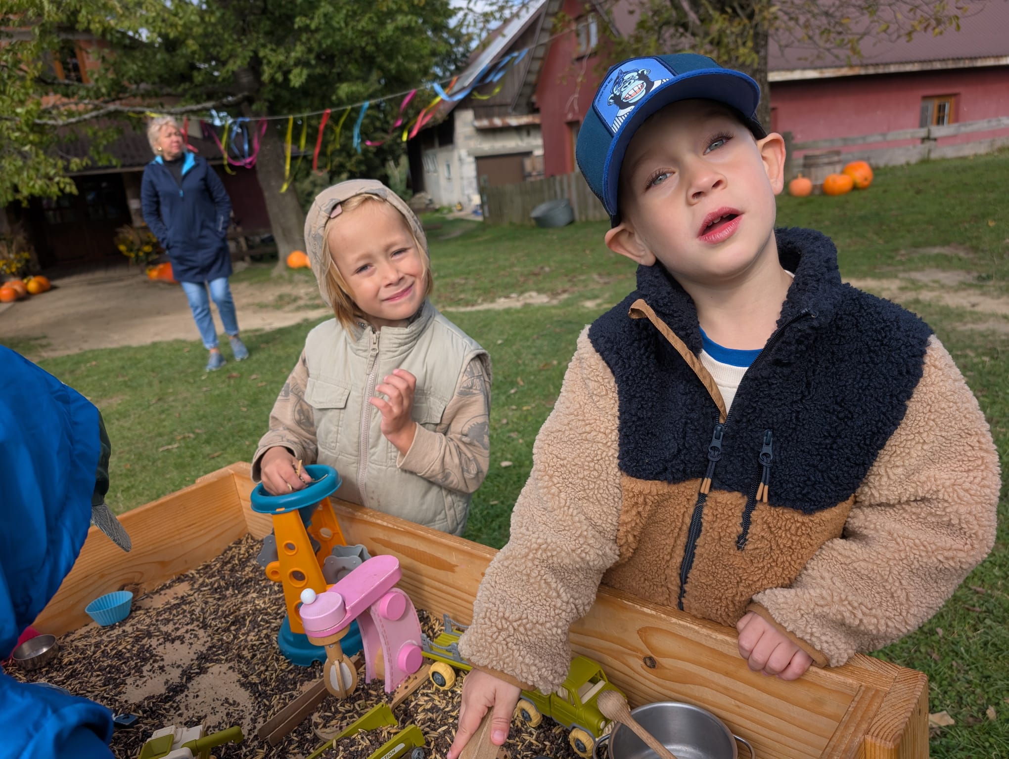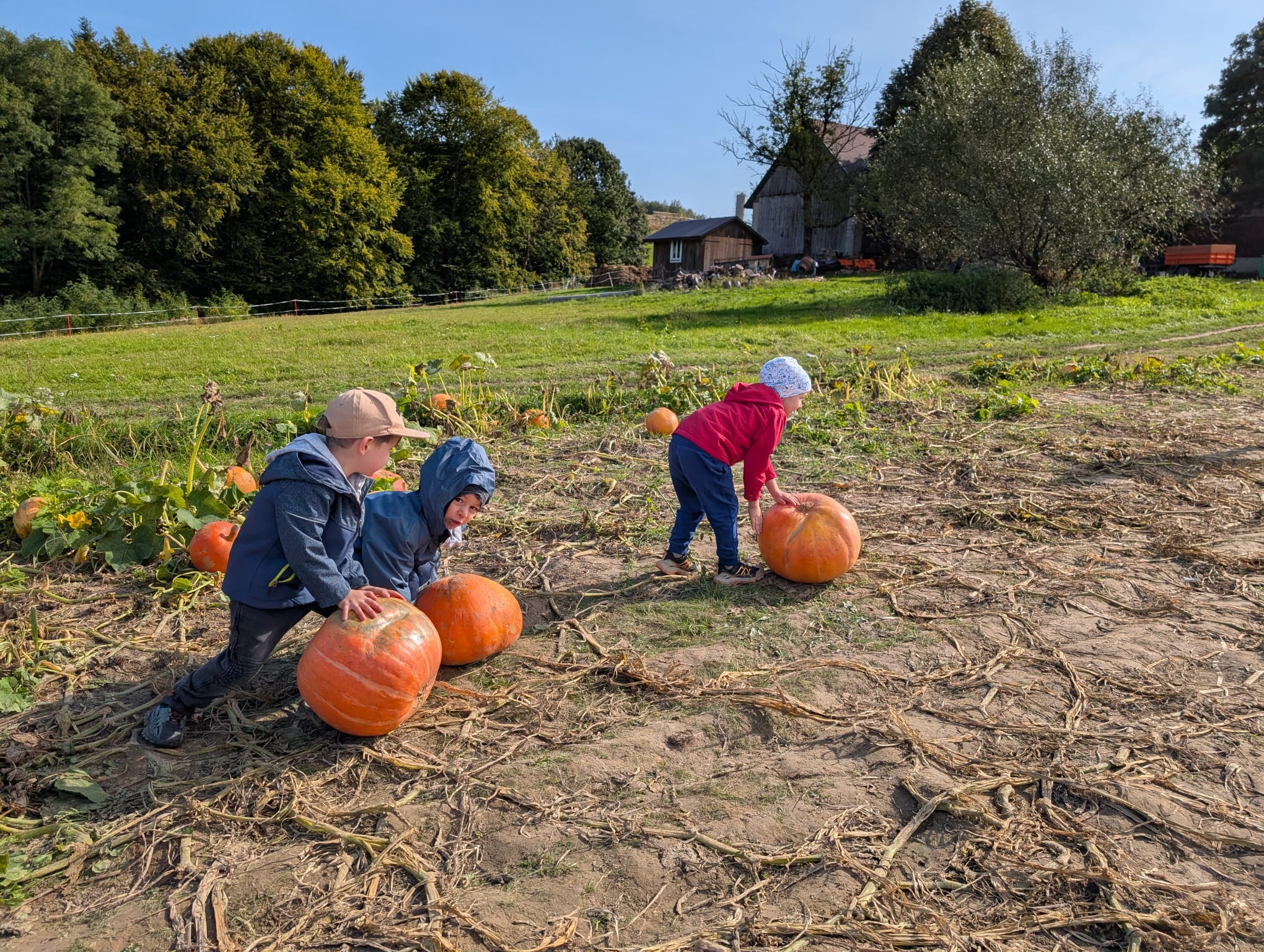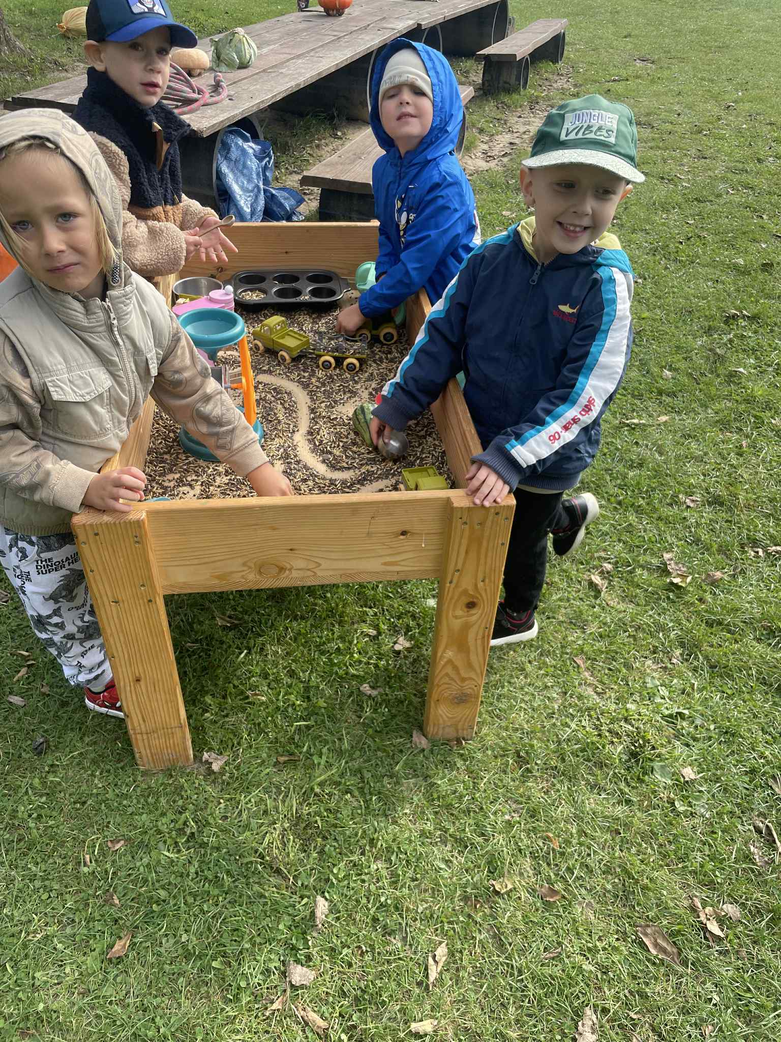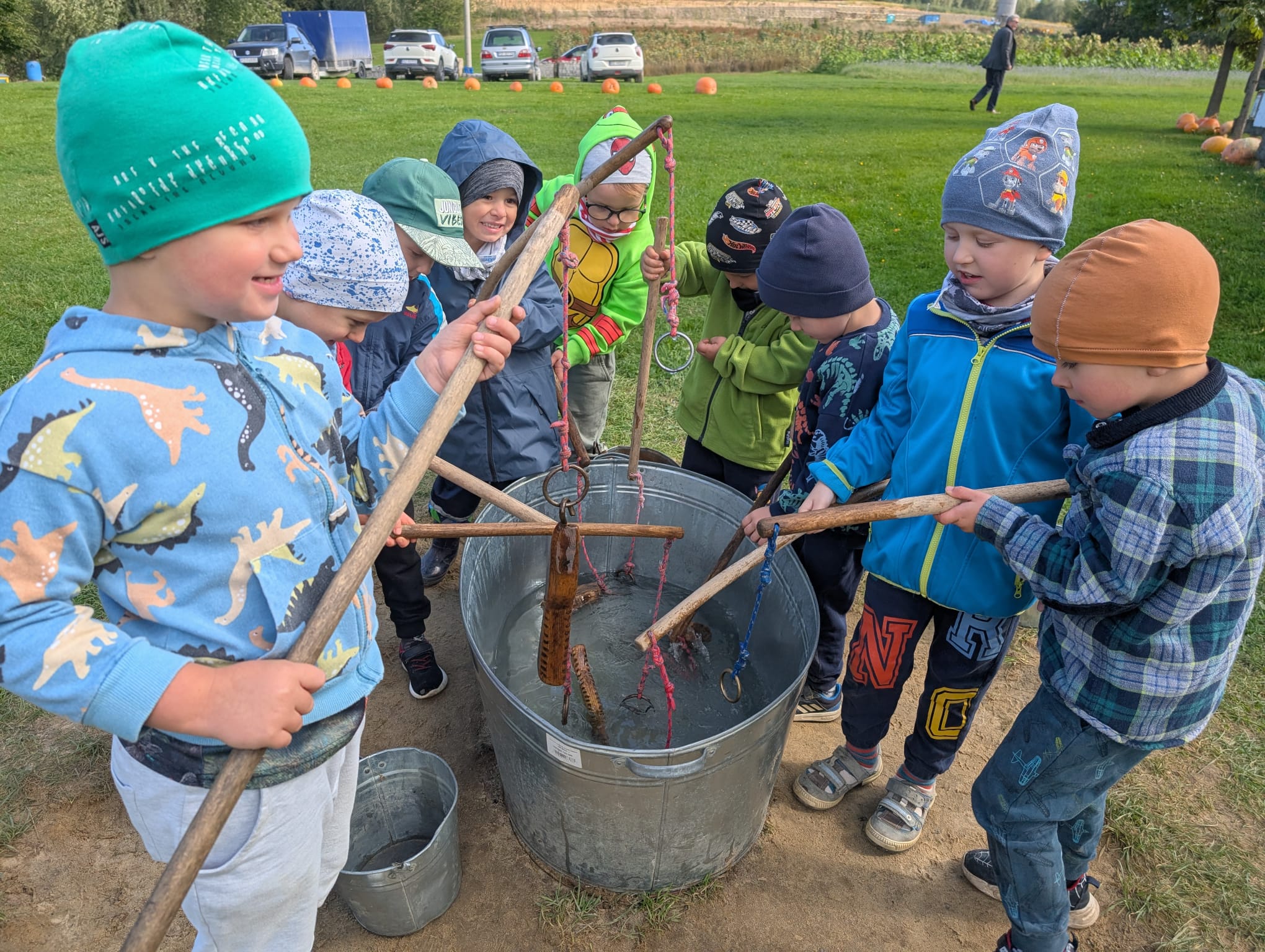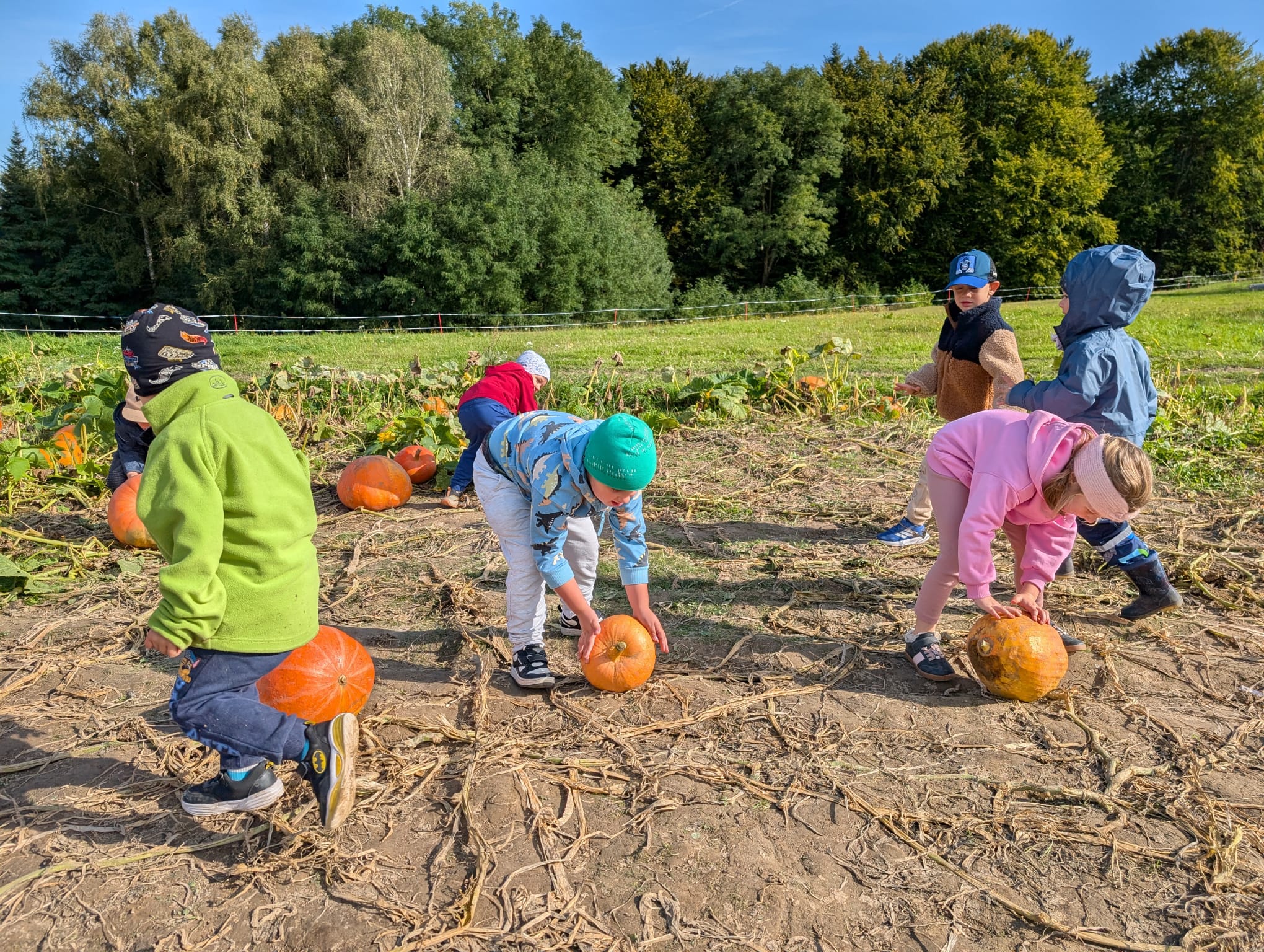 Dużo emocji wzbudziło również zbieranie dyni prosto z pola. Każde dziecko mogło wybrać swoją ulubioną i ułożyć wspólny pociąg, ogromne dynie stały się powodem do wspólnych żartów i współpracy przy ich podnoszeniu i turlaniu.