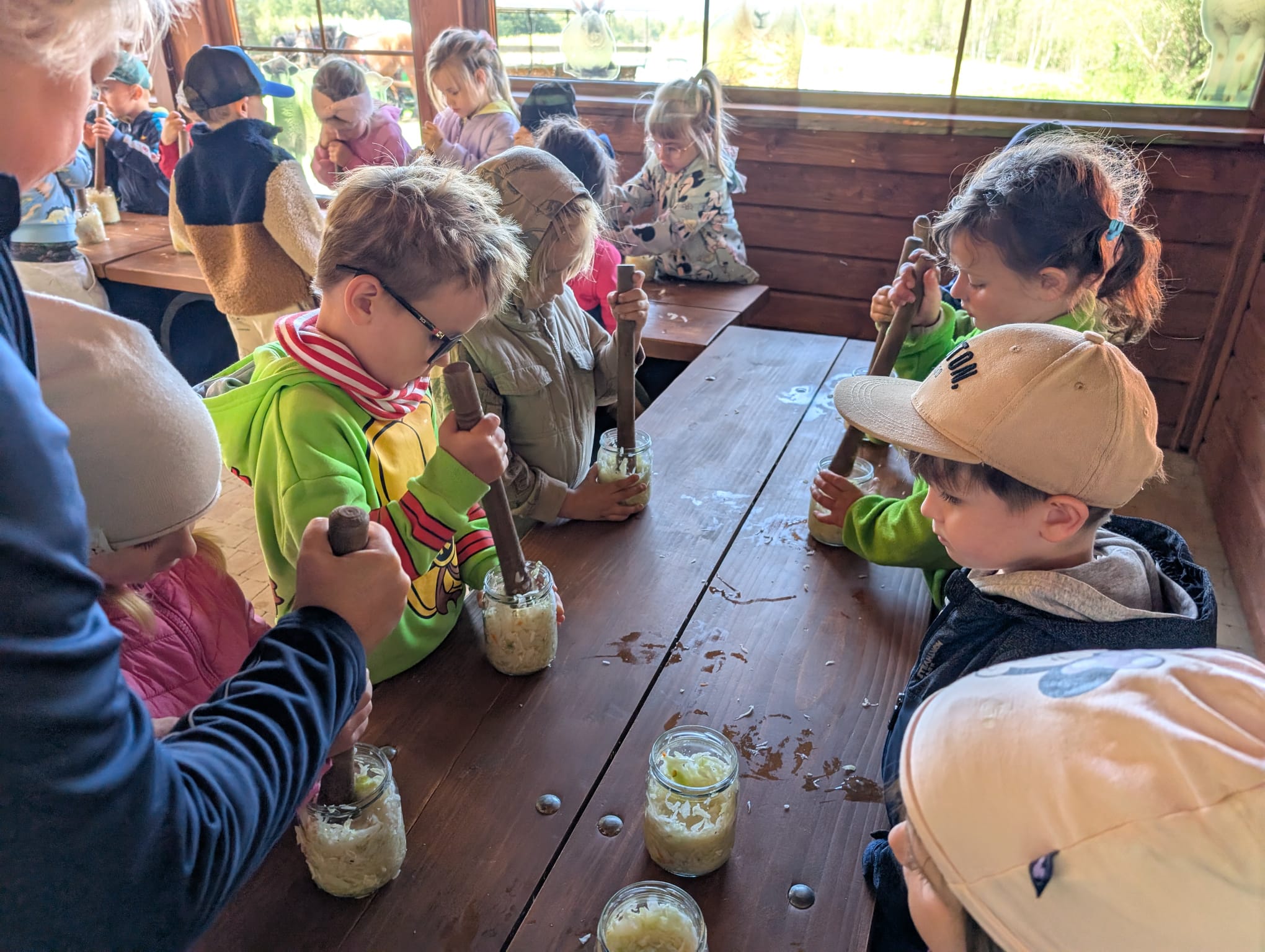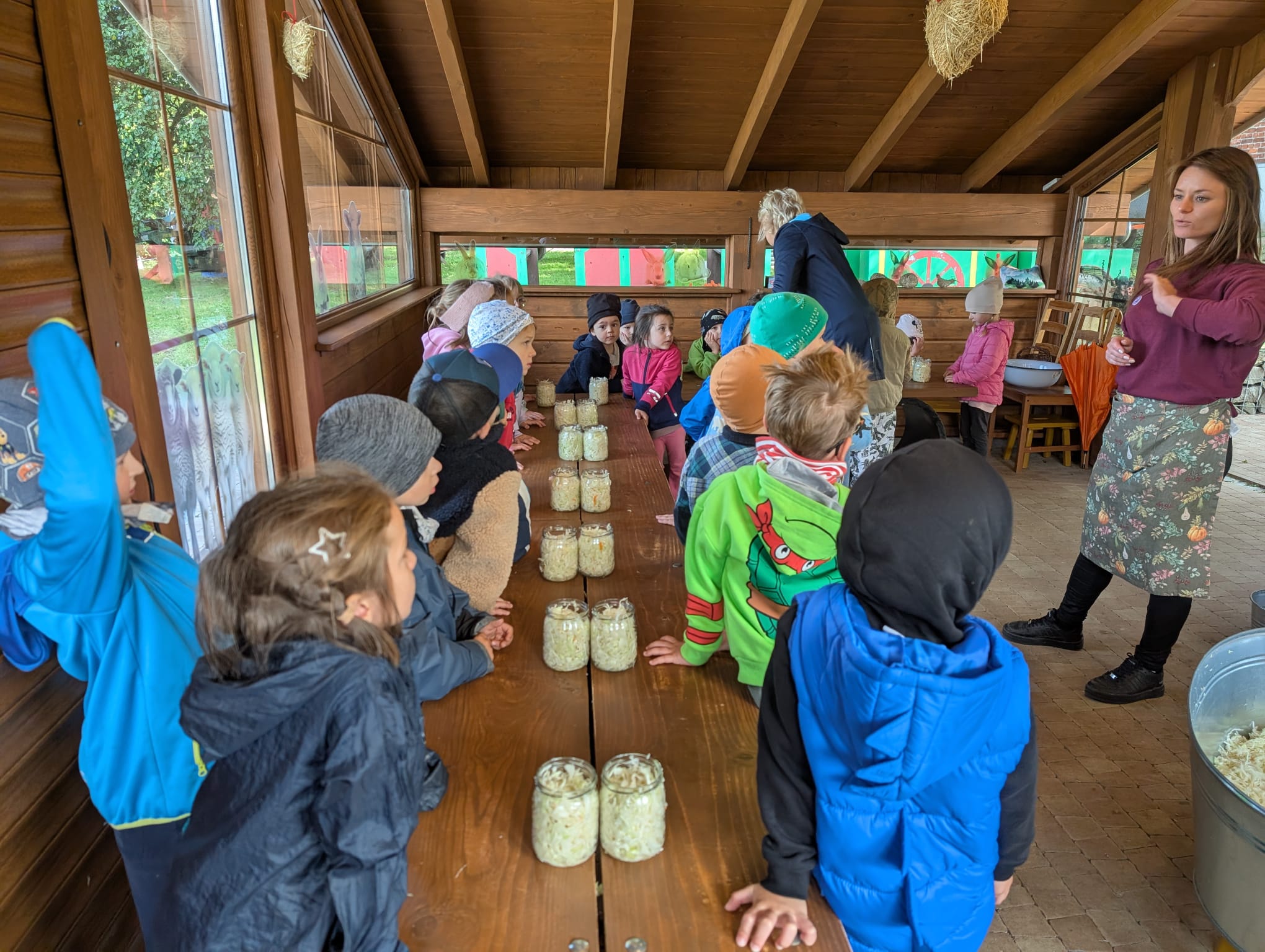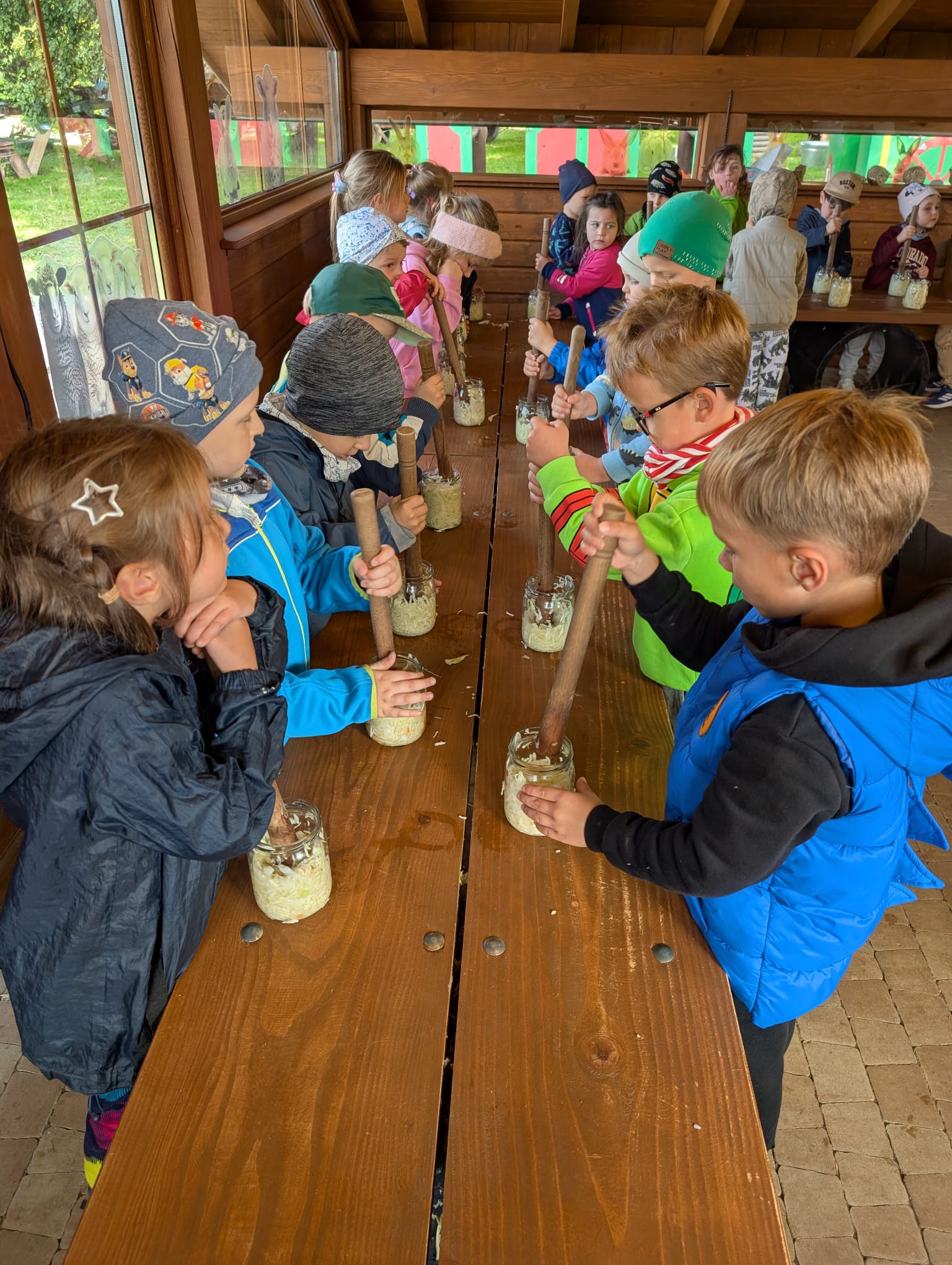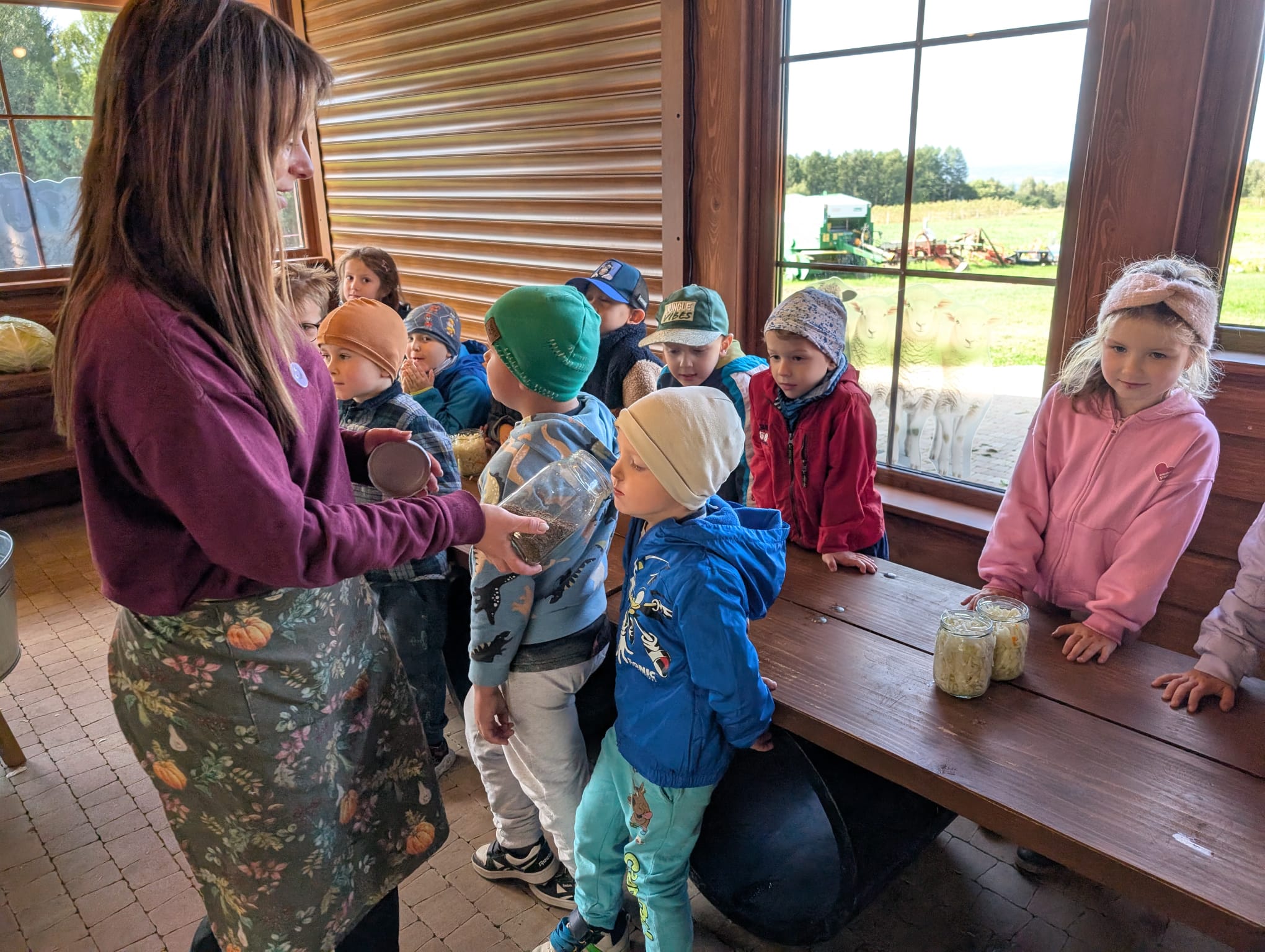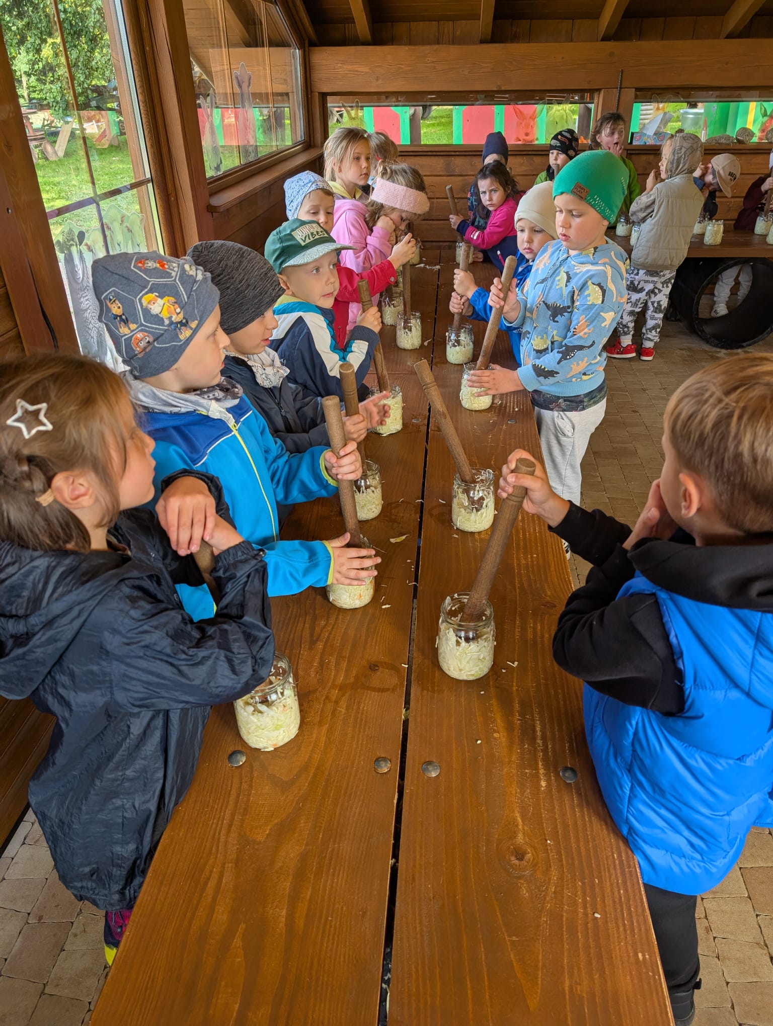 Na miejscu czekało mnóstwo ciekawych aktywności. Żabki z dużym zaangażowaniem brały udział w kiszeniu kapusty, poznając krok po kroku, jak dawniej przygotowywano zapasy na zimę. To było nie tylko ciekawe, ale też zabawne – szczególnie podczas ubijania kapusty w słoikach. Chętne przedszkolaki ze smakiem degustowały kapustkę.
