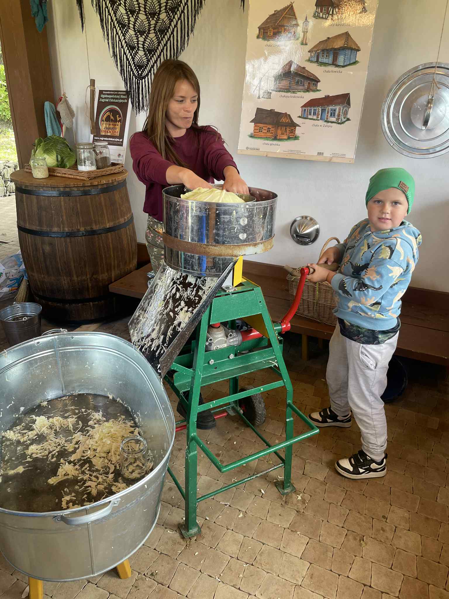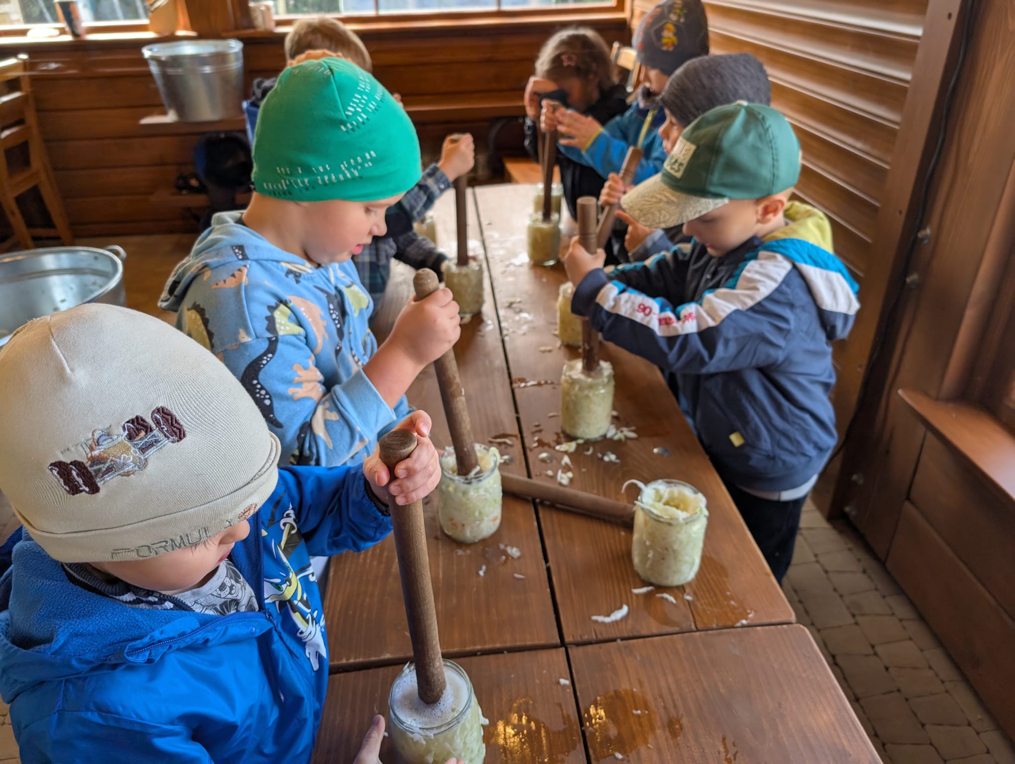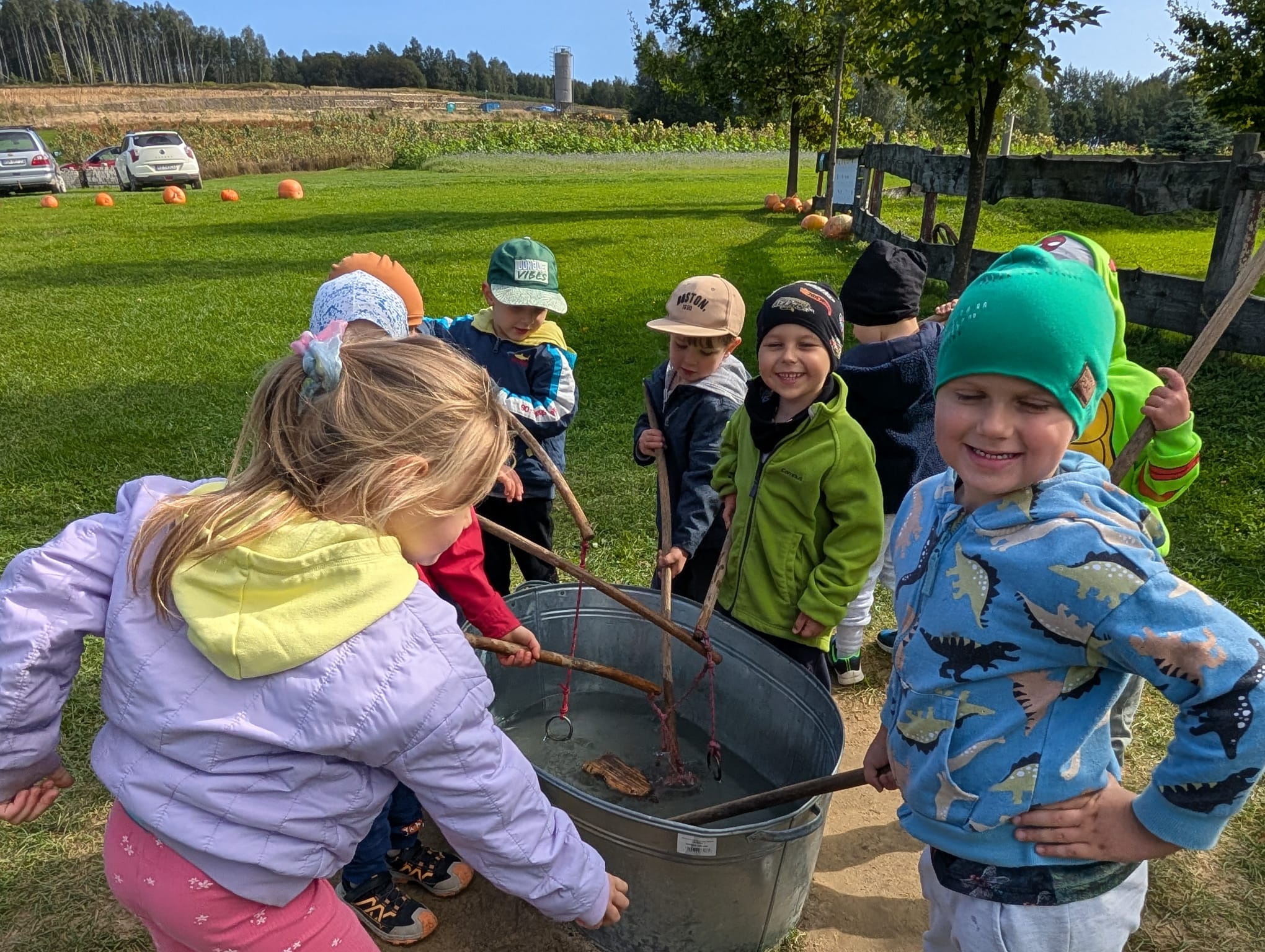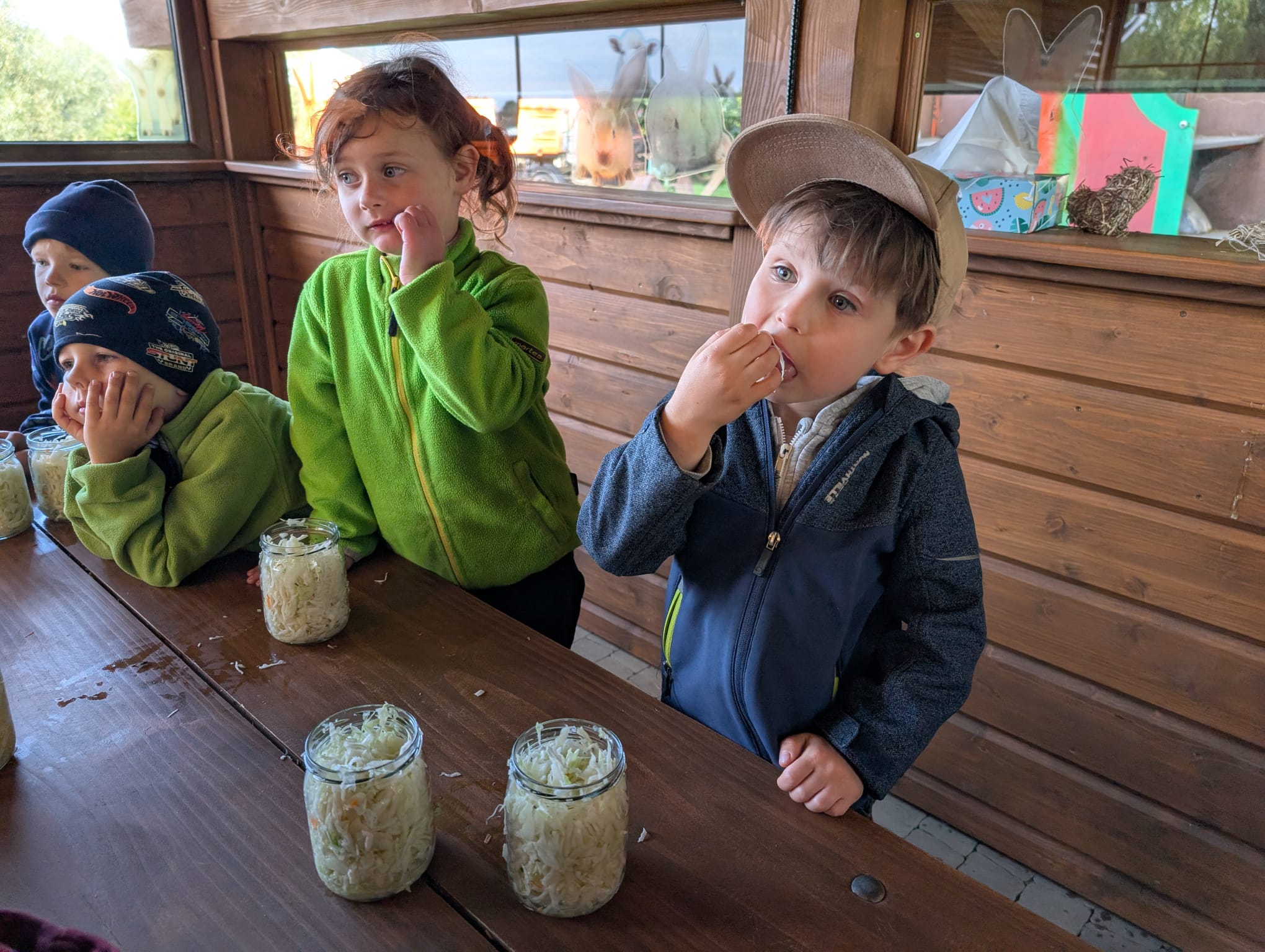 Na miejscu czekało mnóstwo ciekawych aktywności. Żabki z dużym zaangażowaniem brały udział w kiszeniu kapusty, poznając krok po kroku, jak dawniej przygotowywano zapasy na zimę. To było nie tylko ciekawe, ale też zabawne – szczególnie podczas ubijania kapusty w słoikach. Chętne przedszkolaki ze smakiem degustowały kapustkę.