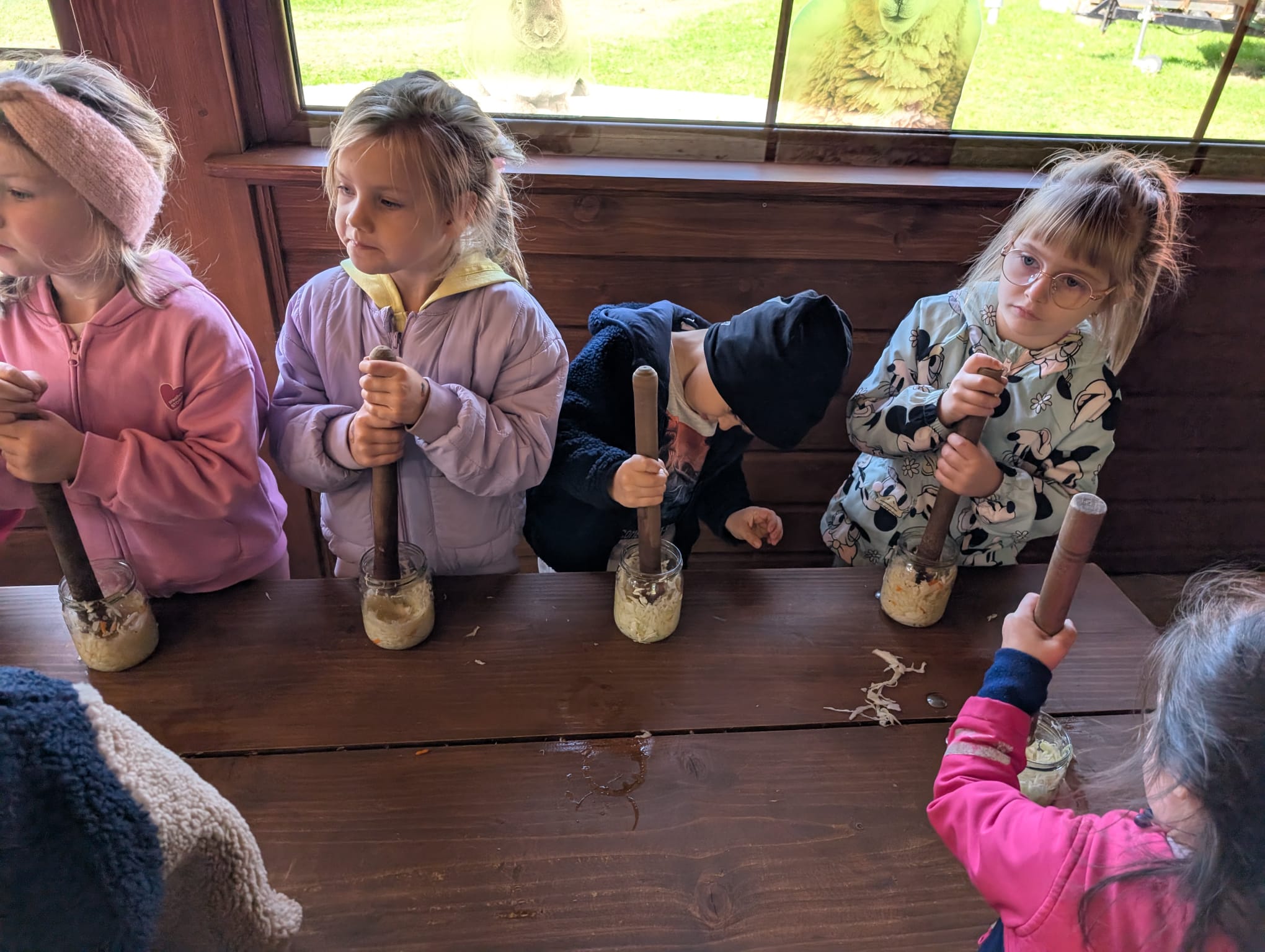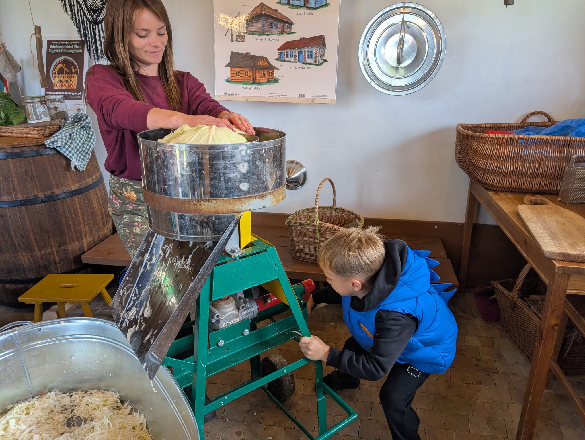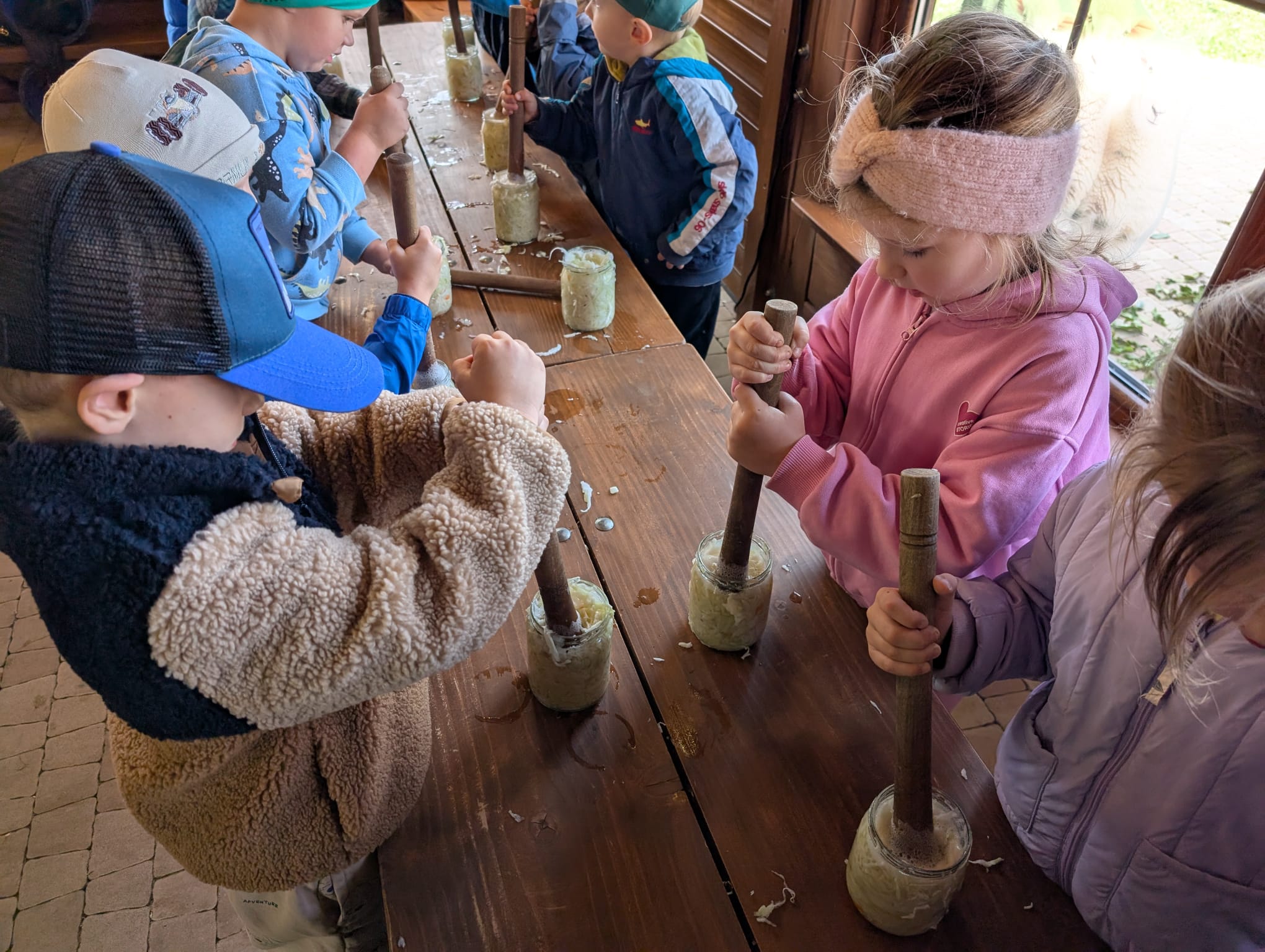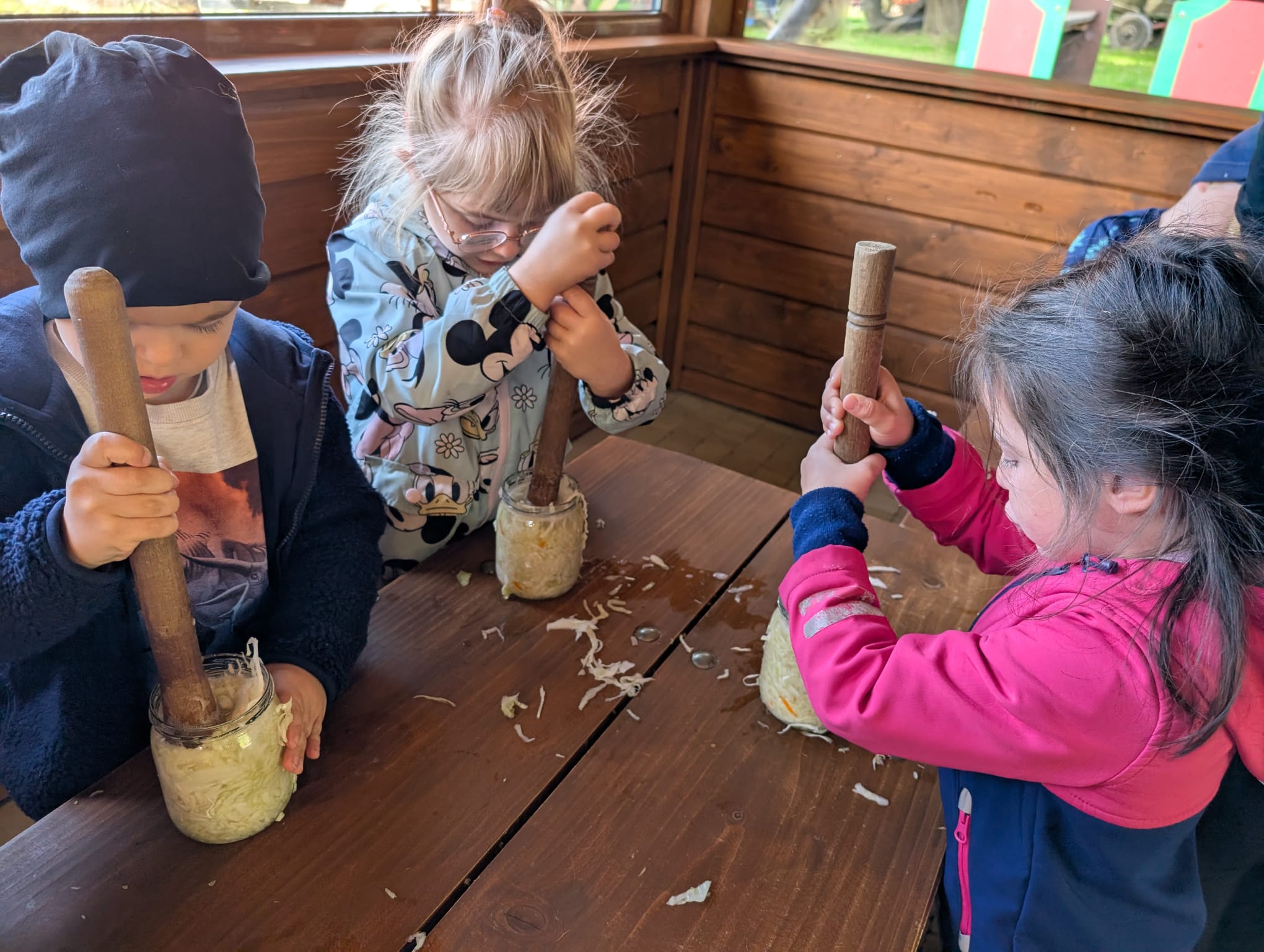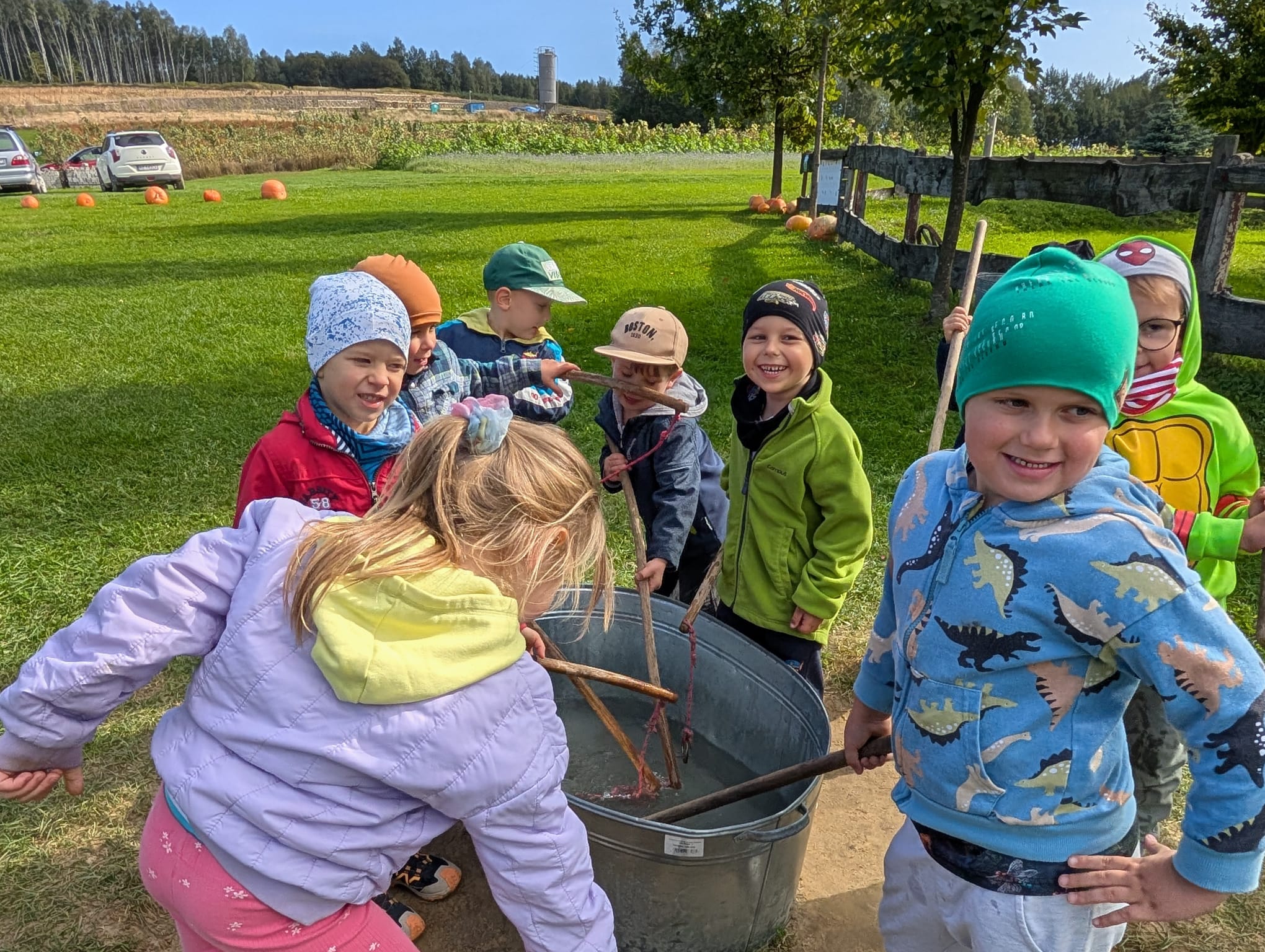 Na miejscu czekało mnóstwo ciekawych aktywności. Żabki z dużym zaangażowaniem brały udział w kiszeniu kapusty, poznając krok po kroku, jak dawniej przygotowywano zapasy na zimę. To było nie tylko ciekawe, ale też zabawne – szczególnie podczas ubijania kapusty w słoikach. Chętne przedszkolaki ze smakiem degustowały kapustkę.