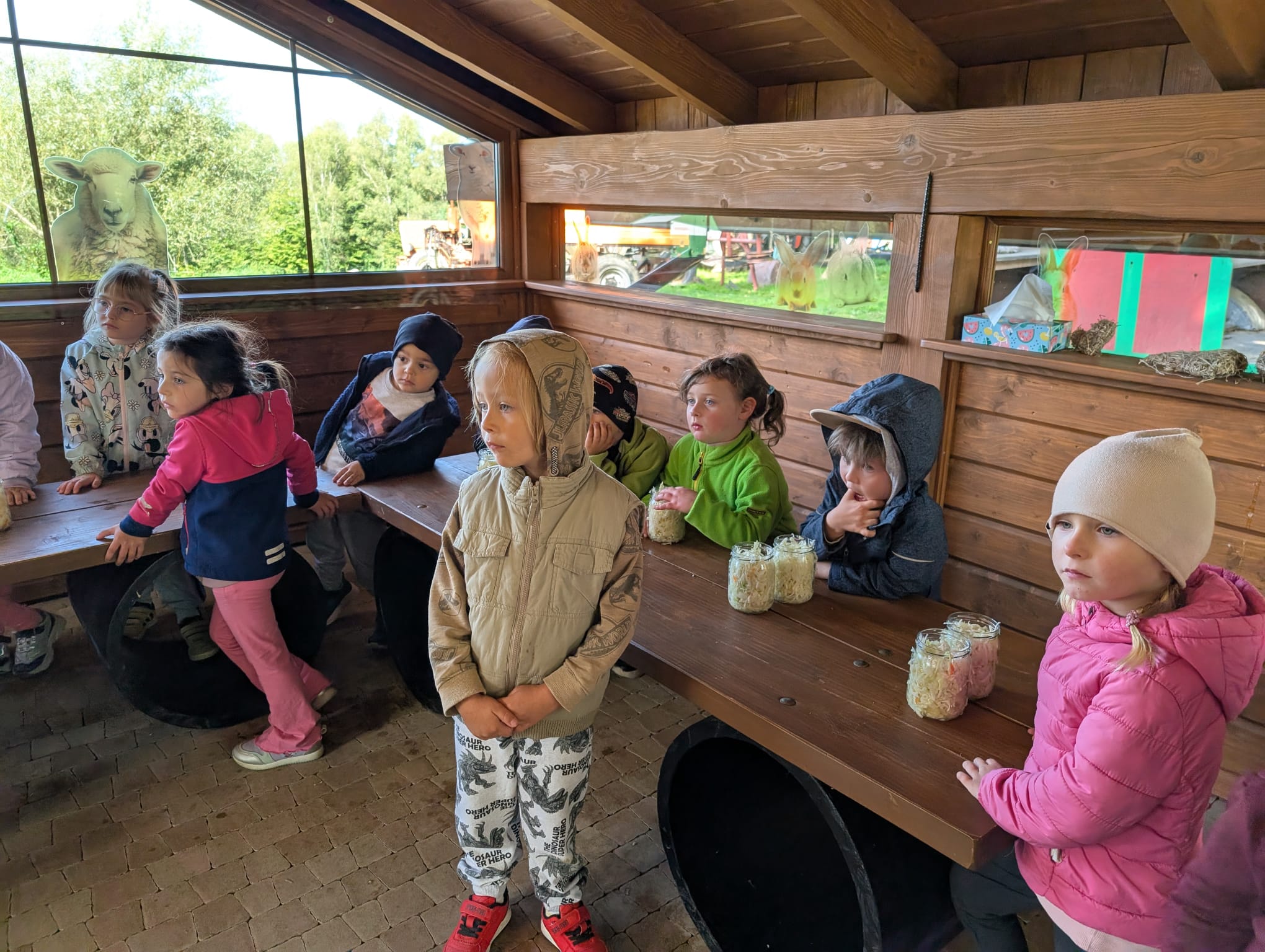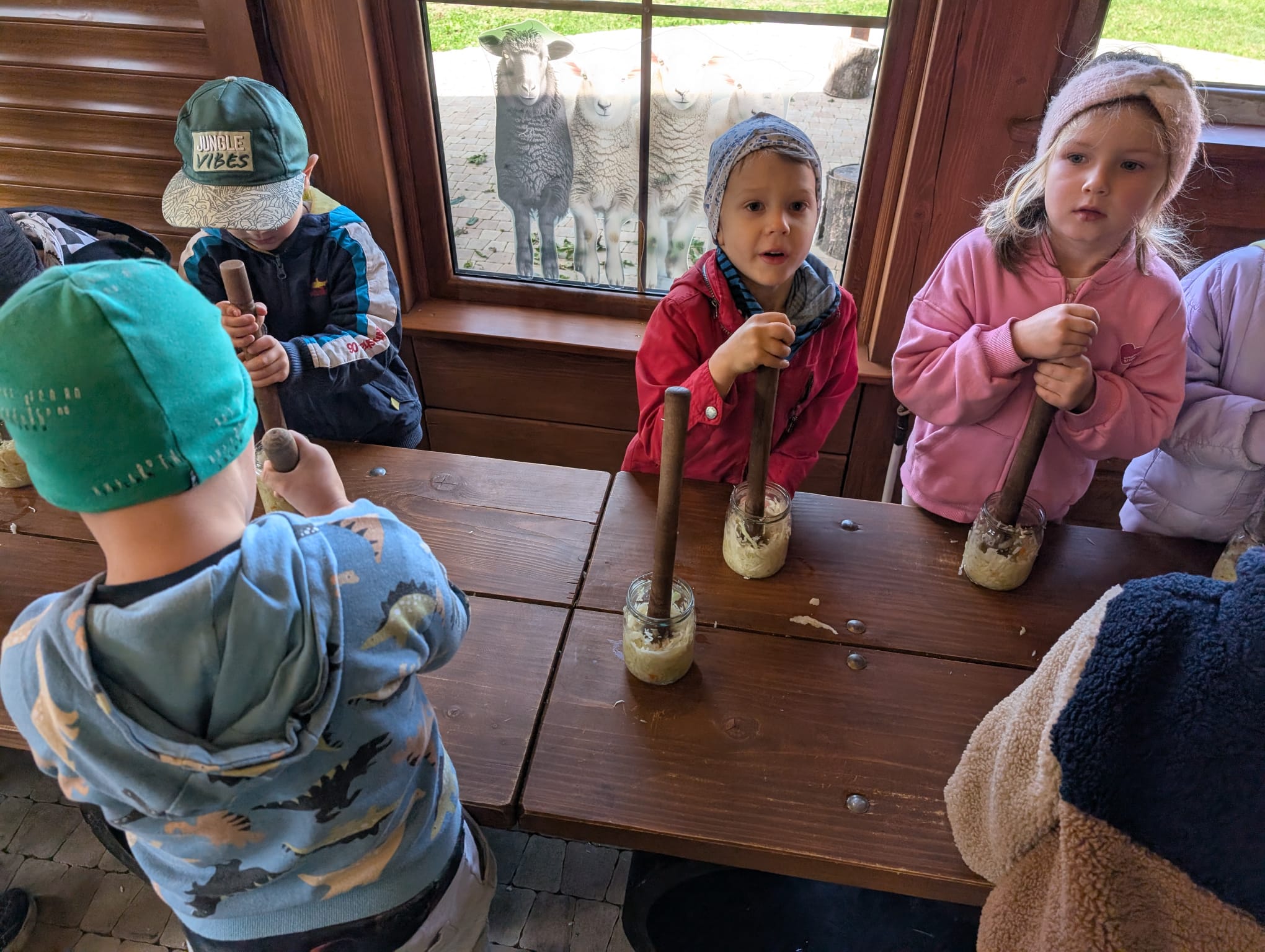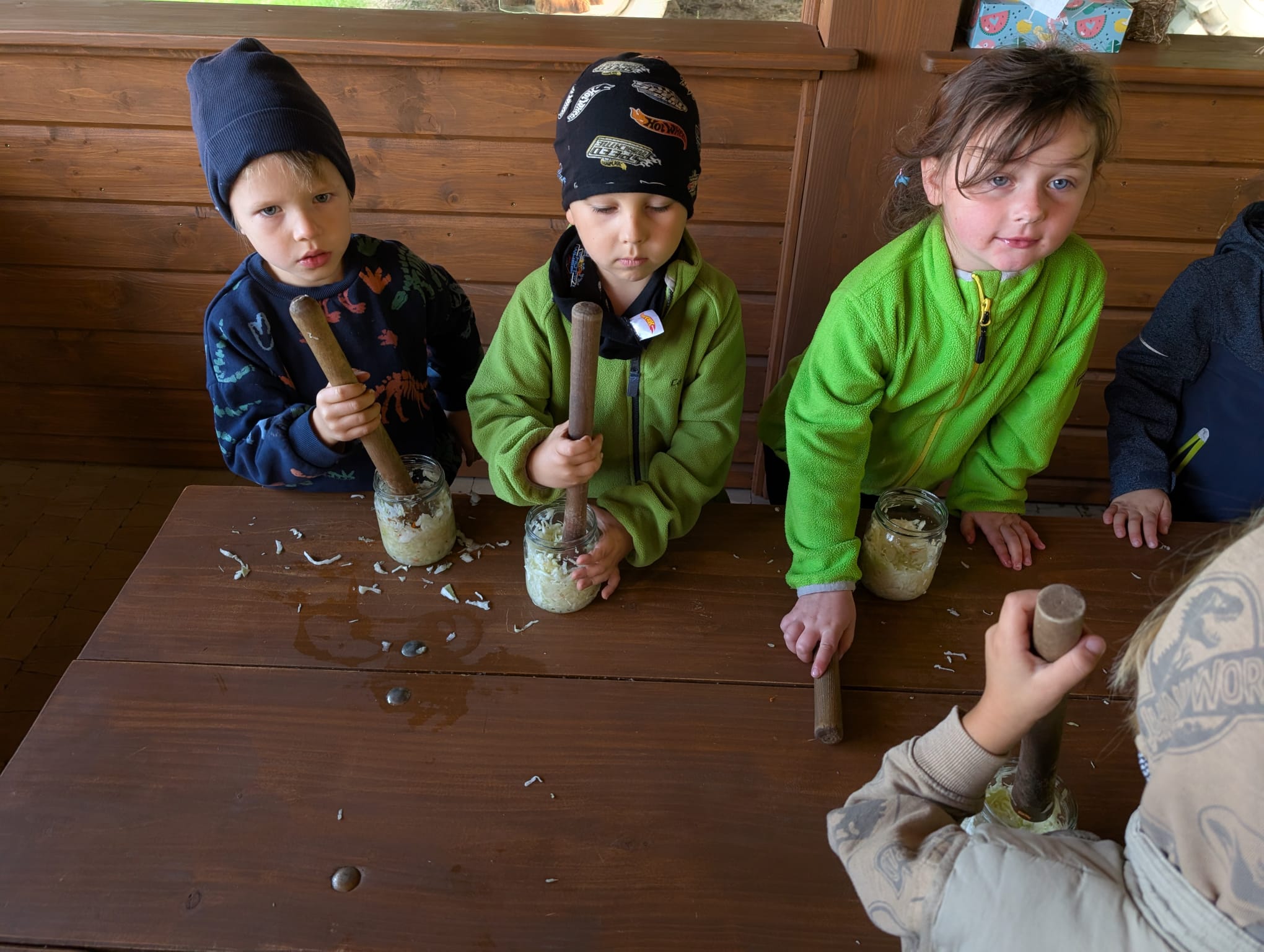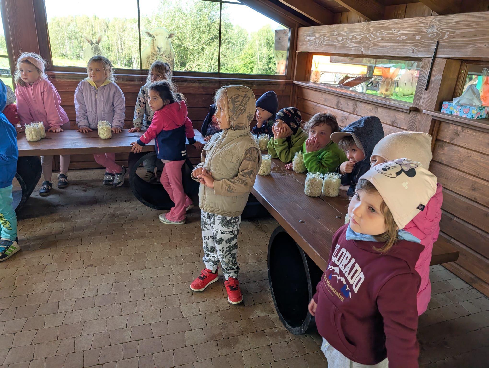 Na miejscu czekało mnóstwo ciekawych aktywności. Żabki z dużym zaangażowaniem brały udział w kiszeniu kapusty, poznając krok po kroku, jak dawniej przygotowywano zapasy na zimę. To było nie tylko ciekawe, ale też zabawne – szczególnie podczas ubijania kapusty w słoikach. Chętne przedszkolaki ze smakiem degustowały kapustkę.