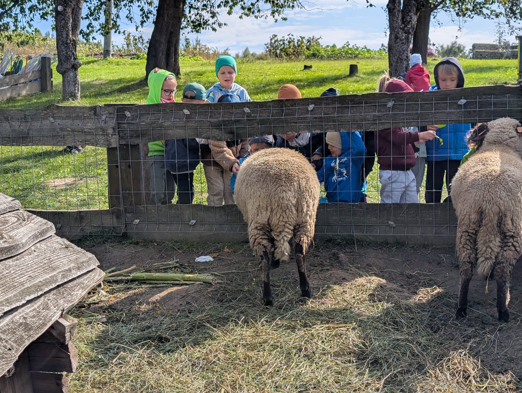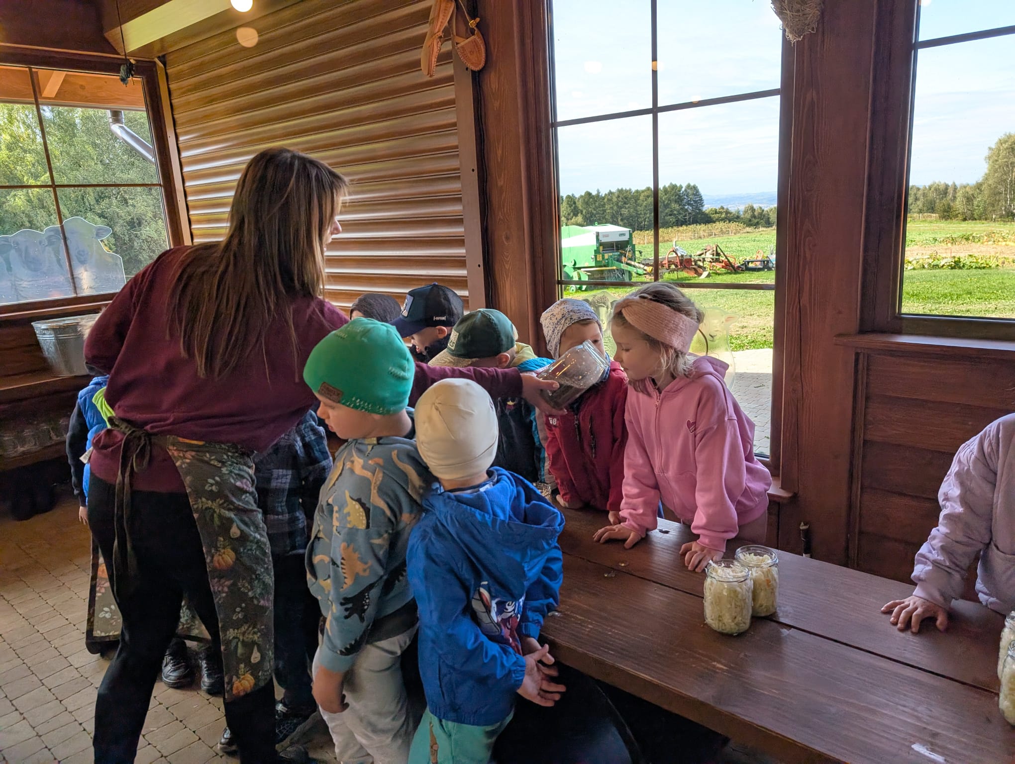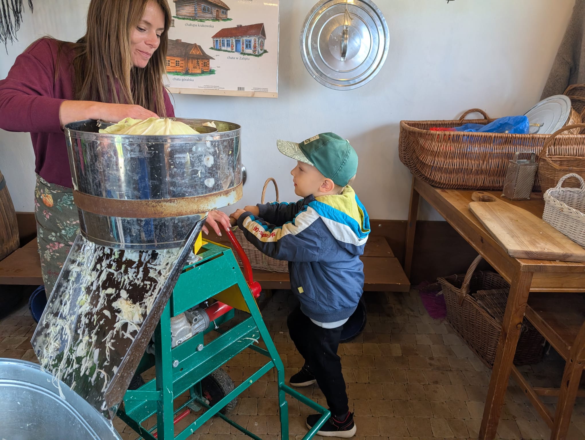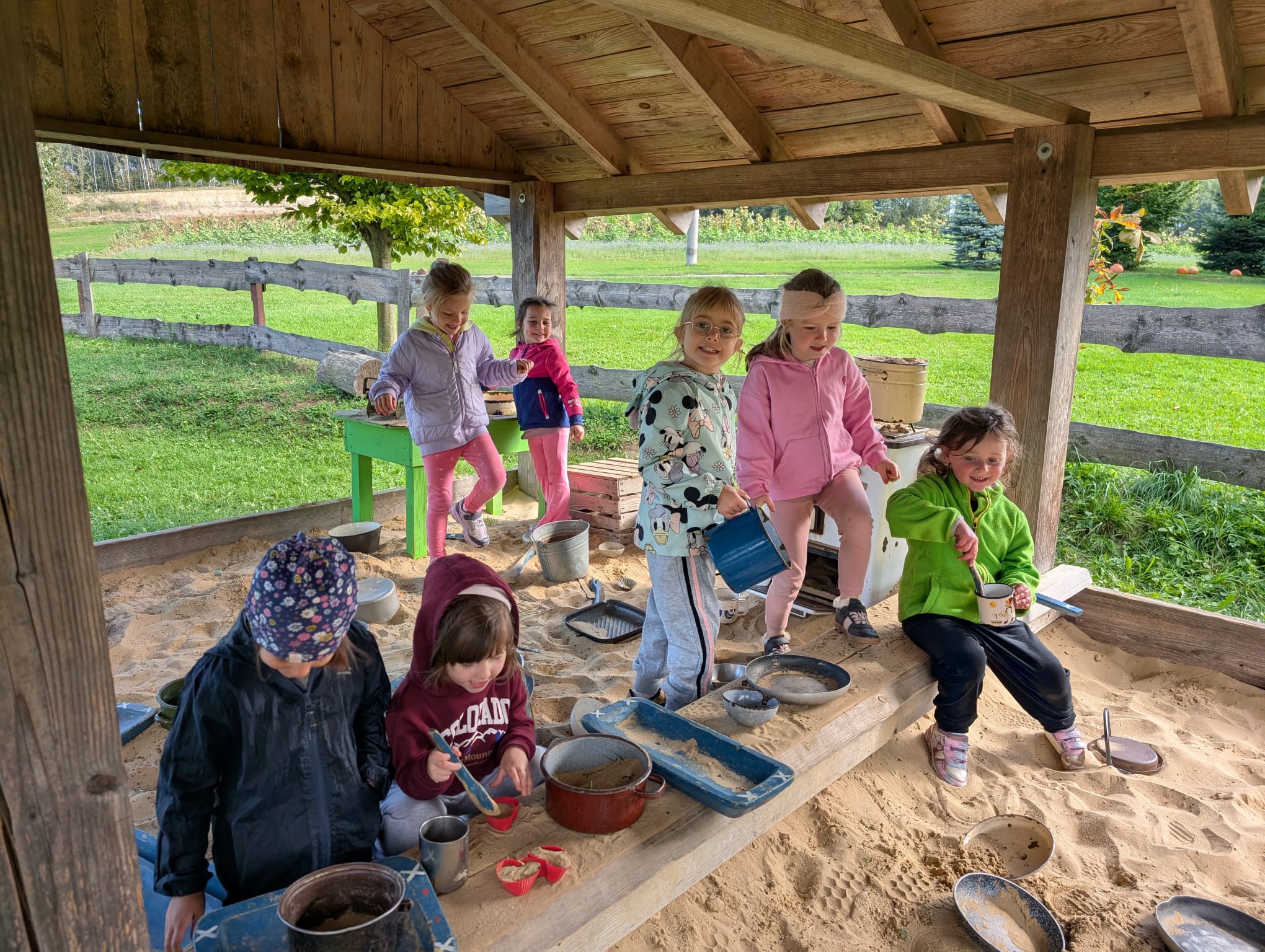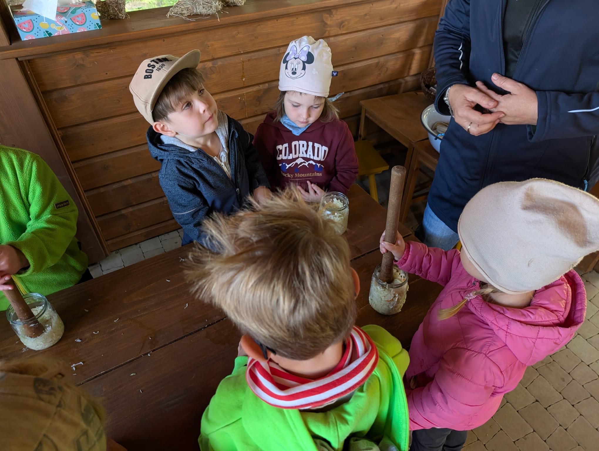 Na miejscu czekało mnóstwo ciekawych aktywności. Żabki z dużym zaangażowaniem brały udział w kiszeniu kapusty, poznając krok po kroku, jak dawniej przygotowywano zapasy na zimę. To było nie tylko ciekawe, ale też zabawne – szczególnie podczas ubijania kapusty w słoikach. Chętne przedszkolaki ze smakiem degustowały kapustkę.