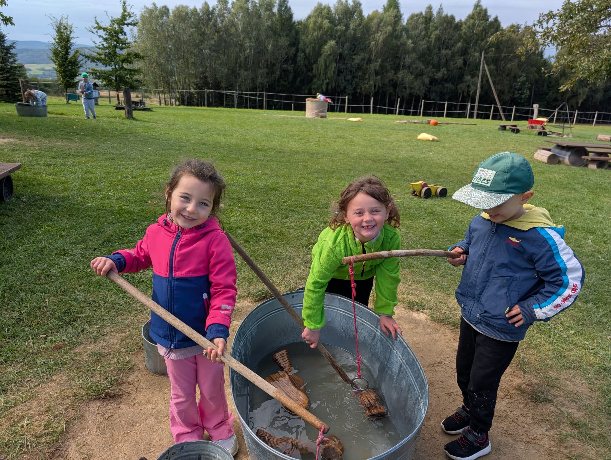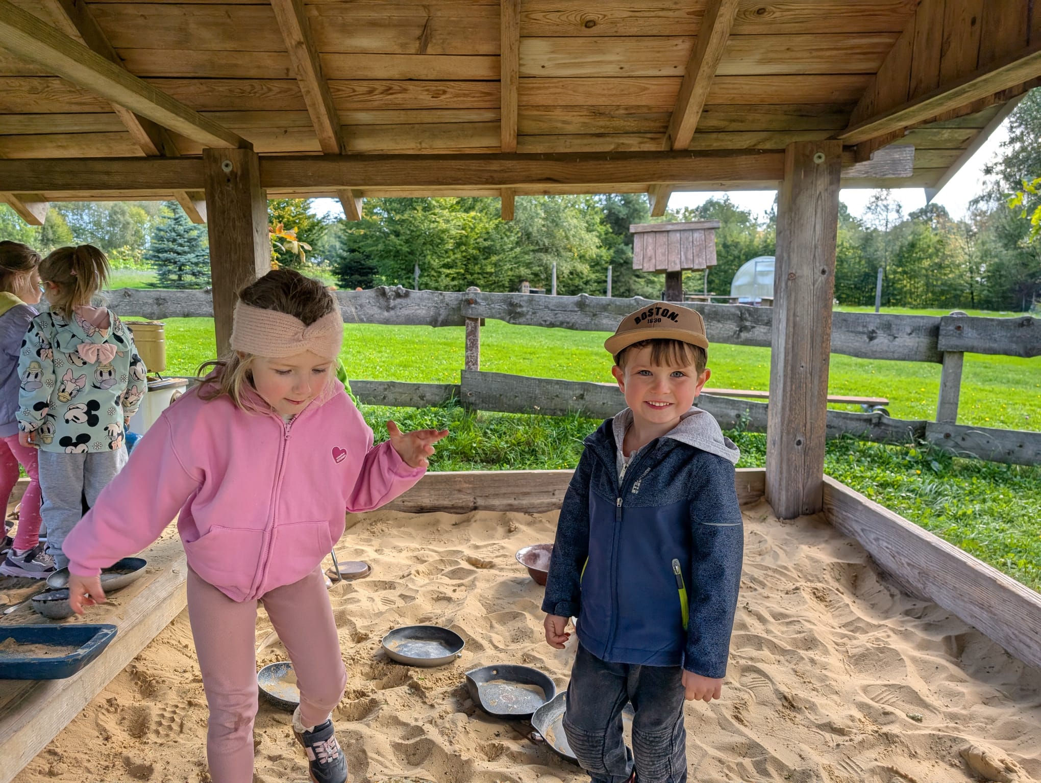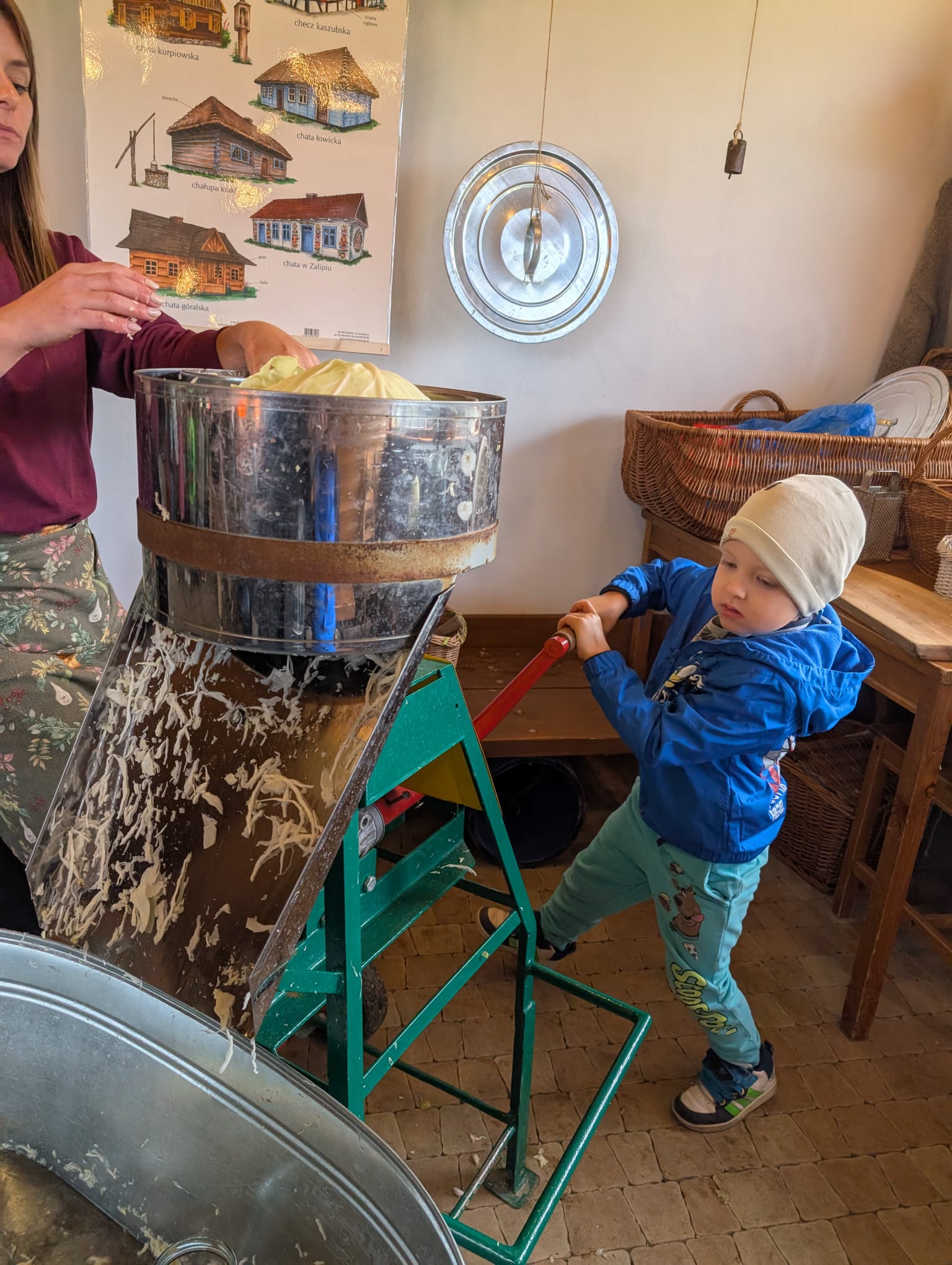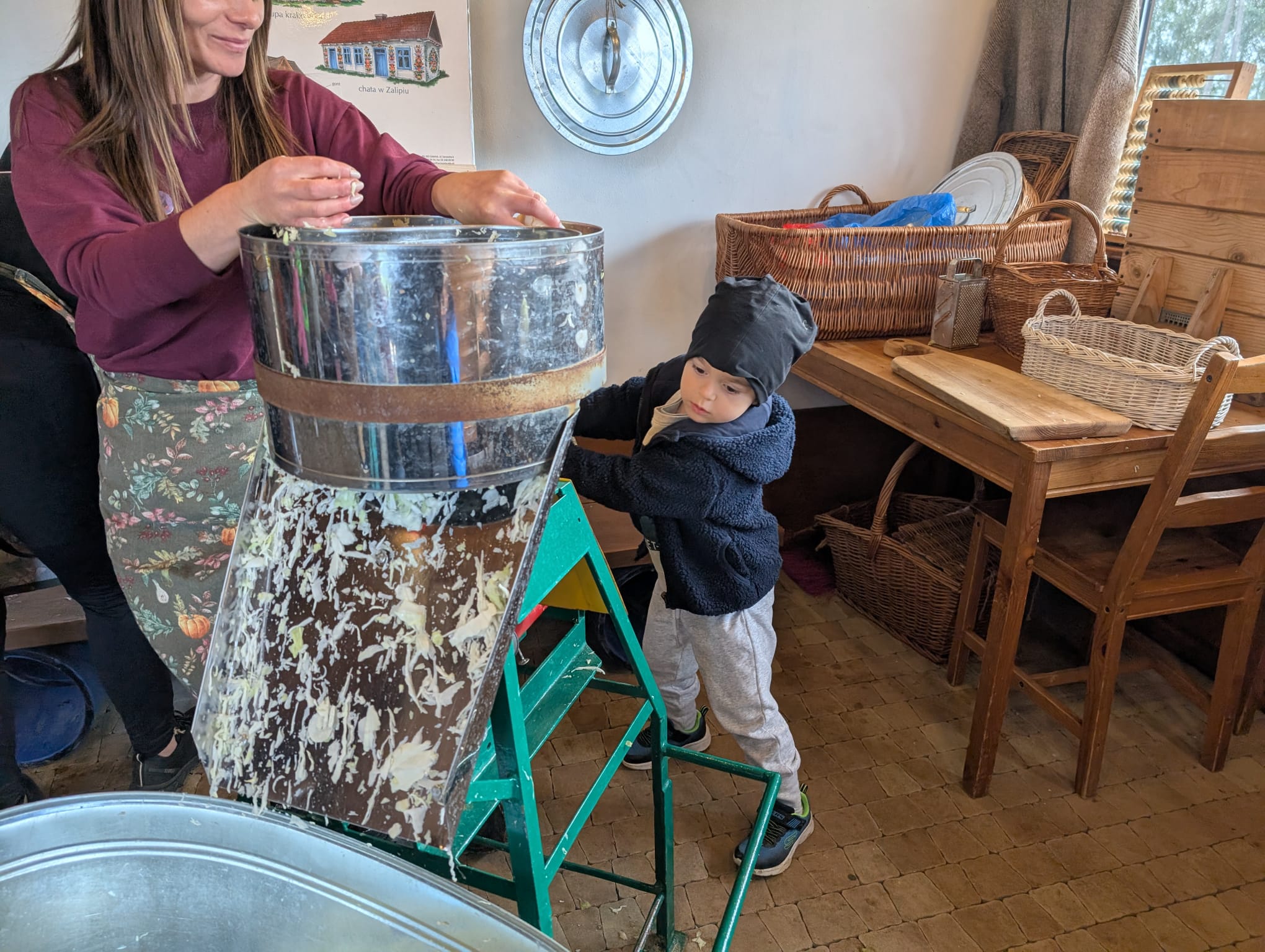 Na miejscu czekało mnóstwo ciekawych aktywności. Żabki z dużym zaangażowaniem brały udział w kiszeniu kapusty, poznając krok po kroku, jak dawniej przygotowywano zapasy na zimę. To było nie tylko ciekawe, ale też zabawne – szczególnie podczas ubijania kapusty w słoikach. Chętne przedszkolaki ze smakiem degustowały kapustkę.