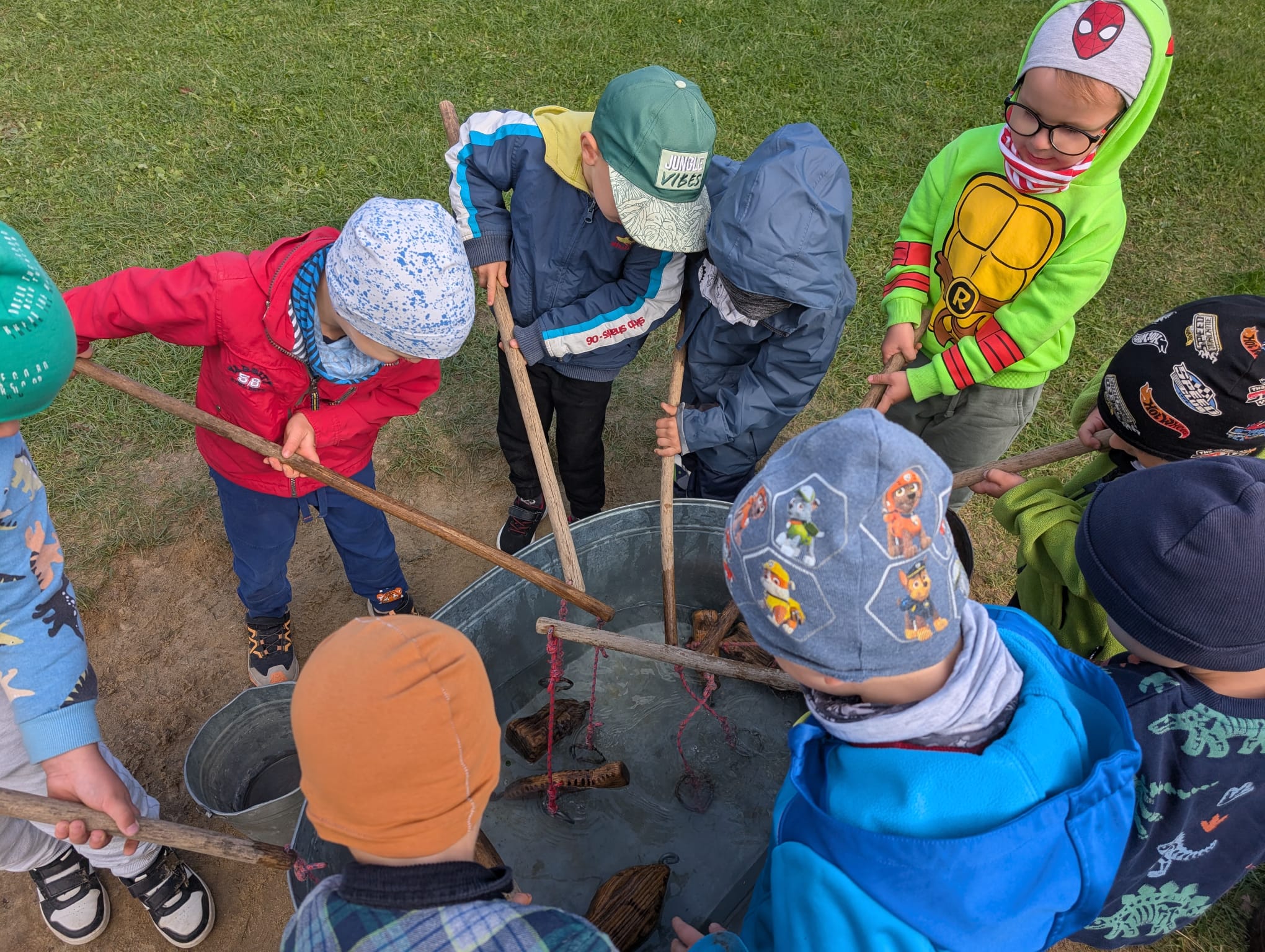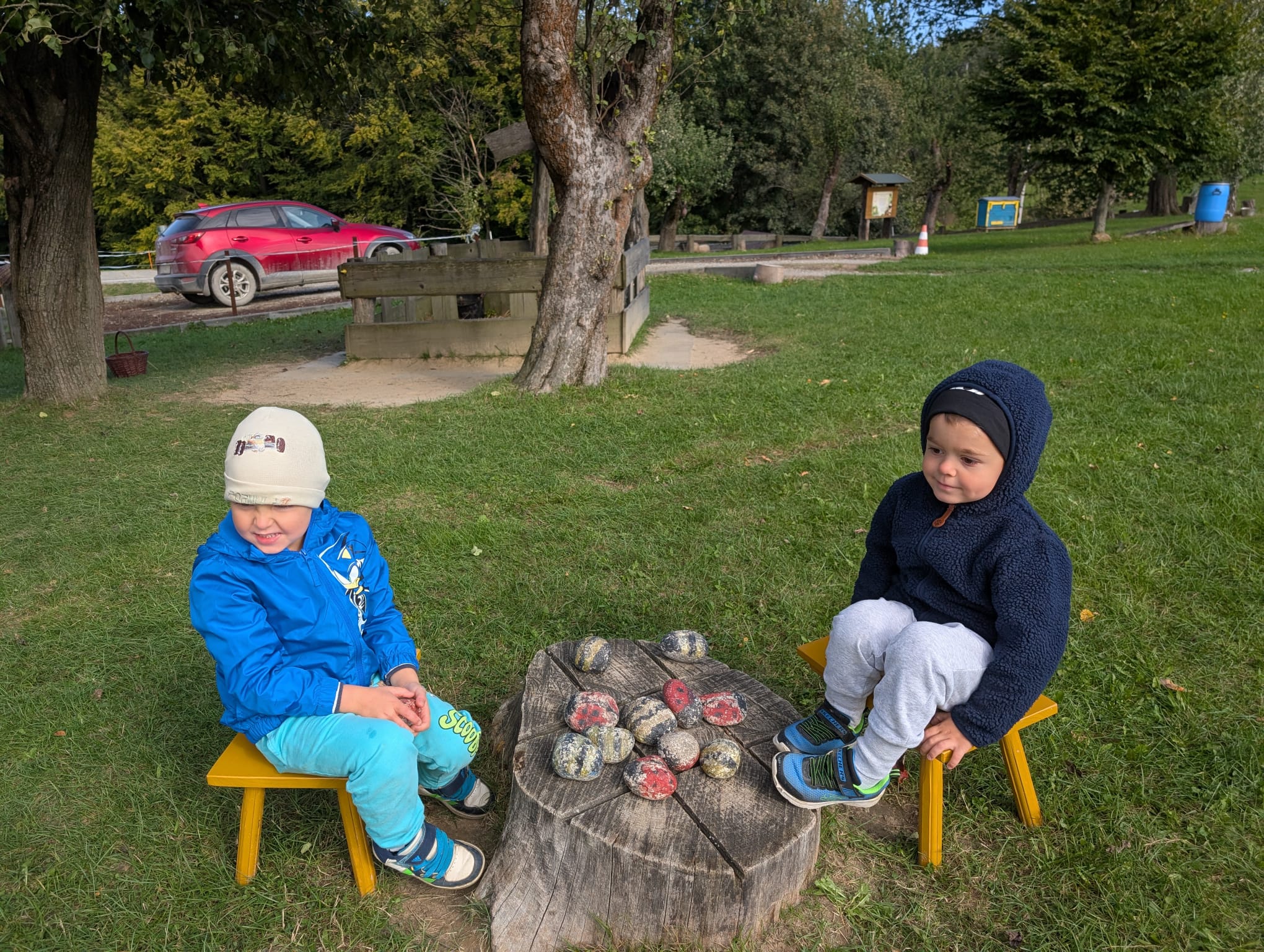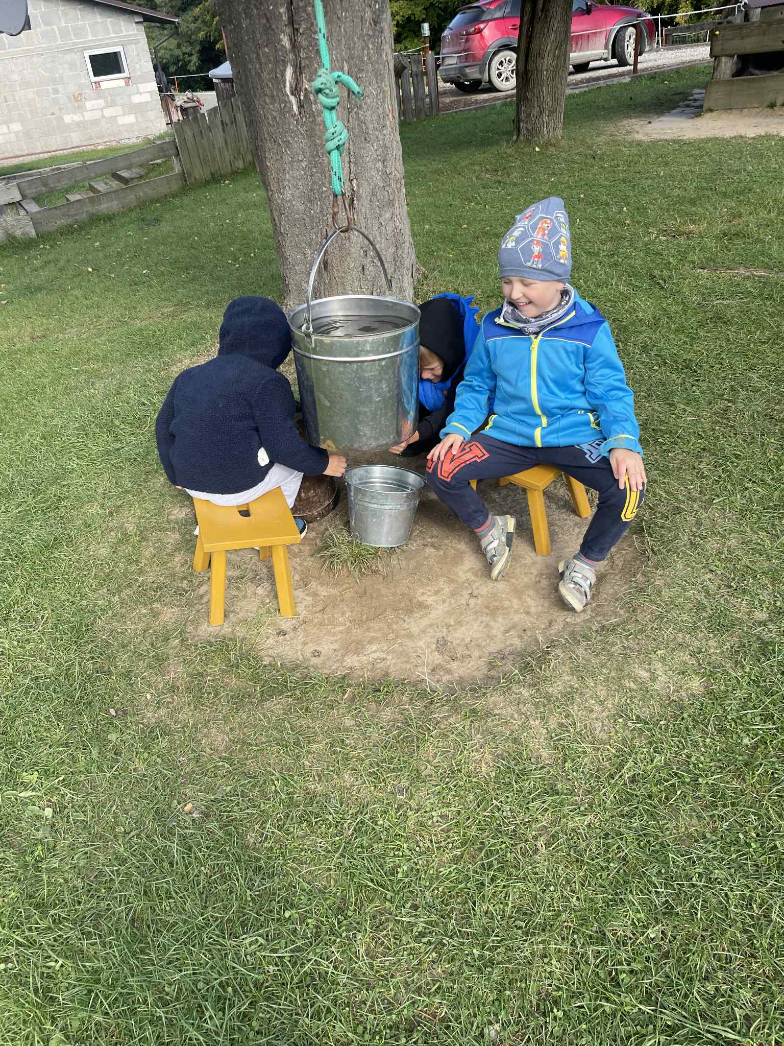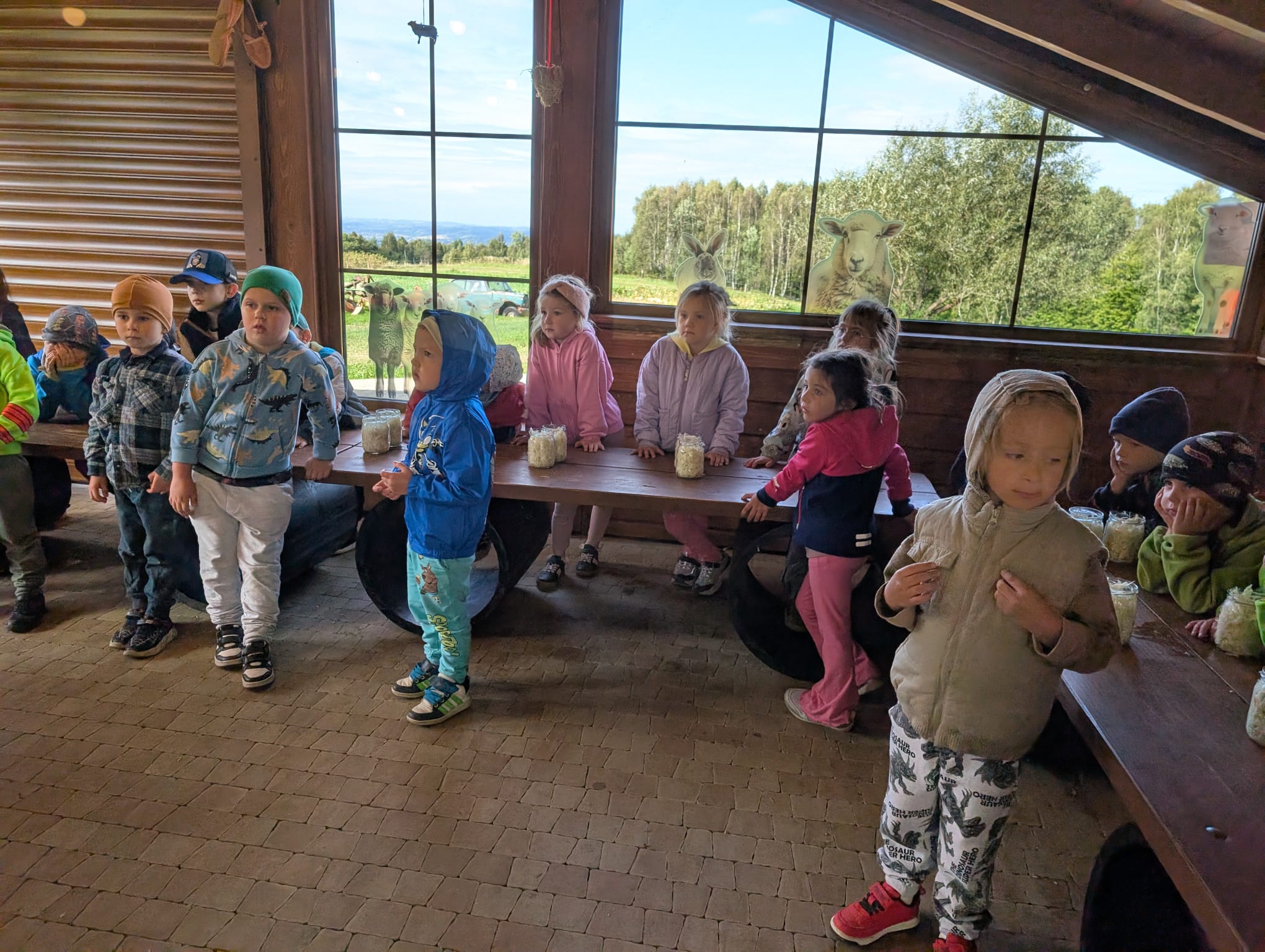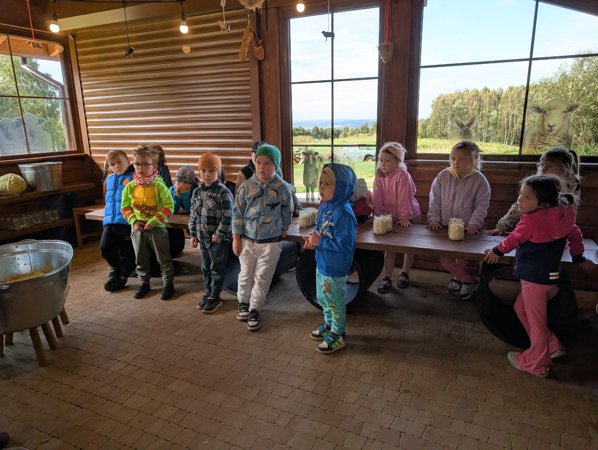 Na miejscu czekało mnóstwo ciekawych aktywności. Żabki z dużym zaangażowaniem brały udział w kiszeniu kapusty, poznając krok po kroku, jak dawniej przygotowywano zapasy na zimę. To było nie tylko ciekawe, ale też zabawne – szczególnie podczas ubijania kapusty w słoikach. Chętne przedszkolaki ze smakiem degustowały kapustkę.