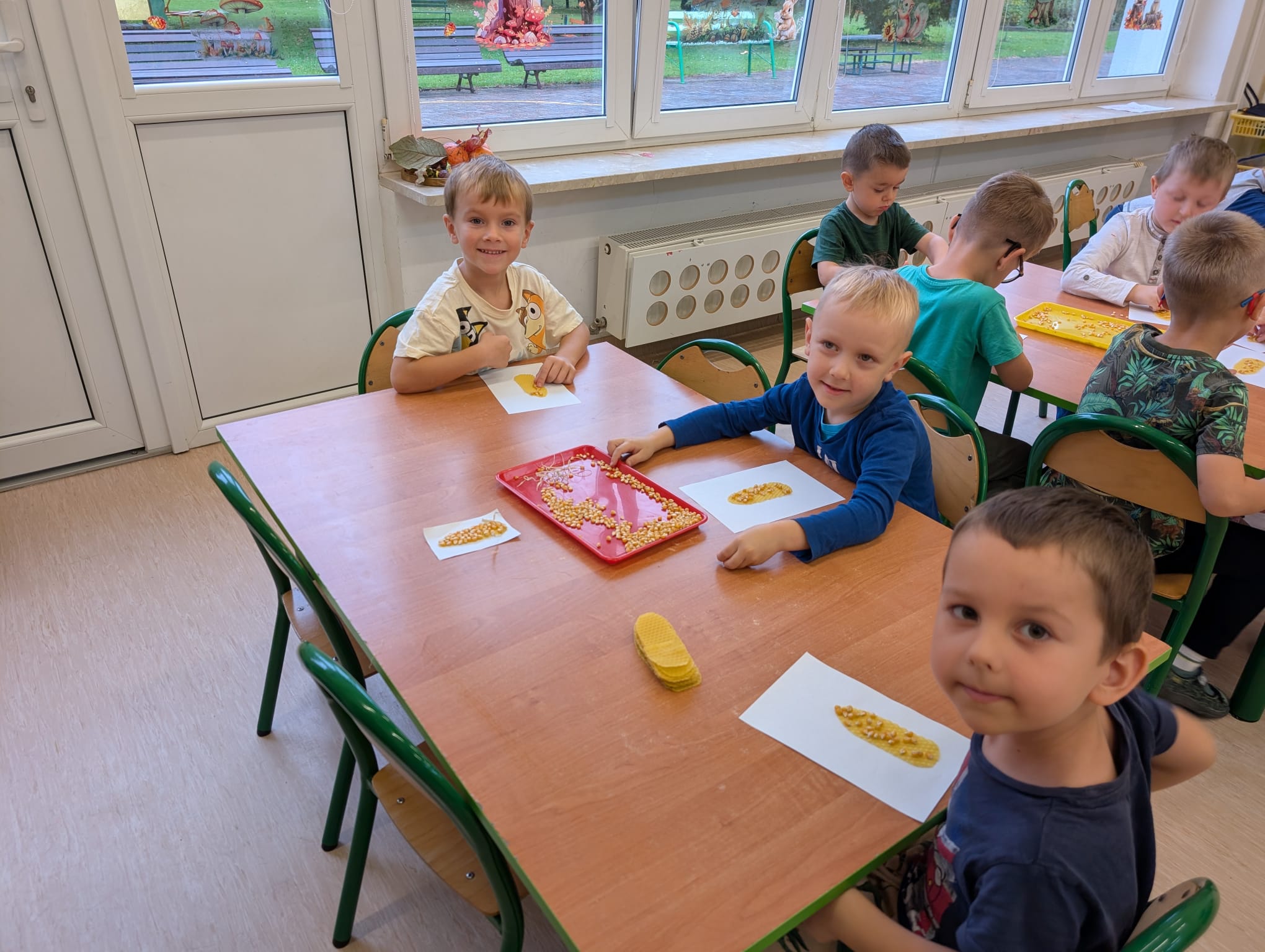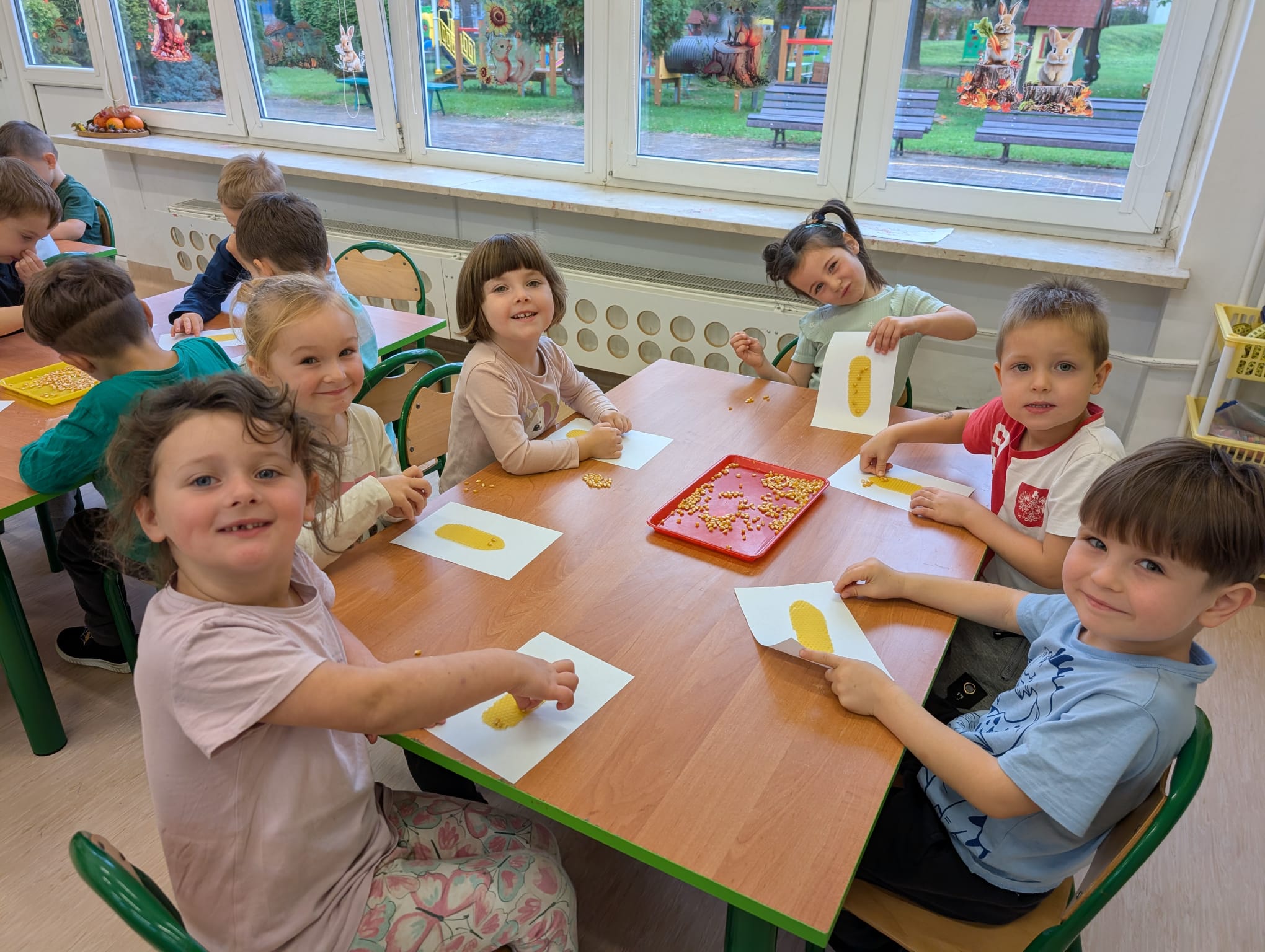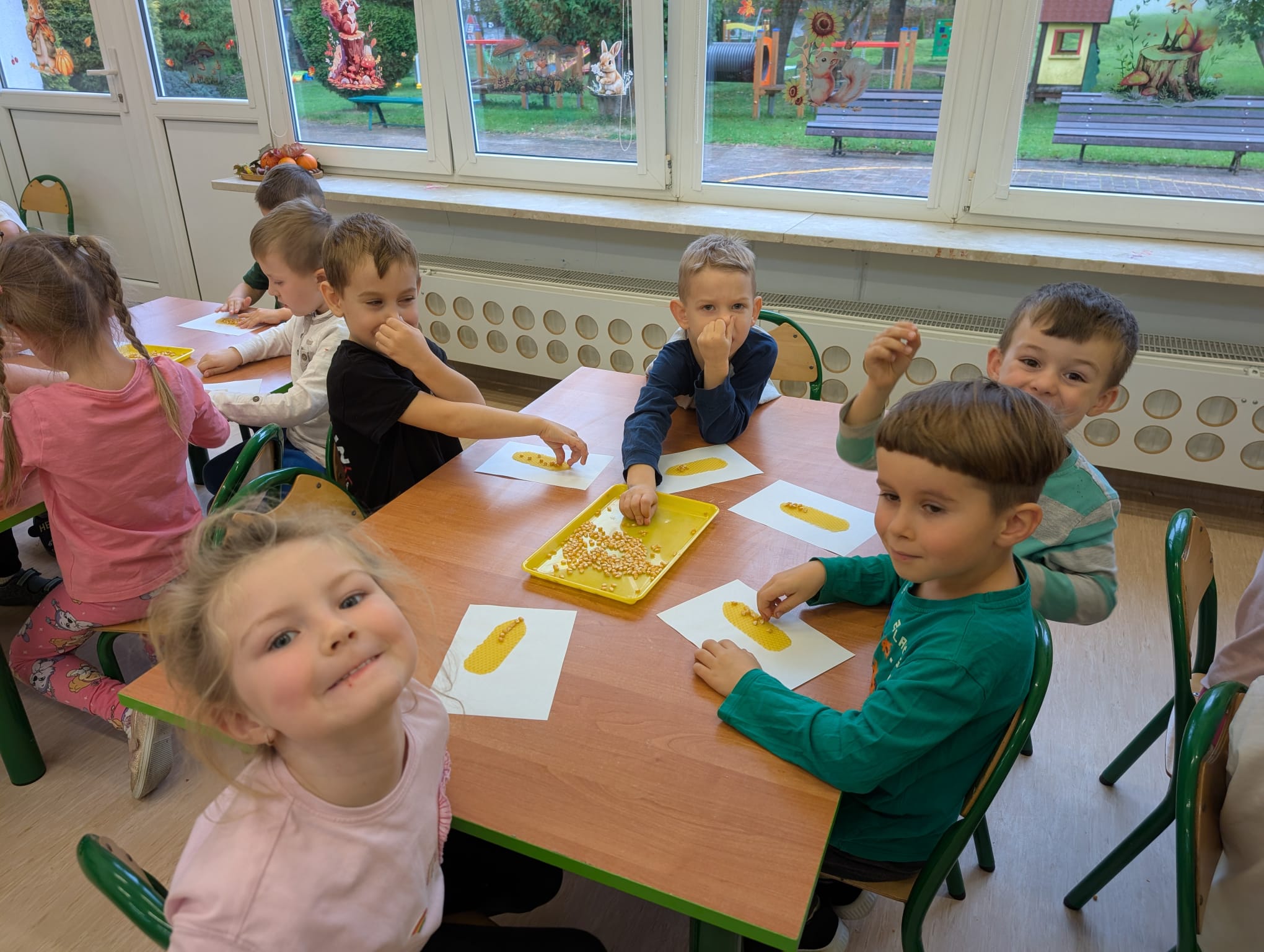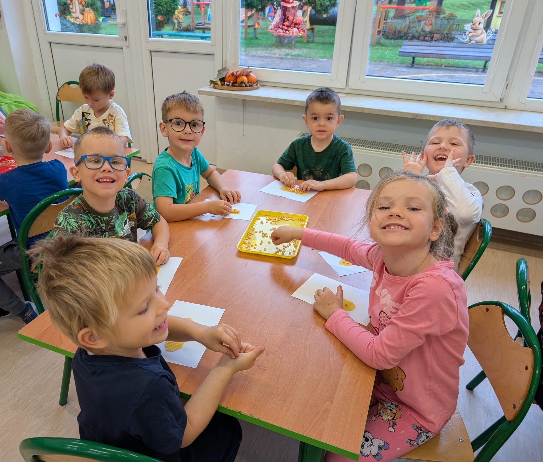 W minionym tygodniu grupa Żabek miała wyjątkowe zajęcia dydaktyczne z Panią Asią, która odbywa praktyki w naszym przedszkolu. Bohaterką tego dnia była... kukurydza! Dzieci miały okazję poznać to warzywo wszystkimi zmysłami – dotykały, wąchały, oglądały, a także dzieliły się swoimi doświadczeniami z domowej kuchni i ogrodu. W części techniczno-sensorycznej przedszkolaki wykonały niezwykłą pracę plastyczną – wyklejały ziarenkami kukurydzy przygotowaną powierzchnię z naturalnym woskiem pszczelim. Przy tej okazji dowiedziały się, skąd pochodzi taki wosk i jak pracowite są pszczoły, by go wytworzyć! Dzieci z ogromną precyzją wypełniały każdą wolną przestrzeń, ćwicząc koncentrację, cierpliwość oraz motorykę małą i precyzyjną sprawność dłoni – tak ważną w przygotowaniu do nauki pisania. Na zakończenie zajęć czekała na Żabki niespodzianka – maszyna do popcornu! Dzieci z zaciekawieniem obserwowały proces prażenia ziaren, a potem z wielką radością degustowały świeżo przygotowany popcorn. Było pysznie, pachnąco i bardzo edukacyjnie! Takie zajęcia to nie tylko nauka, ale też radość odkrywania świata wszystkimi zmysłami!