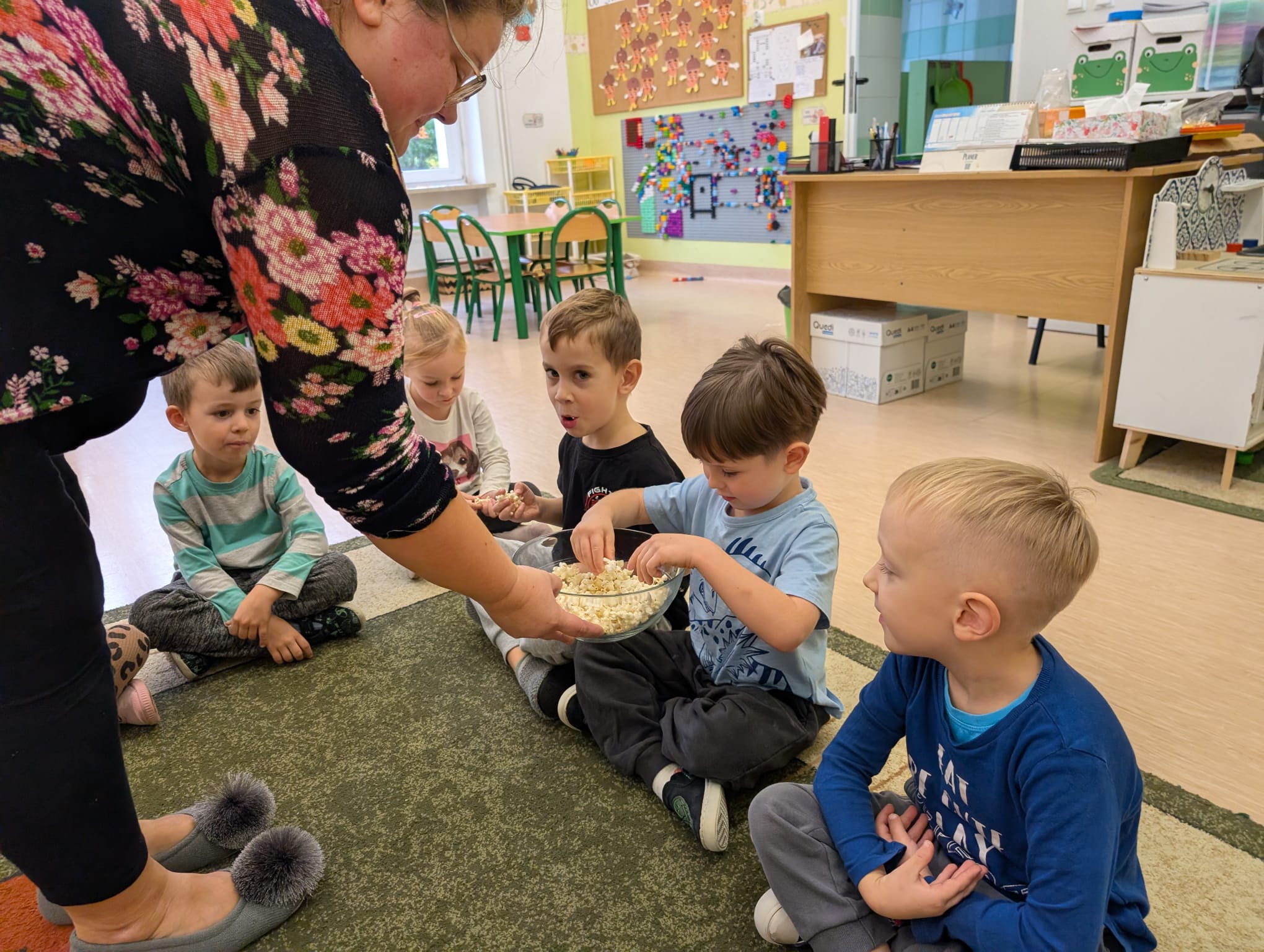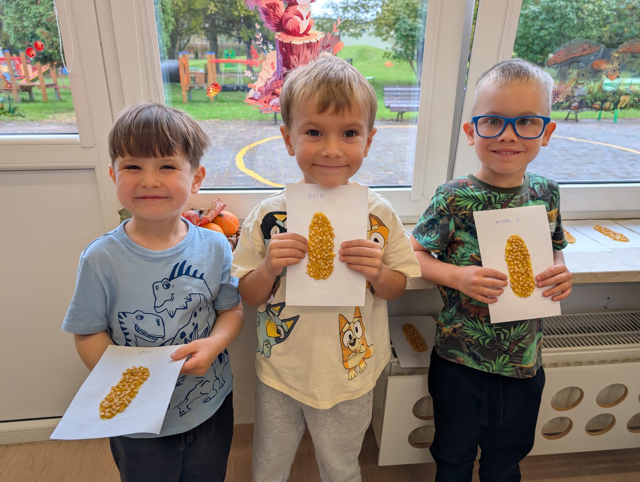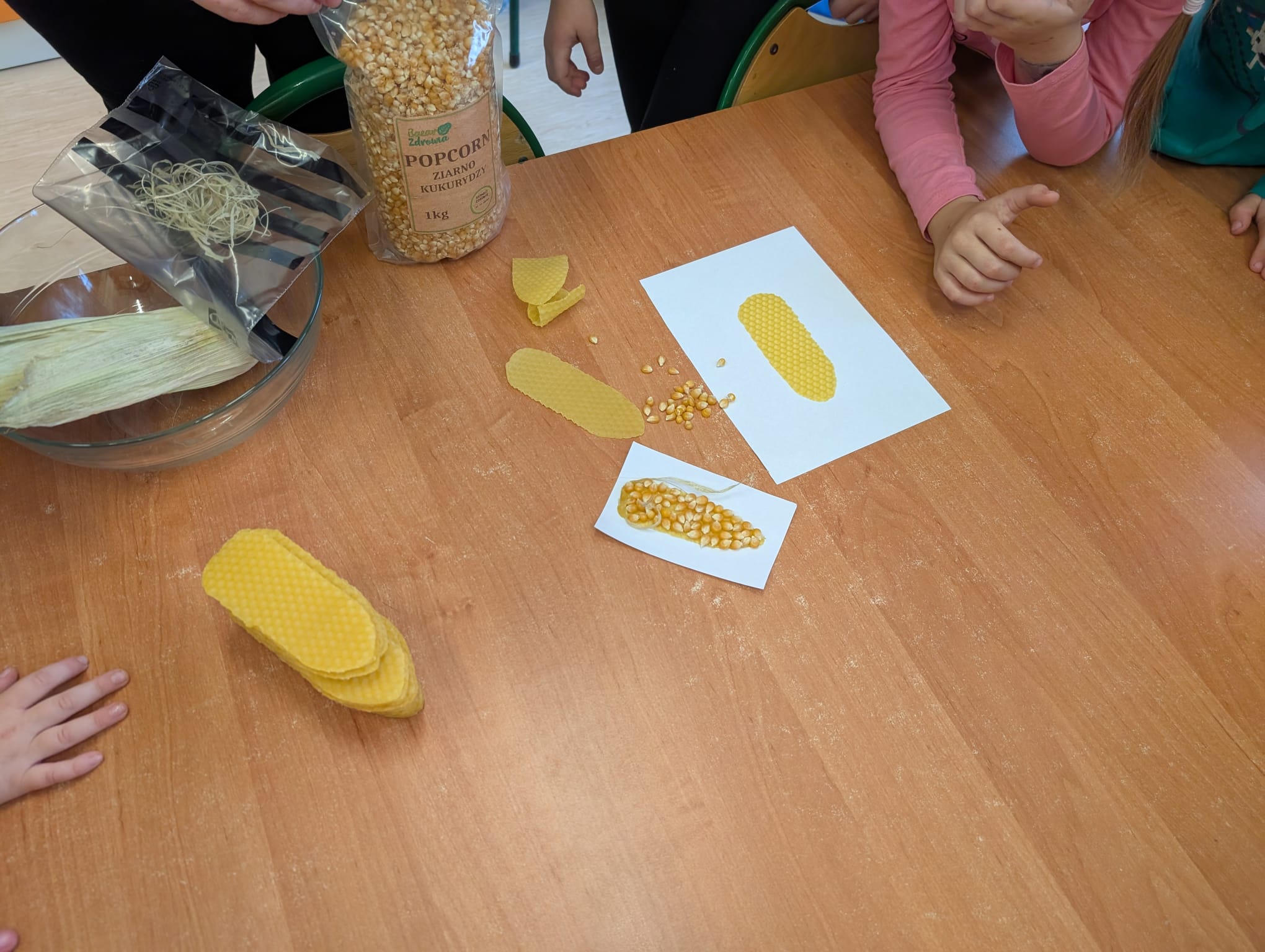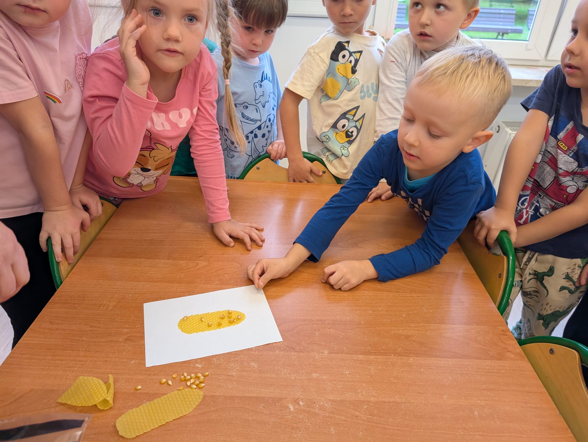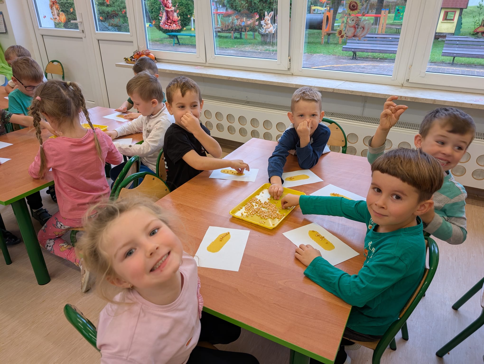 W minionym tygodniu grupa Żabek miała wyjątkowe zajęcia dydaktyczne z Panią Asią, która odbywa praktyki w naszym przedszkolu. Bohaterką tego dnia była... kukurydza! Dzieci miały okazję poznać to warzywo wszystkimi zmysłami – dotykały, wąchały, oglądały, a także dzieliły się swoimi doświadczeniami z domowej kuchni i ogrodu. W części techniczno-sensorycznej przedszkolaki wykonały niezwykłą pracę plastyczną – wyklejały ziarenkami kukurydzy przygotowaną powierzchnię z naturalnym woskiem pszczelim. Przy tej okazji dowiedziały się, skąd pochodzi taki wosk i jak pracowite są pszczoły, by go wytworzyć! Dzieci z ogromną precyzją wypełniały każdą wolną przestrzeń, ćwicząc koncentrację, cierpliwość oraz motorykę małą i precyzyjną sprawność dłoni – tak ważną w przygotowaniu do nauki pisania. Na zakończenie zajęć czekała na Żabki niespodzianka – maszyna do popcornu! Dzieci z zaciekawieniem obserwowały proces prażenia ziaren, a potem z wielką radością degustowały świeżo przygotowany popcorn. Było pysznie, pachnąco i bardzo edukacyjnie! Takie zajęcia to nie tylko nauka, ale też radość odkrywania świata wszystkimi zmysłami!