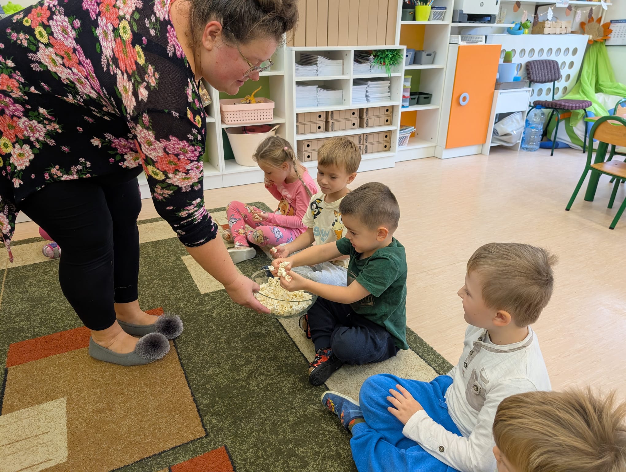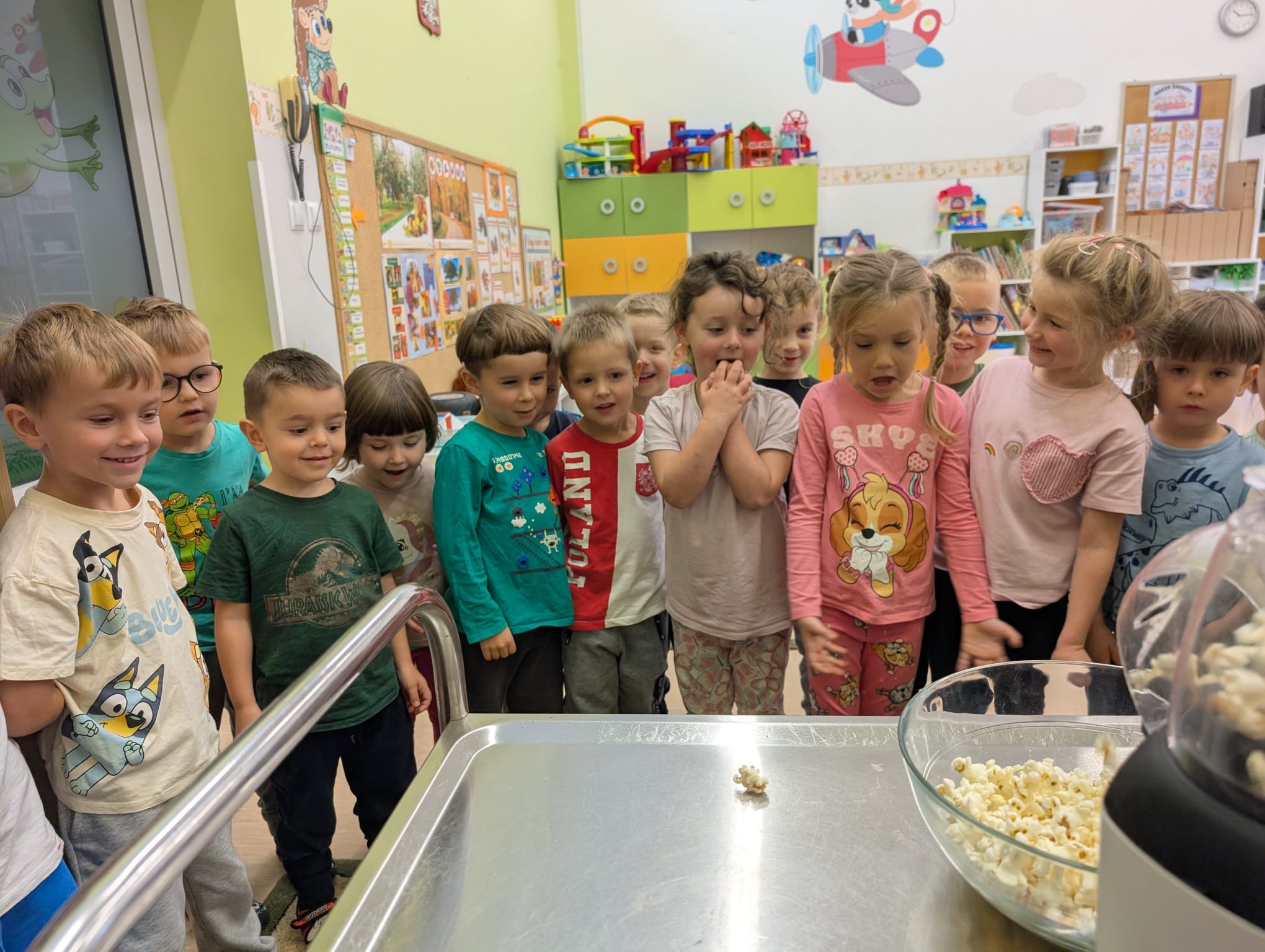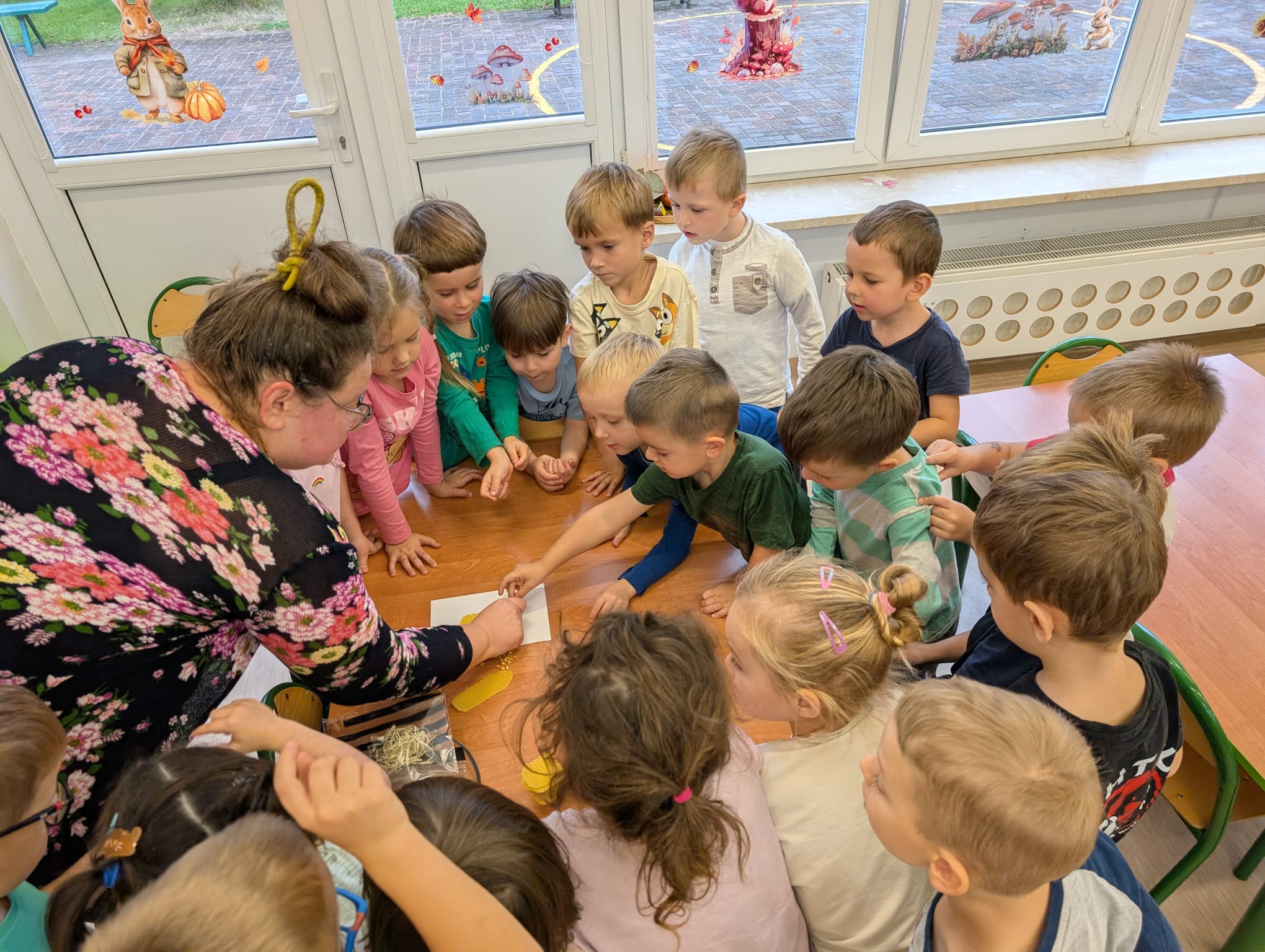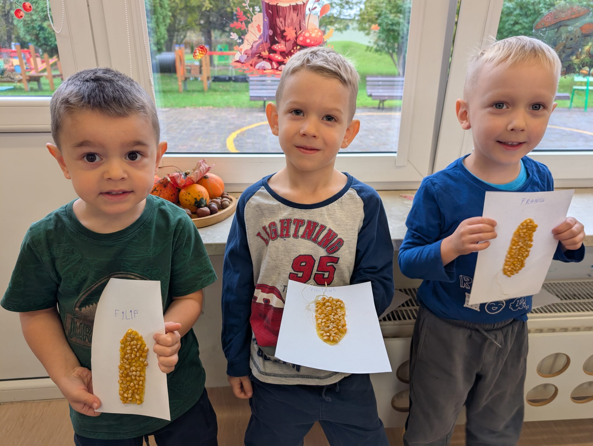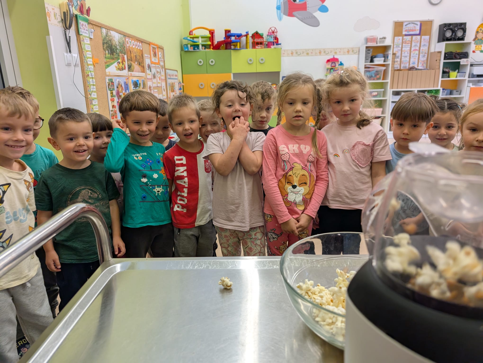 W minionym tygodniu grupa Żabek miała wyjątkowe zajęcia dydaktyczne z Panią Asią, która odbywa praktyki w naszym przedszkolu. Bohaterką tego dnia była... kukurydza! Dzieci miały okazję poznać to warzywo wszystkimi zmysłami – dotykały, wąchały, oglądały, a także dzieliły się swoimi doświadczeniami z domowej kuchni i ogrodu. W części techniczno-sensorycznej przedszkolaki wykonały niezwykłą pracę plastyczną – wyklejały ziarenkami kukurydzy przygotowaną powierzchnię z naturalnym woskiem pszczelim. Przy tej okazji dowiedziały się, skąd pochodzi taki wosk i jak pracowite są pszczoły, by go wytworzyć! Dzieci z ogromną precyzją wypełniały każdą wolną przestrzeń, ćwicząc koncentrację, cierpliwość oraz motorykę małą i precyzyjną sprawność dłoni – tak ważną w przygotowaniu do nauki pisania. Na zakończenie zajęć czekała na Żabki niespodzianka – maszyna do popcornu! Dzieci z zaciekawieniem obserwowały proces prażenia ziaren, a potem z wielką radością degustowały świeżo przygotowany popcorn. Było pysznie, pachnąco i bardzo edukacyjnie! Takie zajęcia to nie tylko nauka, ale też radość odkrywania świata wszystkimi zmysłami!