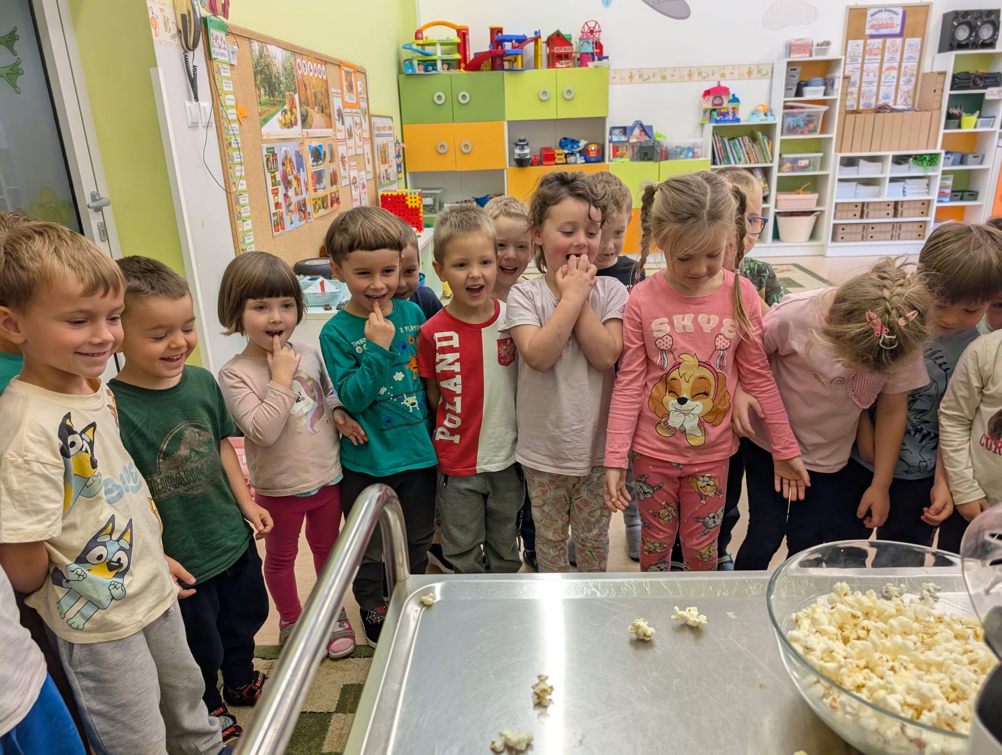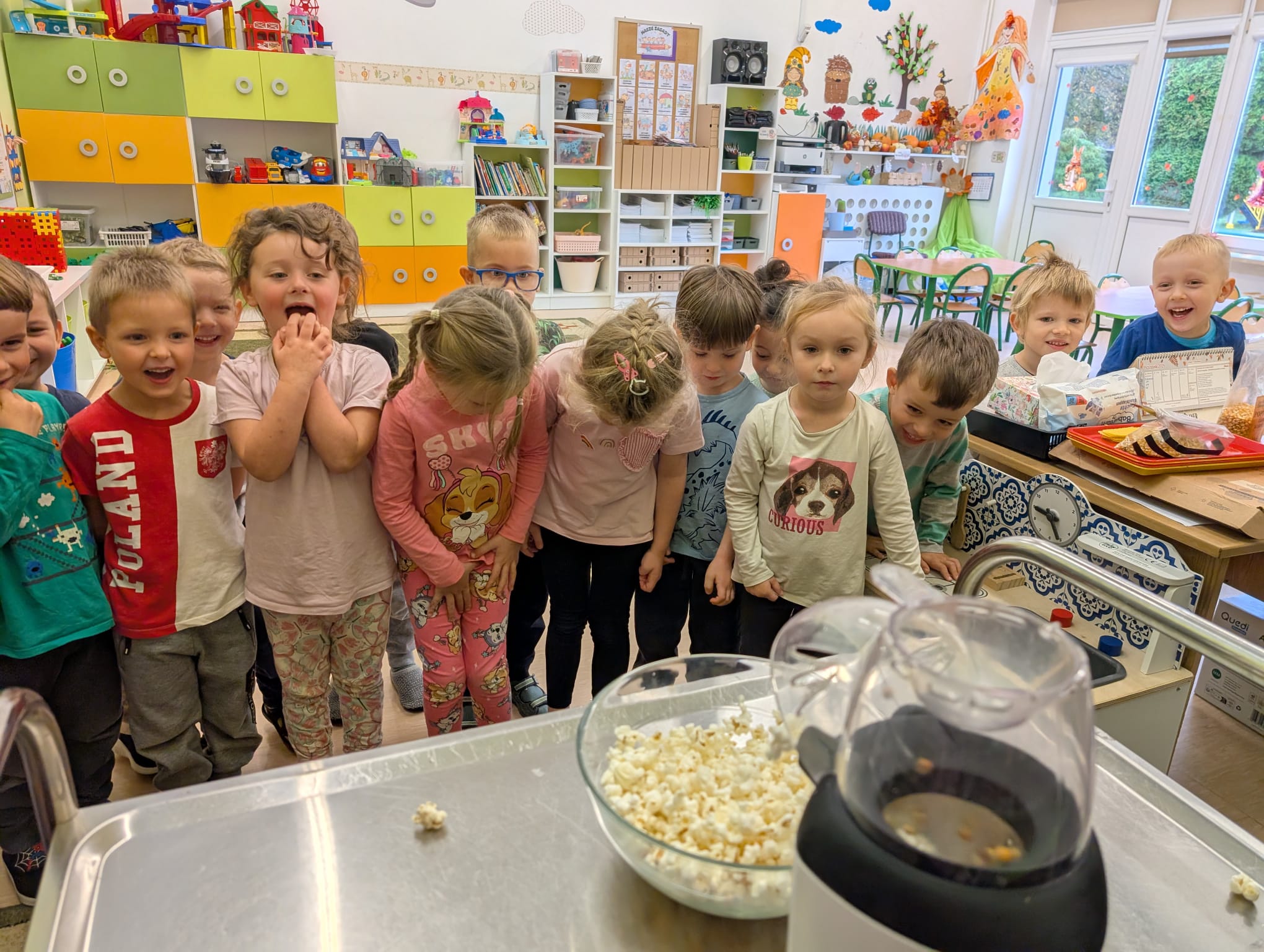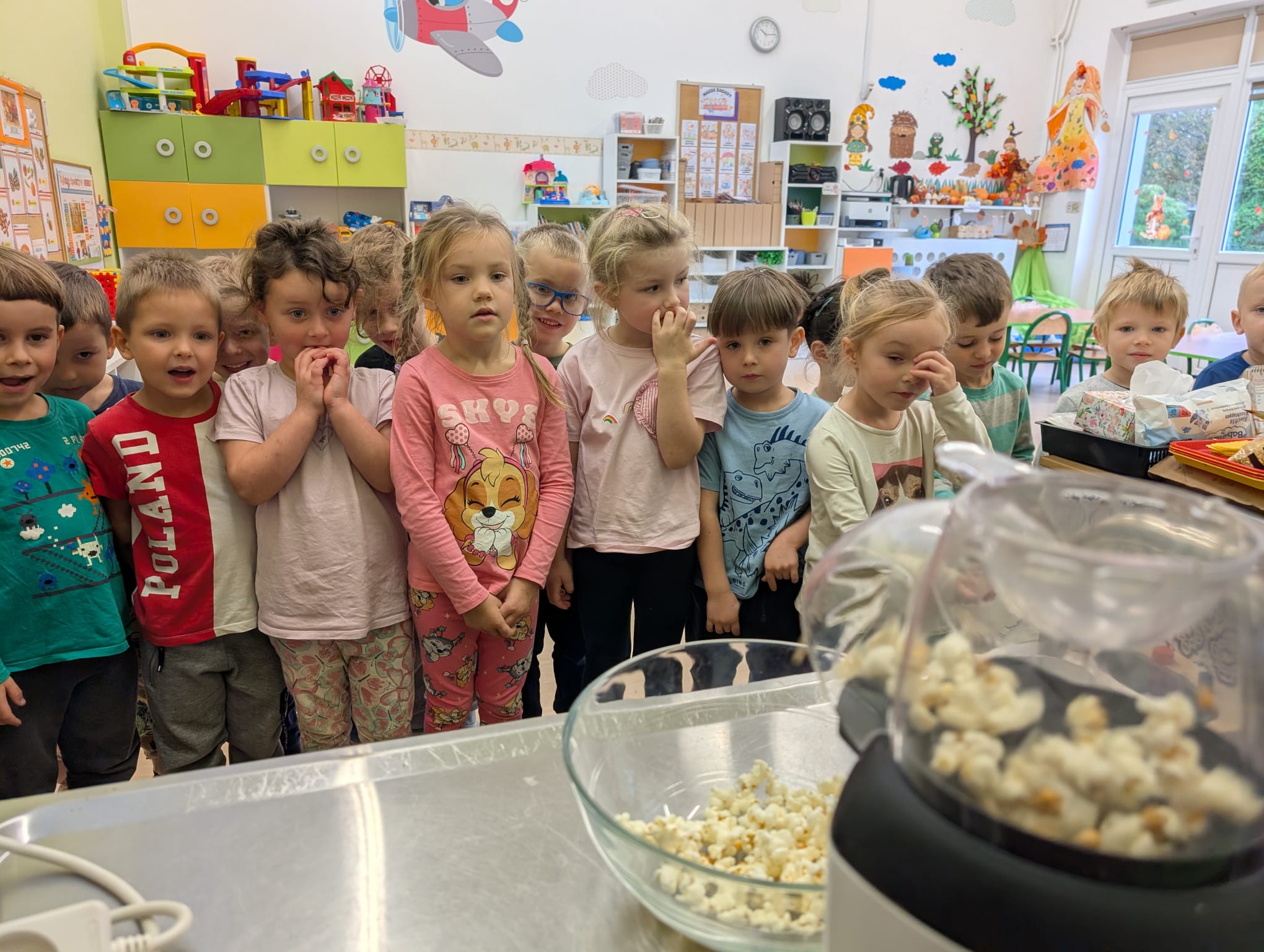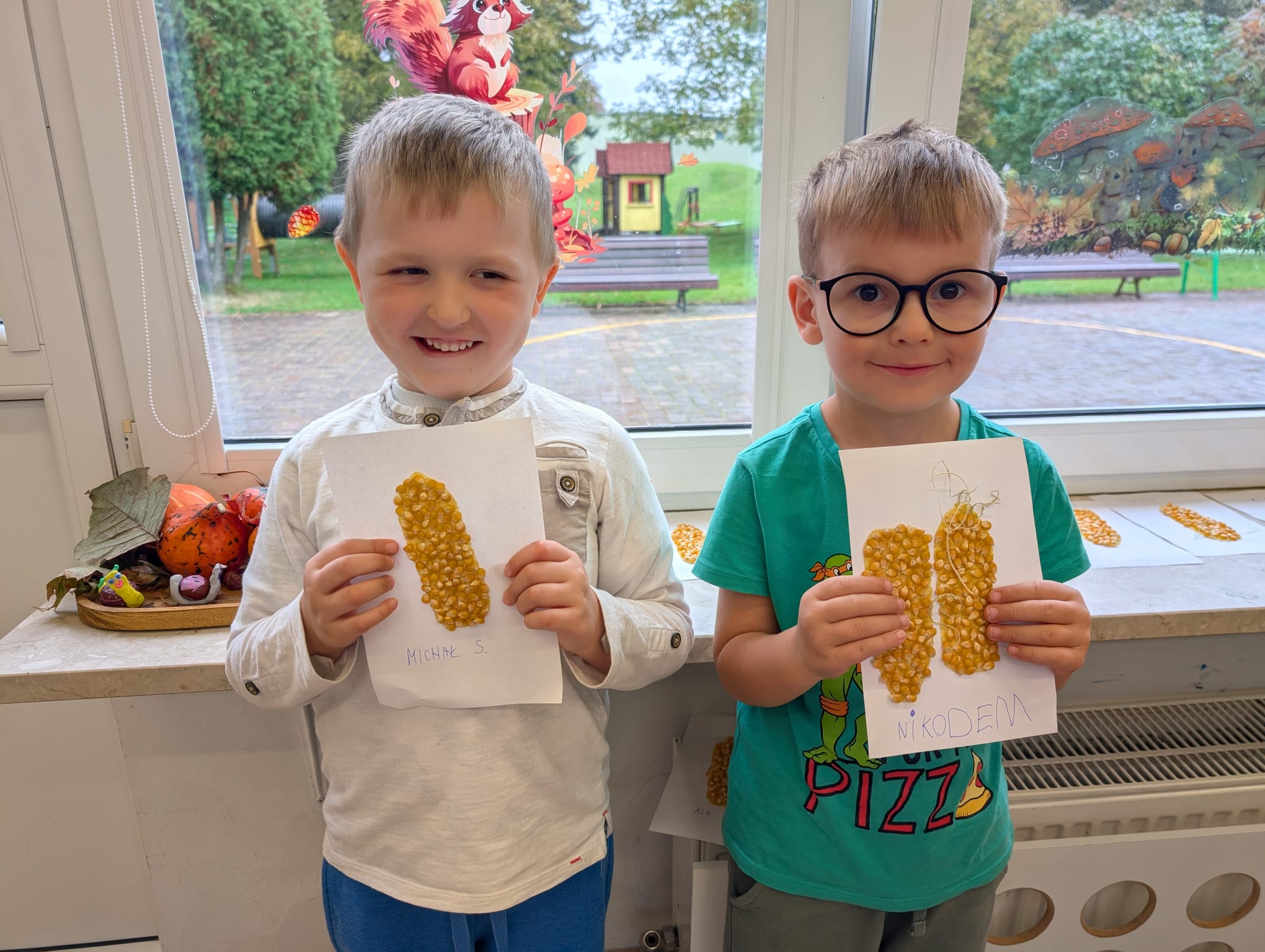W minionym tygodniu grupa Żabek miała wyjątkowe zajęcia dydaktyczne z Panią Asią, która odbywa praktyki w naszym przedszkolu. Bohaterką tego dnia była... kukurydza! Dzieci miały okazję poznać to warzywo wszystkimi zmysłami – dotykały, wąchały, oglądały, a także dzieliły się swoimi doświadczeniami z domowej kuchni i ogrodu. W części techniczno-sensorycznej przedszkolaki wykonały niezwykłą pracę plastyczną – wyklejały ziarenkami kukurydzy przygotowaną powierzchnię z naturalnym woskiem pszczelim. Przy tej okazji dowiedziały się, skąd pochodzi taki wosk i jak pracowite są pszczoły, by go wytworzyć! Dzieci z ogromną precyzją wypełniały każdą wolną przestrzeń, ćwicząc koncentrację, cierpliwość oraz motorykę małą i precyzyjną sprawność dłoni – tak ważną w przygotowaniu do nauki pisania. Na zakończenie zajęć czekała na Żabki niespodzianka – maszyna do popcornu! Dzieci z zaciekawieniem obserwowały proces prażenia ziaren, a potem z wielką radością degustowały świeżo przygotowany popcorn. Było pysznie, pachnąco i bardzo edukacyjnie! Takie zajęcia to nie tylko nauka, ale też radość odkrywania świata wszystkimi zmysłami!