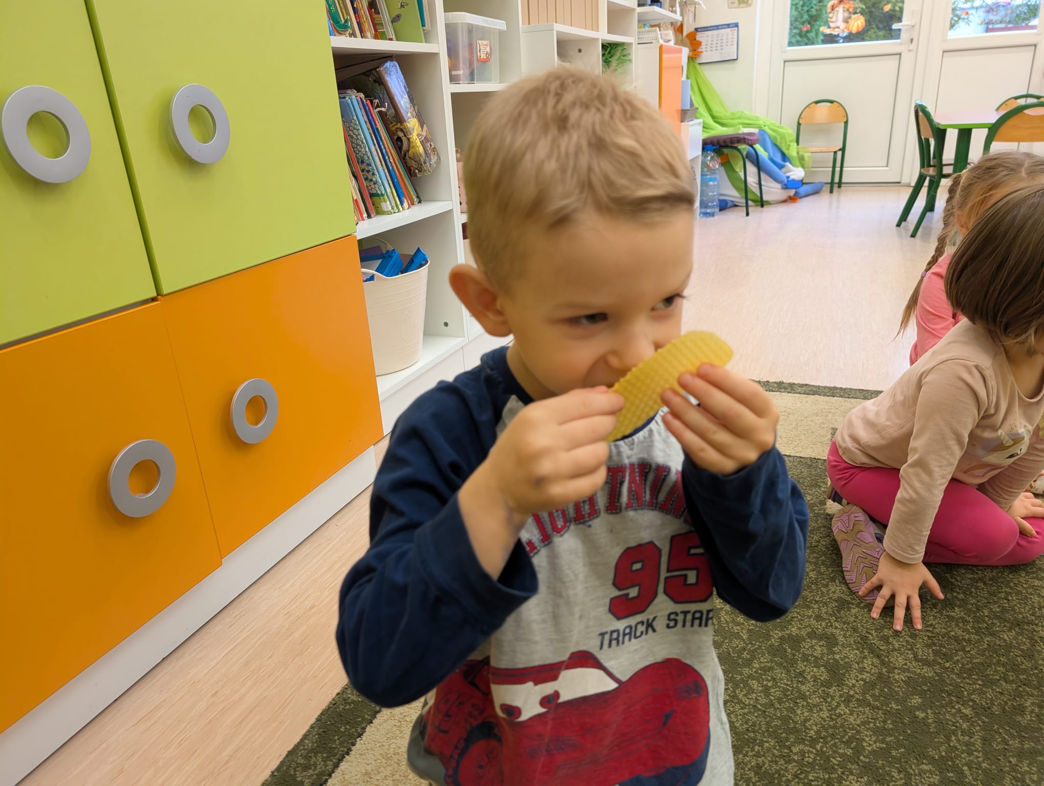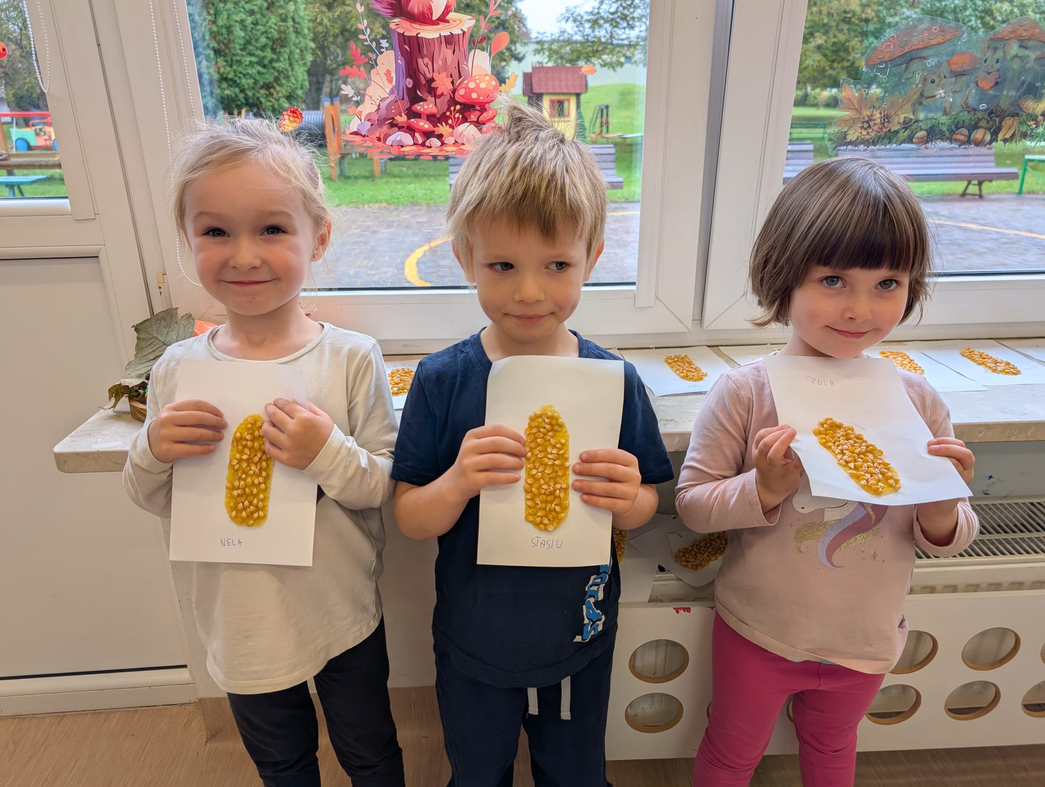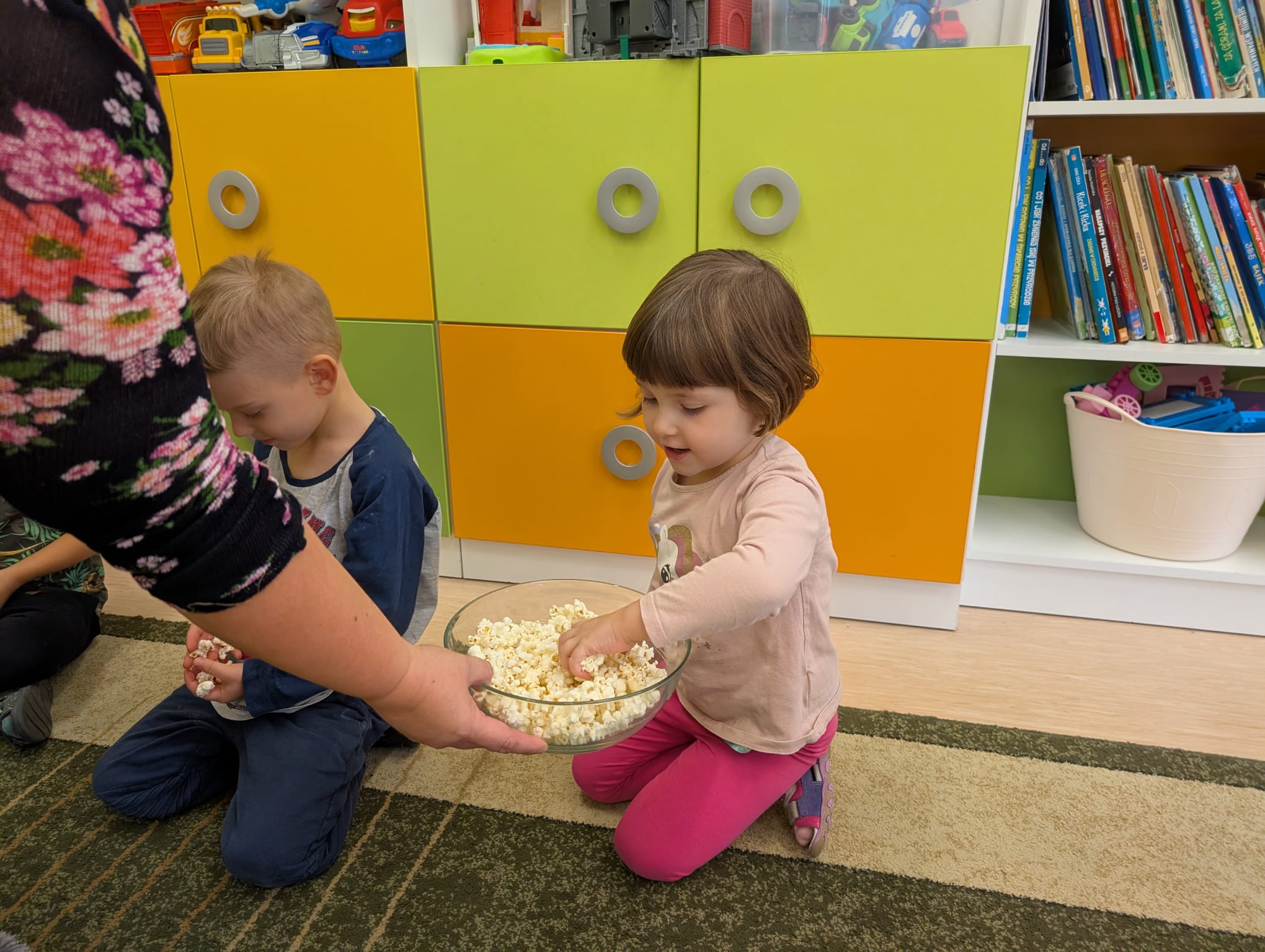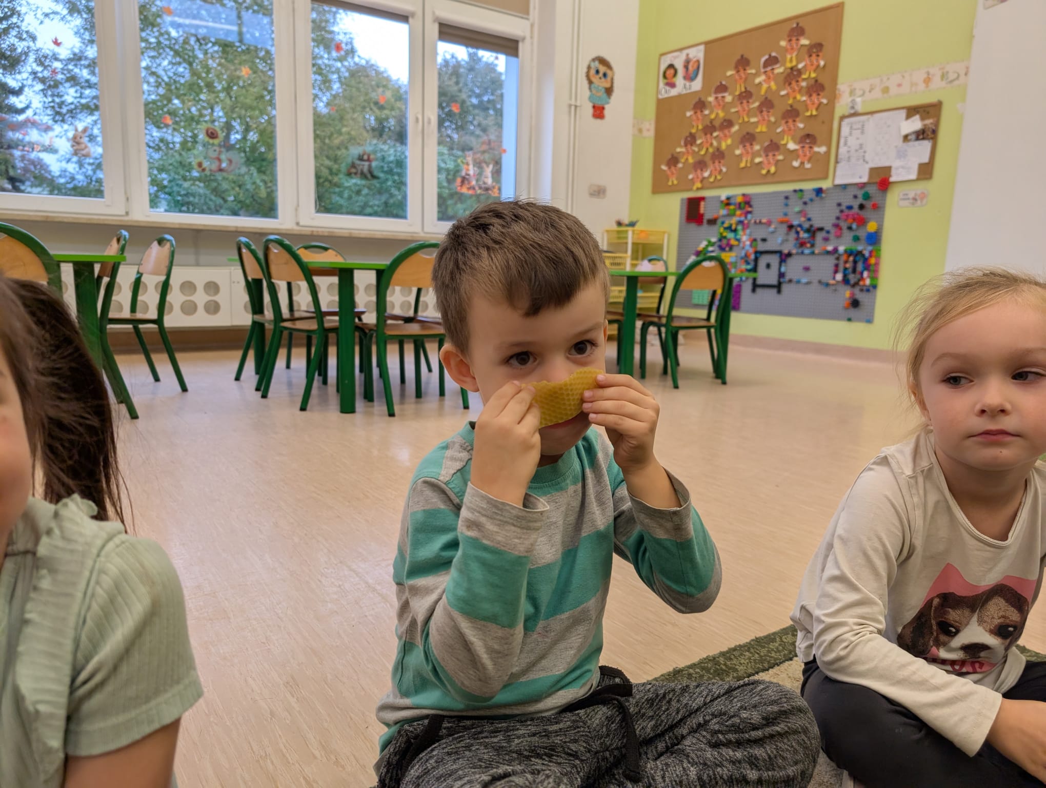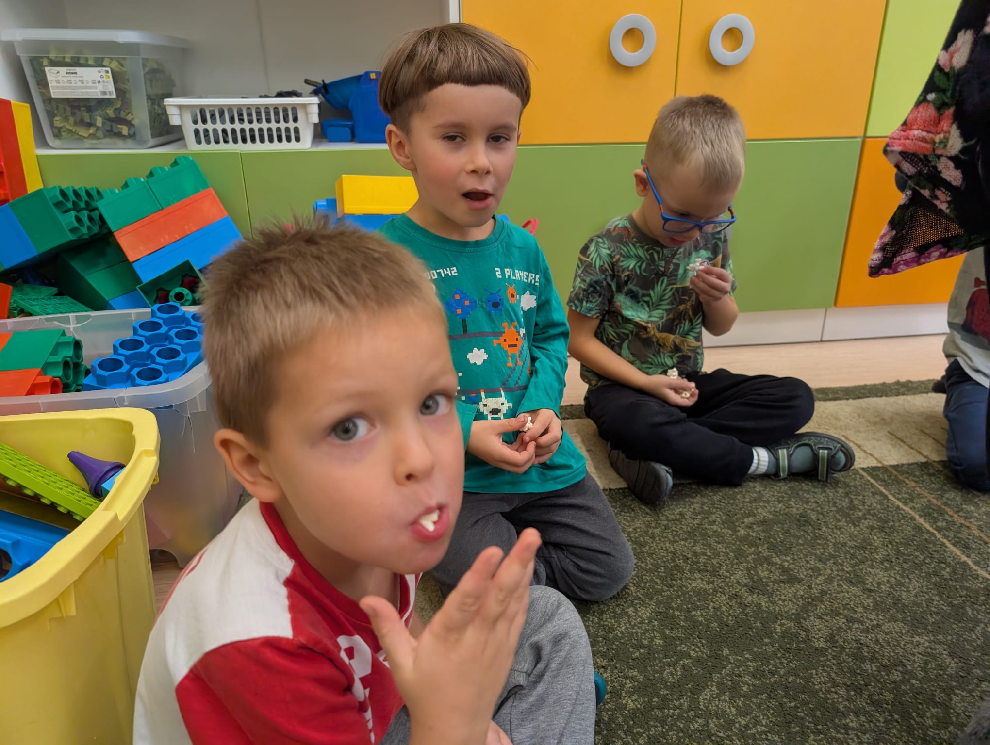 W minionym tygodniu grupa Żabek miała wyjątkowe zajęcia dydaktyczne z Panią Asią, która odbywa praktyki w naszym przedszkolu. Bohaterką tego dnia była... kukurydza! Dzieci miały okazję poznać to warzywo wszystkimi zmysłami – dotykały, wąchały, oglądały, a także dzieliły się swoimi doświadczeniami z domowej kuchni i ogrodu. W części techniczno-sensorycznej przedszkolaki wykonały niezwykłą pracę plastyczną – wyklejały ziarenkami kukurydzy przygotowaną powierzchnię z naturalnym woskiem pszczelim. Przy tej okazji dowiedziały się, skąd pochodzi taki wosk i jak pracowite są pszczoły, by go wytworzyć! Dzieci z ogromną precyzją wypełniały każdą wolną przestrzeń, ćwicząc koncentrację, cierpliwość oraz motorykę małą i precyzyjną sprawność dłoni – tak ważną w przygotowaniu do nauki pisania. Na zakończenie zajęć czekała na Żabki niespodzianka – maszyna do popcornu! Dzieci z zaciekawieniem obserwowały proces prażenia ziaren, a potem z wielką radością degustowały świeżo przygotowany popcorn. Było pysznie, pachnąco i bardzo edukacyjnie! Takie zajęcia to nie tylko nauka, ale też radość odkrywania świata wszystkimi zmysłami!