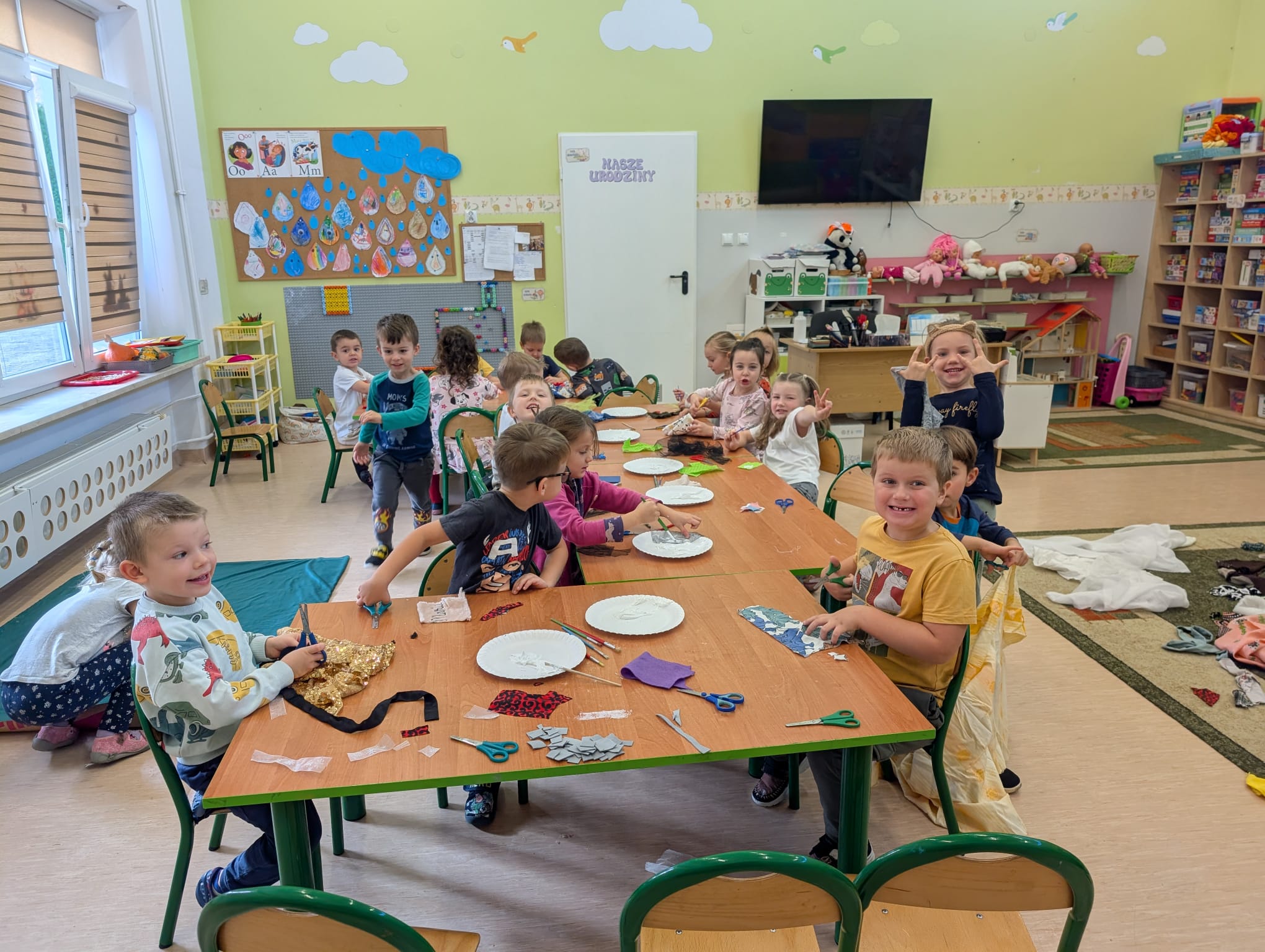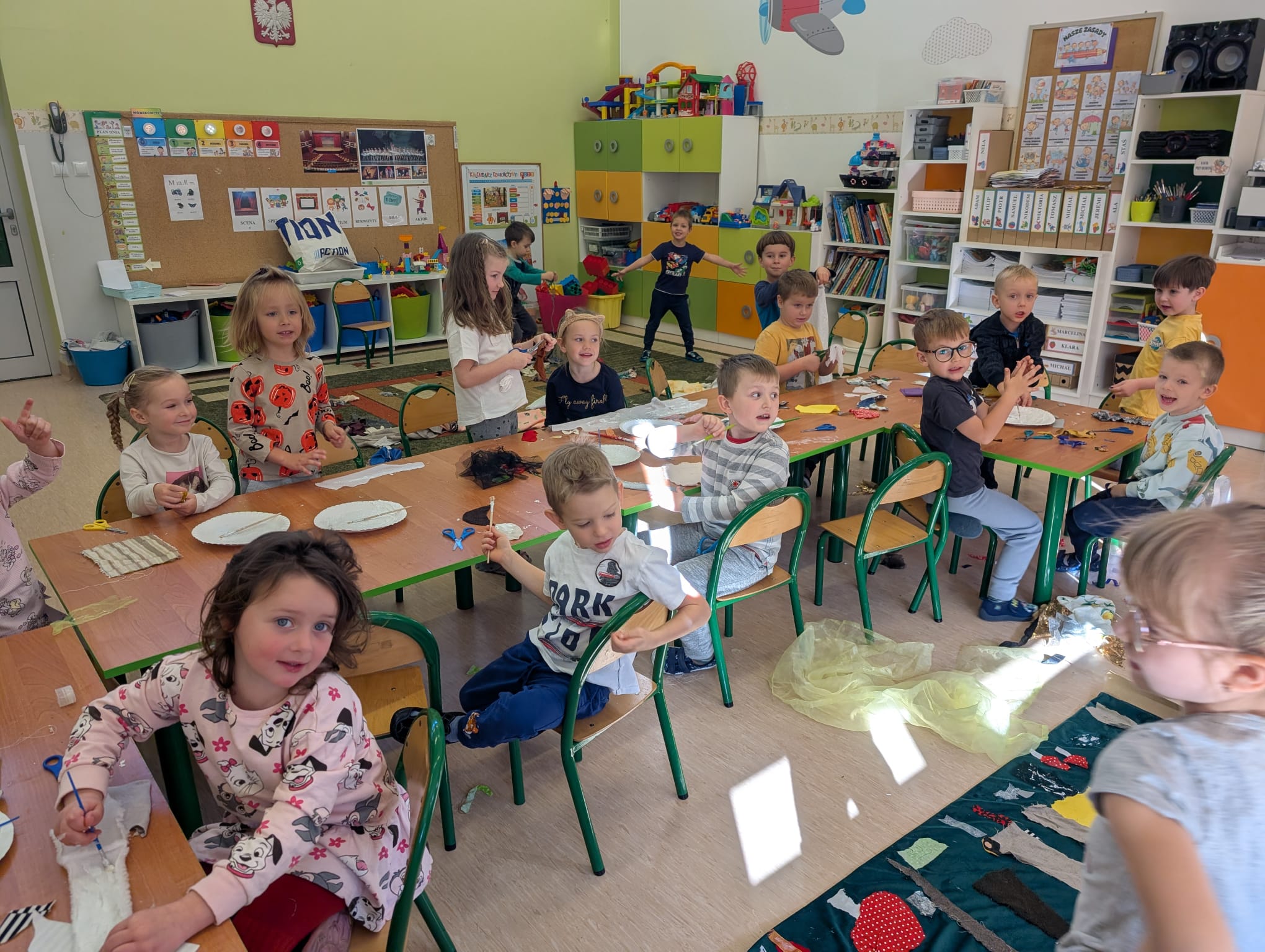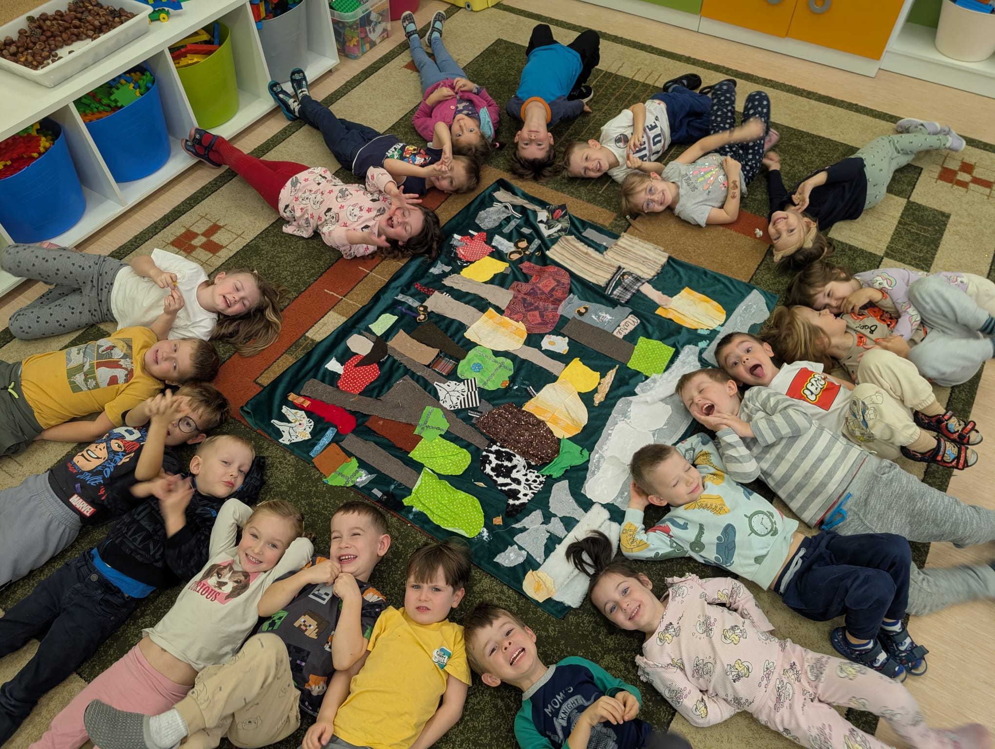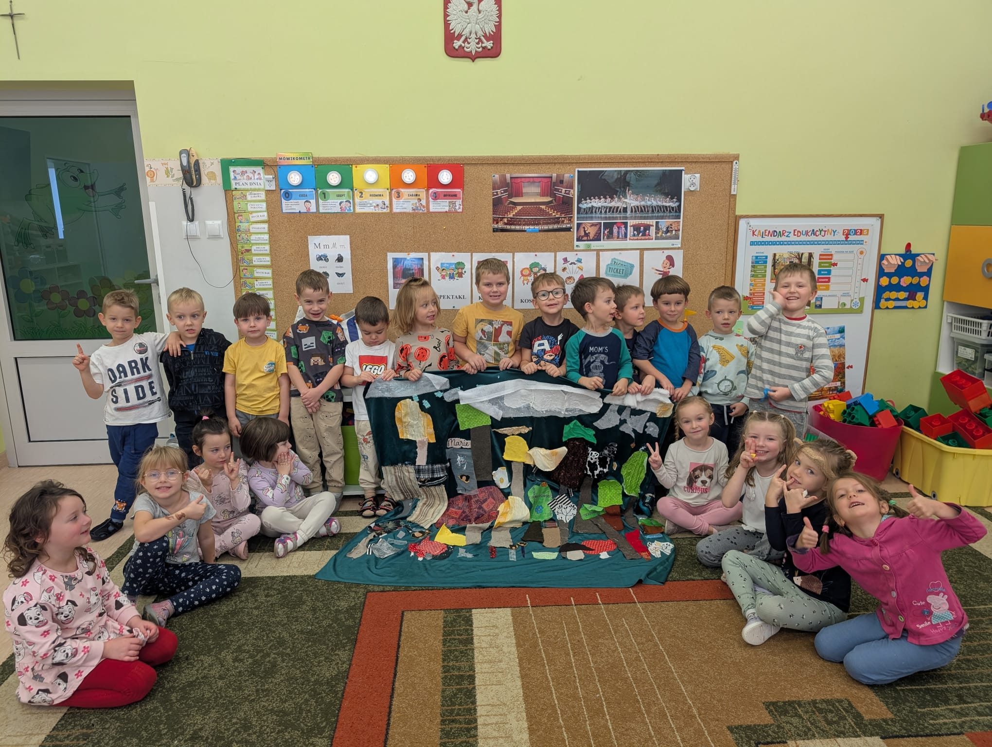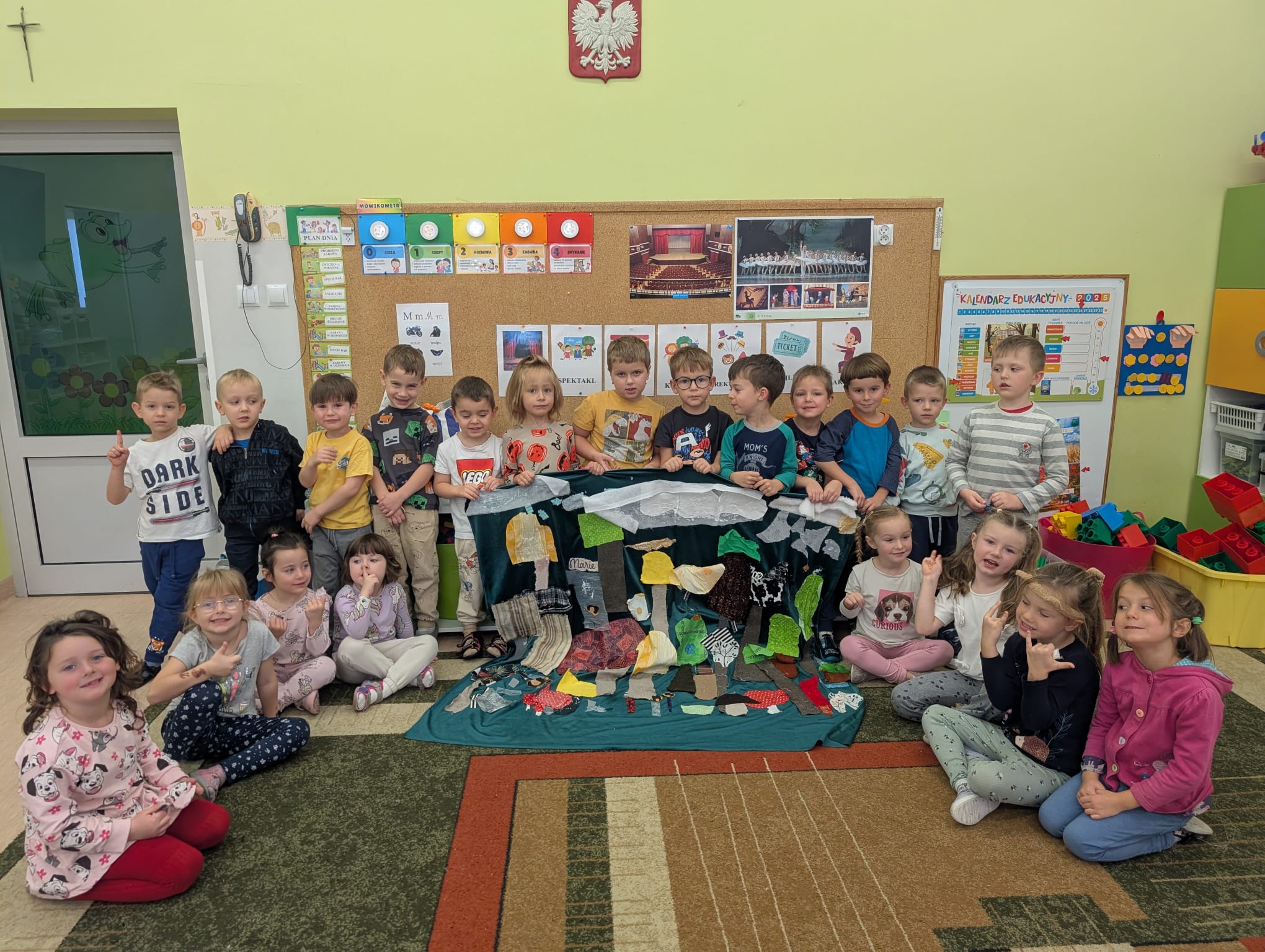 W minionym tygodniu grupa Żabek zamieniła się w prawdziwych artystów scenicznych! Podczas zajęć kreatywności i twórczości, dzieci zgłębiały tajniki teatru w ramach tematu kompleksowego. I nie, nie chodziło tylko o siedzenie w fotelach i oglądanie spektaklu — nasze przedszkolaki dowiedziały się, jak powstaje przedstawienie teatralne od kulis! Poznały: • kto pracuje w teatrze (aktorzy, reżyserzy, scenografowie, itd.) • jak rodzi się pomysł na spektakl, • co to jest scenariusz i dlaczego nie można go zgubić, • oraz jak powstaje scenografia, czyli magiczna przestrzeń, która przenosi widzów w inny świat! Uzbrojone w tę wiedzę, Żabki ruszyły do działania! Z różnorodnych materiałów – kawałków tkanin, stworzyły scenografię jesiennego lasu. Pojawiły się pnie drzew, a z nich wyrosły bajecznie kolorowe korony, które wyglądały jakby właśnie spadły z jesiennego nieba! Tuż obok wyrosły grzybki z miękkimi łebkami, a całość otuliła miękka, szeleszcząca ściółka z materiałowych mchów. Dzieci z zapałem cięły, układały, przyklejały i komponowały — jak prawdziwi mistrzowie scenografii! Każdy skrawek materiału zamieniał się w coś magicznego, a wyobraźnia pracowała na najwyższych obrotach. Podczas pracy dzieci: • ćwiczyły motorykę małą (cięcie, klejenie, układanie), • rozwijały wyobraźnię przestrzenną, • uczyły się współpracy i planowania, • oraz wzmacniały poczucie sprawczości – bo przecież to one stworzyły cały las! Zajęcia były nie tylko twórcze, ale też pełne radości, śmiechu i teatralnych emocji. A kto wie… może wśród naszych Żabek rośnie przyszły scenograf Narodowego Teatru?