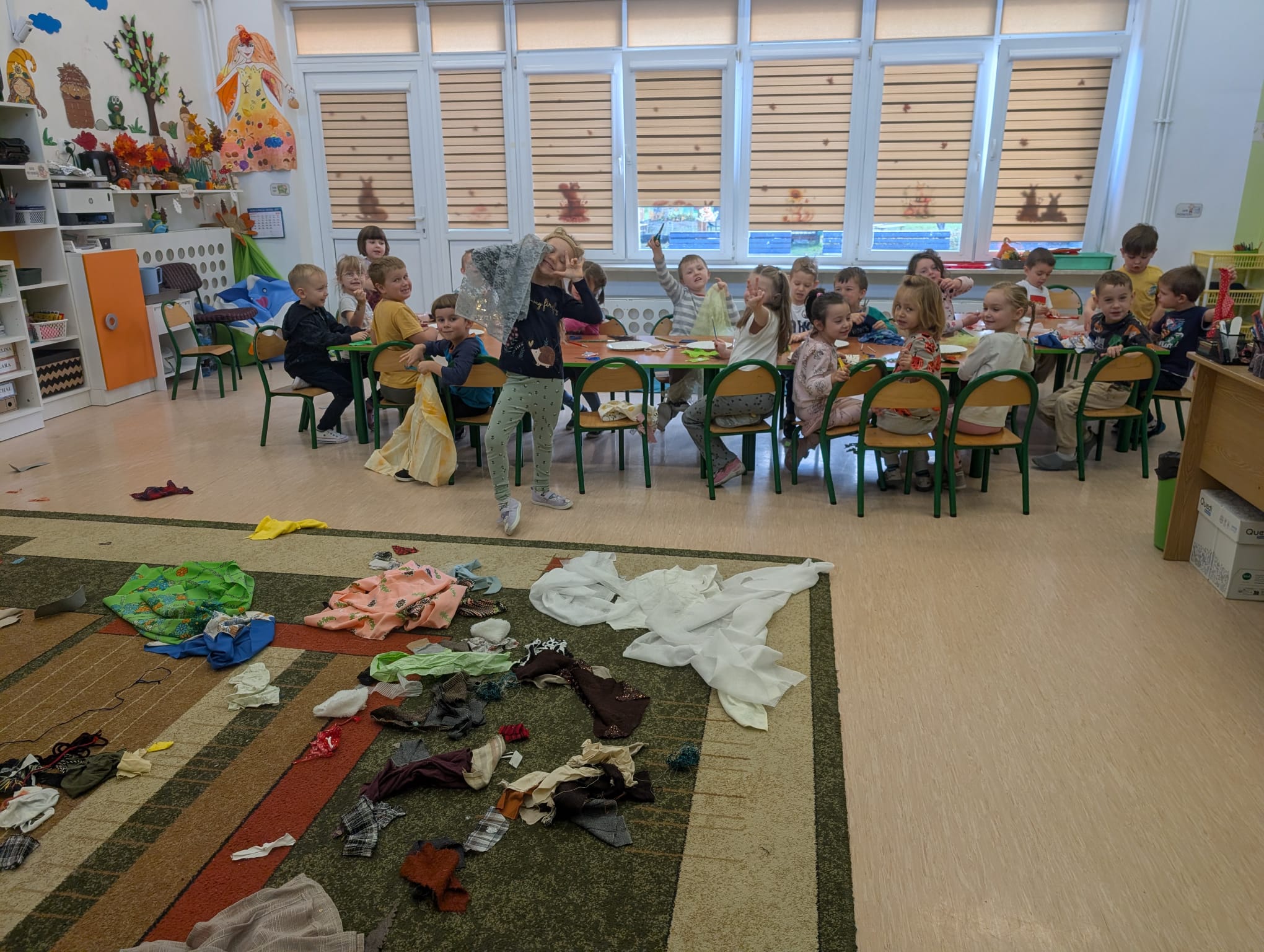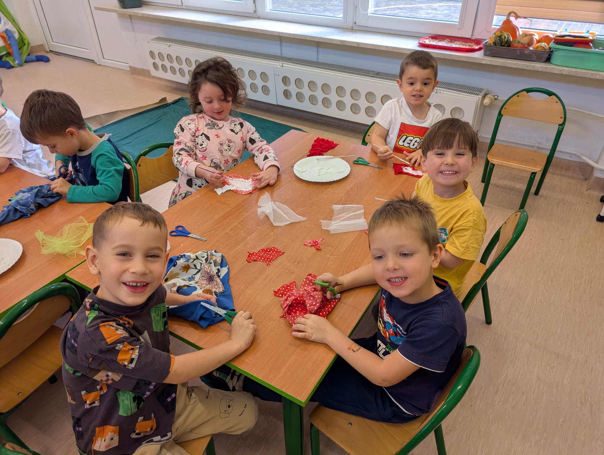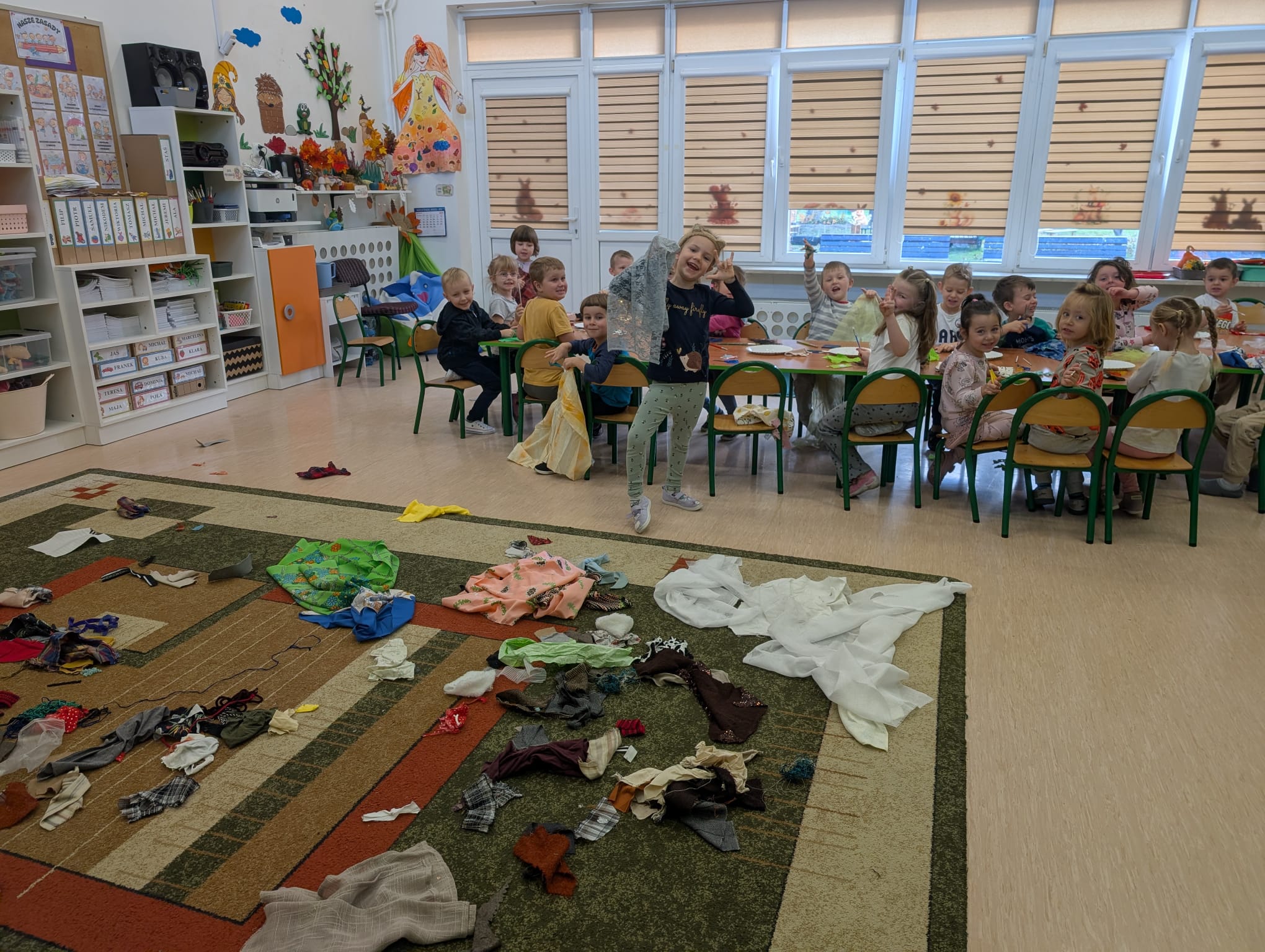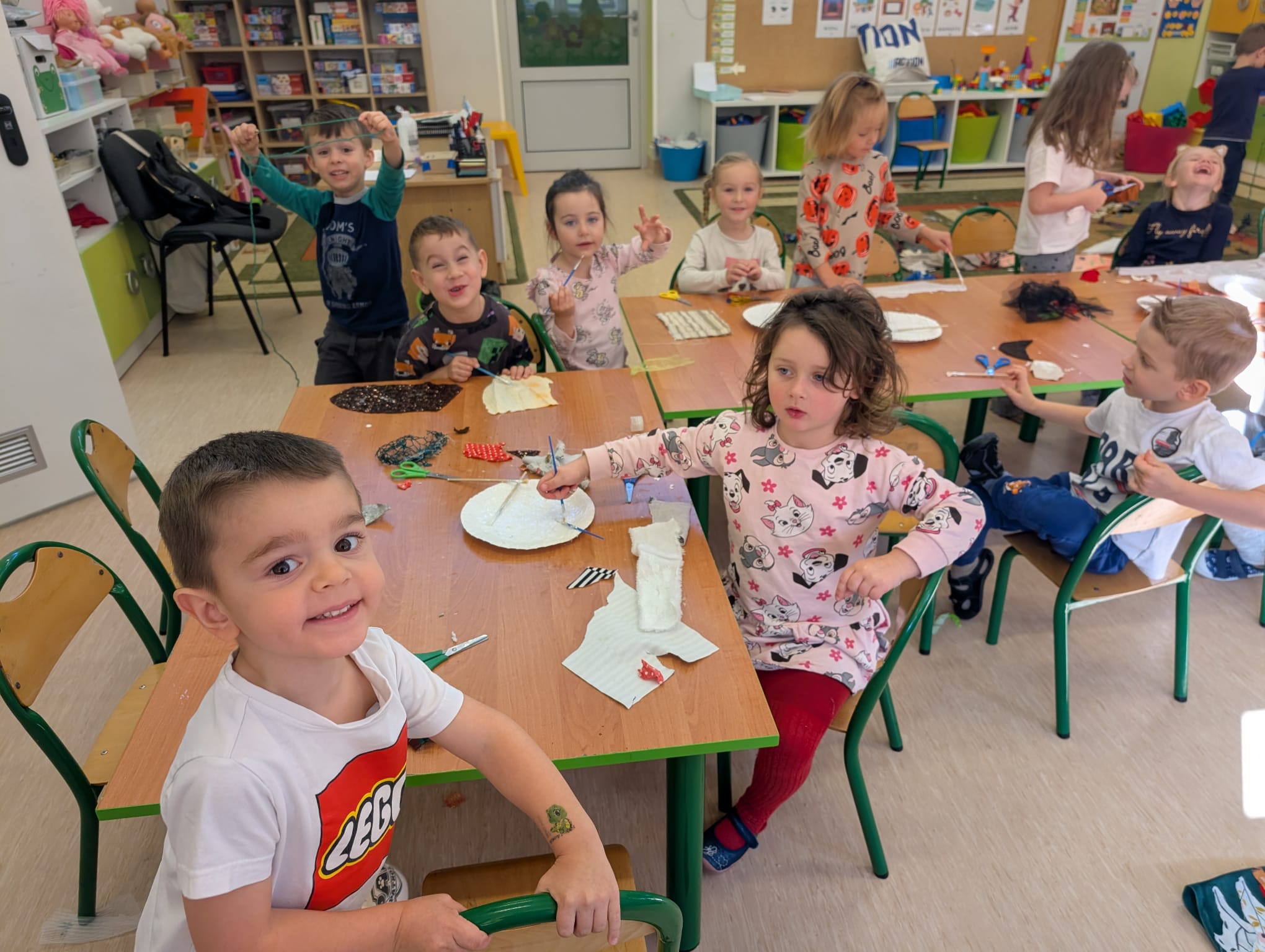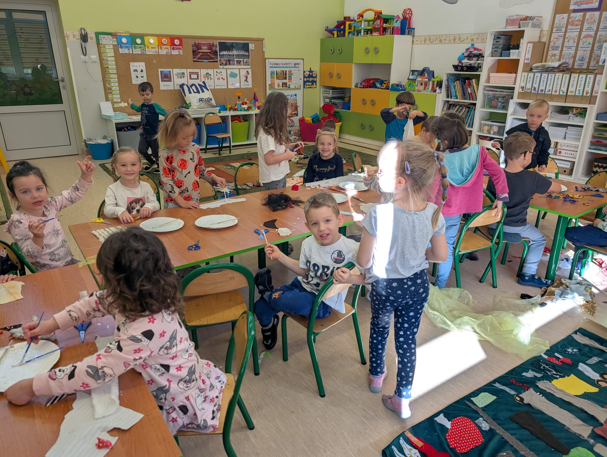 W minionym tygodniu grupa Żabek zamieniła się w prawdziwych artystów scenicznych! Podczas zajęć kreatywności i twórczości, dzieci zgłębiały tajniki teatru w ramach tematu kompleksowego. I nie, nie chodziło tylko o siedzenie w fotelach i oglądanie spektaklu — nasze przedszkolaki dowiedziały się, jak powstaje przedstawienie teatralne od kulis! Poznały: • kto pracuje w teatrze (aktorzy, reżyserzy, scenografowie, itd.) • jak rodzi się pomysł na spektakl, • co to jest scenariusz i dlaczego nie można go zgubić, • oraz jak powstaje scenografia, czyli magiczna przestrzeń, która przenosi widzów w inny świat! Uzbrojone w tę wiedzę, Żabki ruszyły do działania! Z różnorodnych materiałów – kawałków tkanin, stworzyły scenografię jesiennego lasu. Pojawiły się pnie drzew, a z nich wyrosły bajecznie kolorowe korony, które wyglądały jakby właśnie spadły z jesiennego nieba! Tuż obok wyrosły grzybki z miękkimi łebkami, a całość otuliła miękka, szeleszcząca ściółka z materiałowych mchów. Dzieci z zapałem cięły, układały, przyklejały i komponowały — jak prawdziwi mistrzowie scenografii! Każdy skrawek materiału zamieniał się w coś magicznego, a wyobraźnia pracowała na najwyższych obrotach. Podczas pracy dzieci: • ćwiczyły motorykę małą (cięcie, klejenie, układanie), • rozwijały wyobraźnię przestrzenną, • uczyły się współpracy i planowania, • oraz wzmacniały poczucie sprawczości – bo przecież to one stworzyły cały las! Zajęcia były nie tylko twórcze, ale też pełne radości, śmiechu i teatralnych emocji. A kto wie… może wśród naszych Żabek rośnie przyszły scenograf Narodowego Teatru?