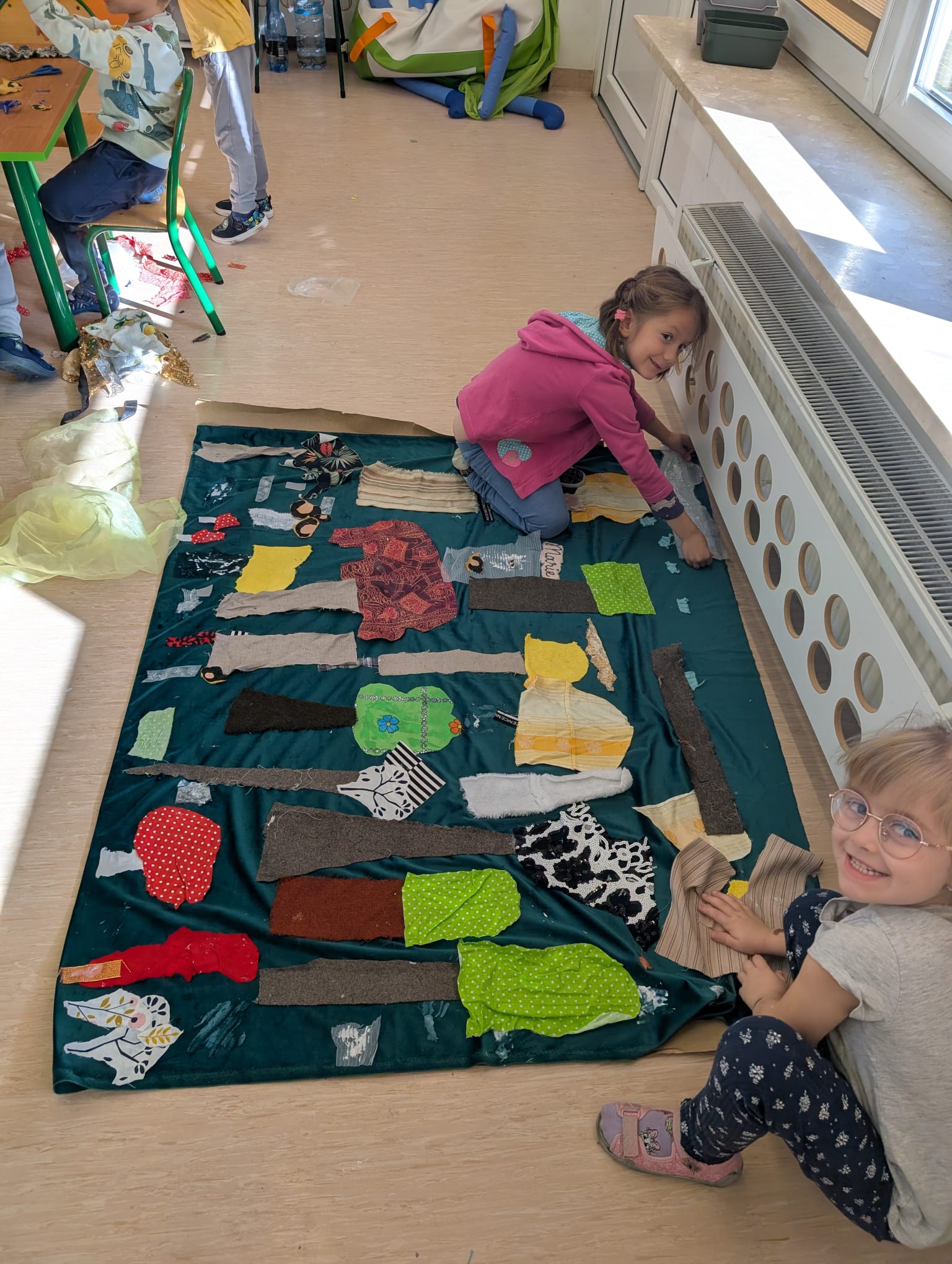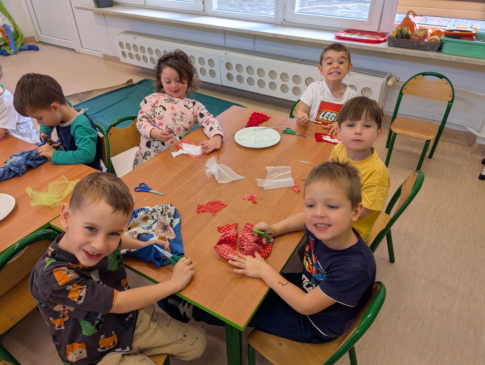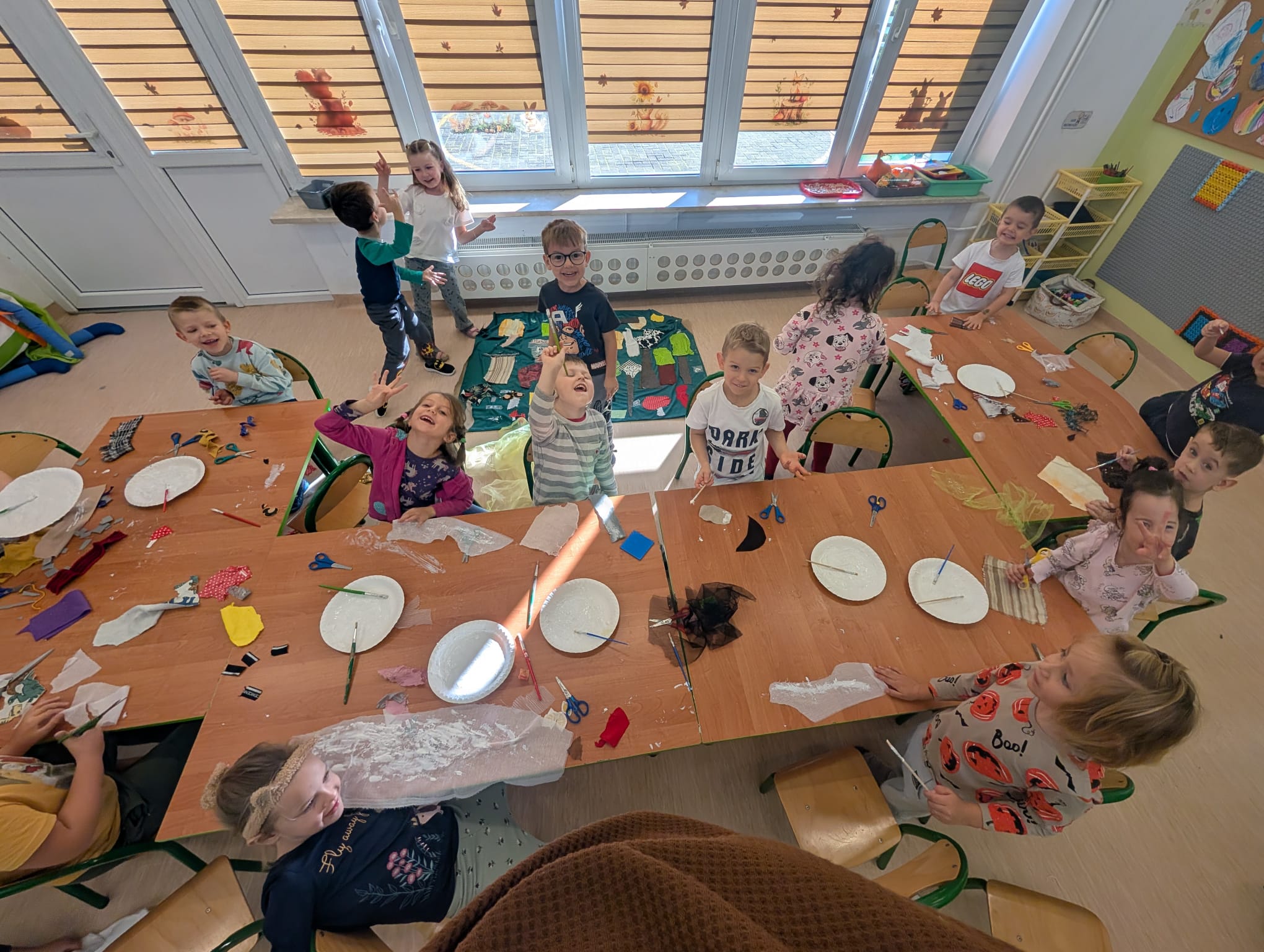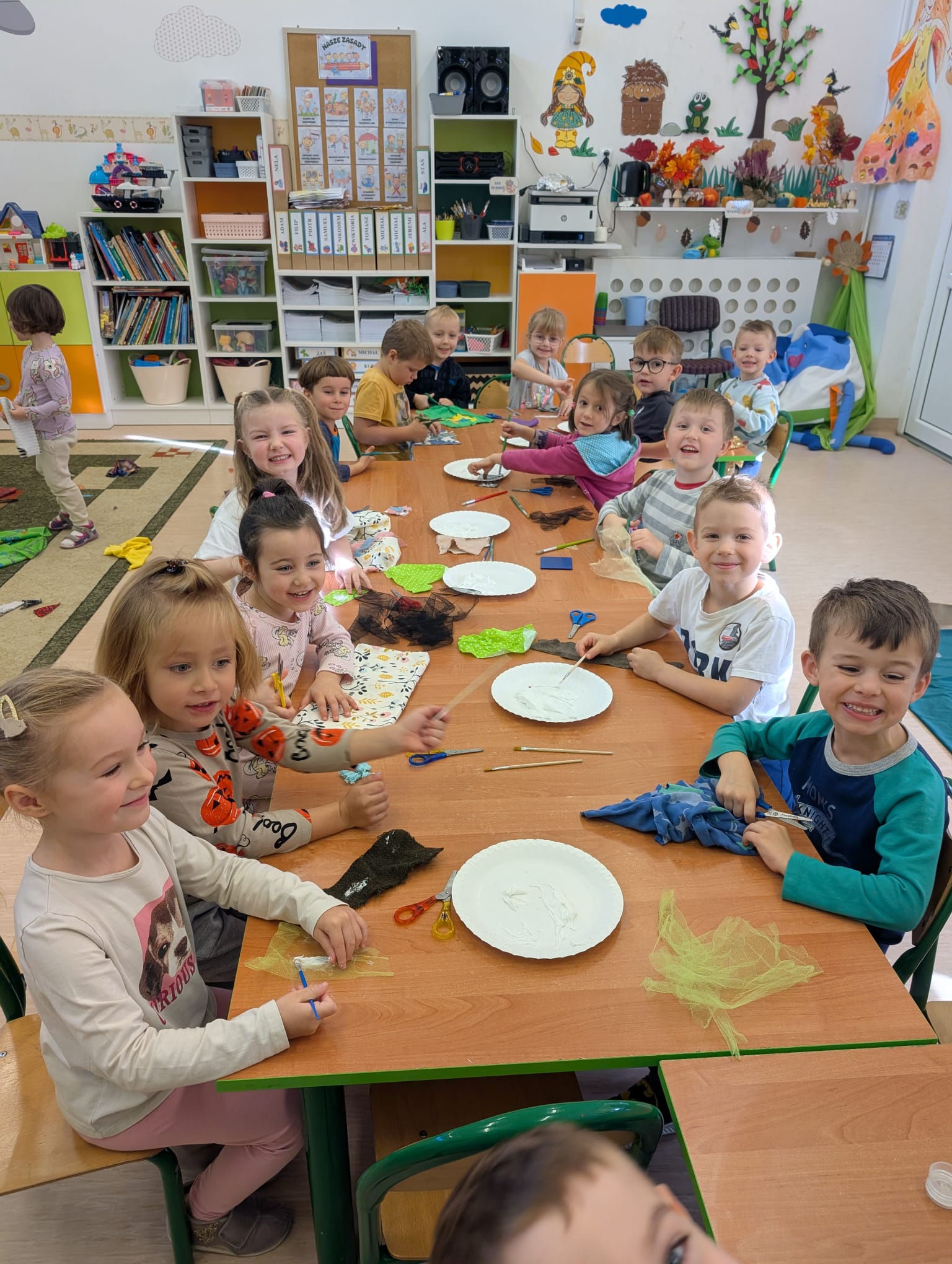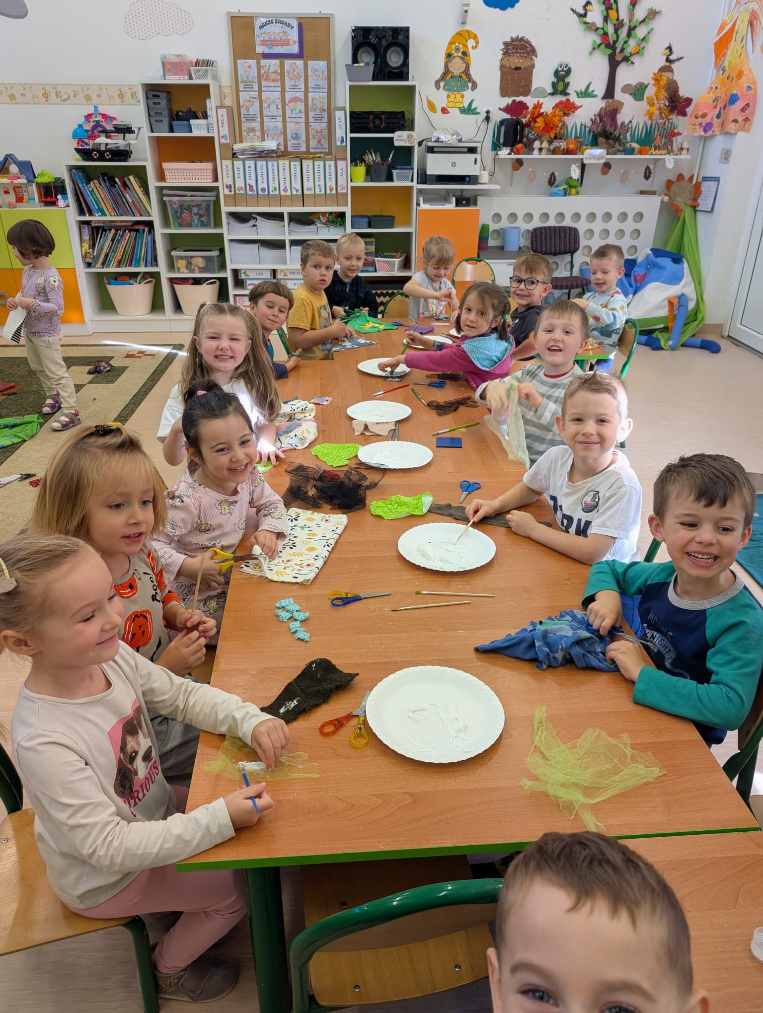 W minionym tygodniu grupa Żabek zamieniła się w prawdziwych artystów scenicznych! Podczas zajęć kreatywności i twórczości, dzieci zgłębiały tajniki teatru w ramach tematu kompleksowego. I nie, nie chodziło tylko o siedzenie w fotelach i oglądanie spektaklu — nasze przedszkolaki dowiedziały się, jak powstaje przedstawienie teatralne od kulis! Poznały: • kto pracuje w teatrze (aktorzy, reżyserzy, scenografowie, itd.) • jak rodzi się pomysł na spektakl, • co to jest scenariusz i dlaczego nie można go zgubić, • oraz jak powstaje scenografia, czyli magiczna przestrzeń, która przenosi widzów w inny świat! Uzbrojone w tę wiedzę, Żabki ruszyły do działania! Z różnorodnych materiałów – kawałków tkanin, stworzyły scenografię jesiennego lasu. Pojawiły się pnie drzew, a z nich wyrosły bajecznie kolorowe korony, które wyglądały jakby właśnie spadły z jesiennego nieba! Tuż obok wyrosły grzybki z miękkimi łebkami, a całość otuliła miękka, szeleszcząca ściółka z materiałowych mchów. Dzieci z zapałem cięły, układały, przyklejały i komponowały — jak prawdziwi mistrzowie scenografii! Każdy skrawek materiału zamieniał się w coś magicznego, a wyobraźnia pracowała na najwyższych obrotach. Podczas pracy dzieci: • ćwiczyły motorykę małą (cięcie, klejenie, układanie), • rozwijały wyobraźnię przestrzenną, • uczyły się współpracy i planowania, • oraz wzmacniały poczucie sprawczości – bo przecież to one stworzyły cały las! Zajęcia były nie tylko twórcze, ale też pełne radości, śmiechu i teatralnych emocji. A kto wie… może wśród naszych Żabek rośnie przyszły scenograf Narodowego Teatru?